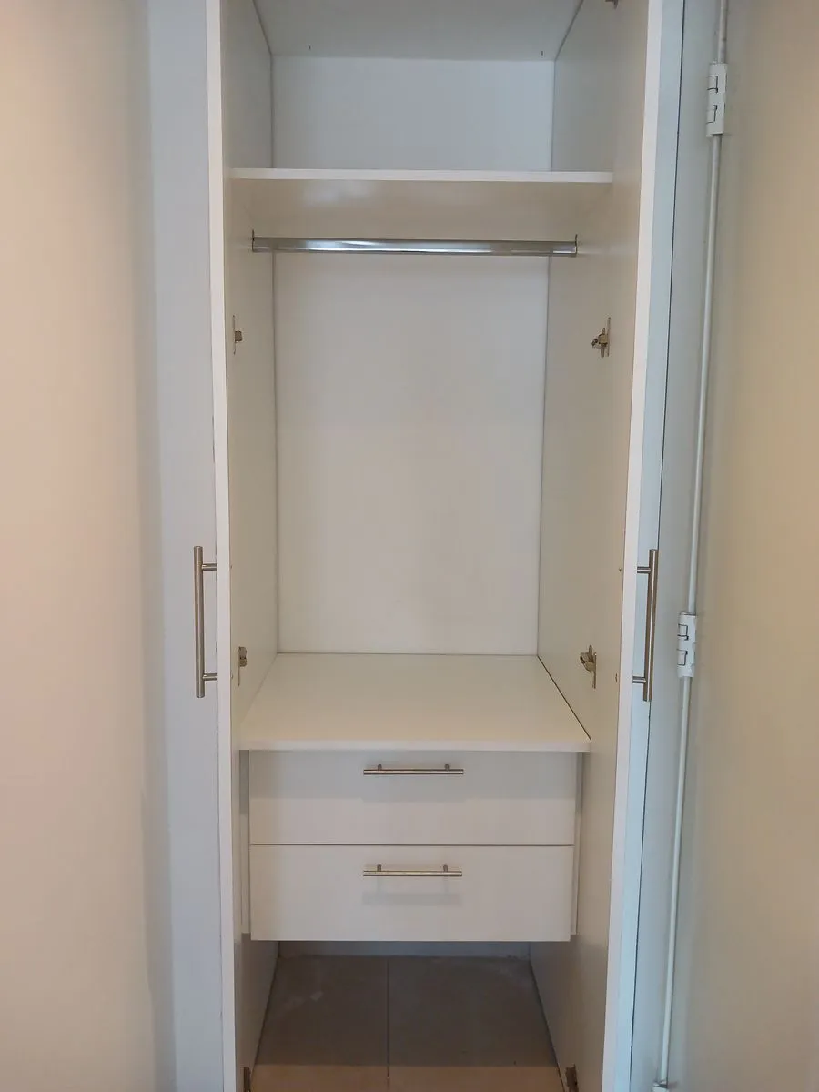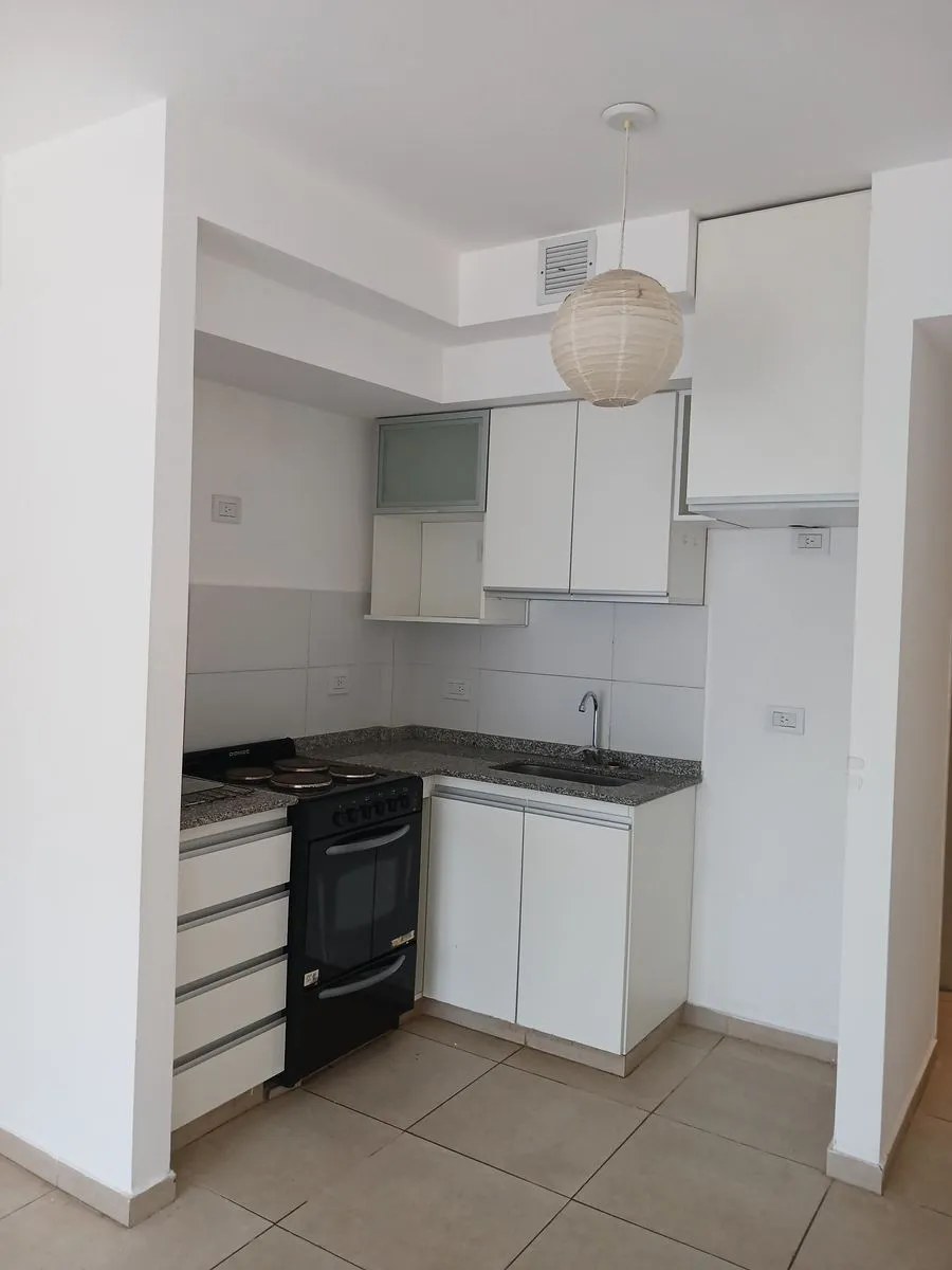 Kitnet de um único ambiente com planta divisível, banheiro completo e cozinha com armários baixos e nichos. A cozinha tem fogão elétrico e termotanque elétrico. Há varanda.