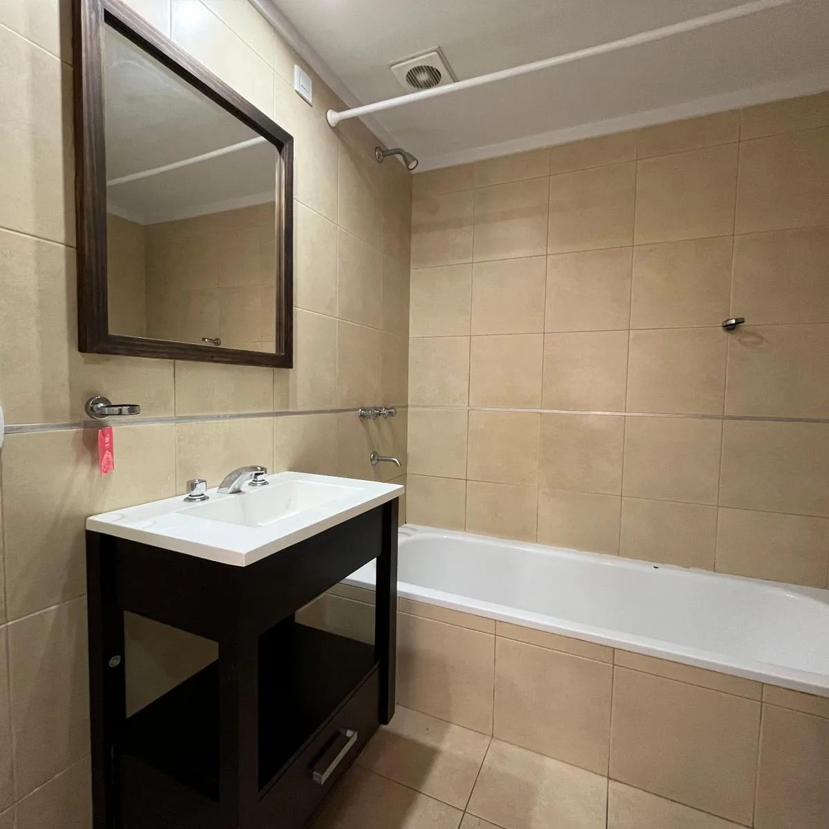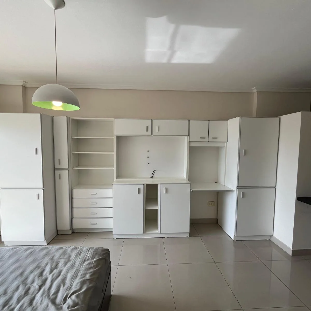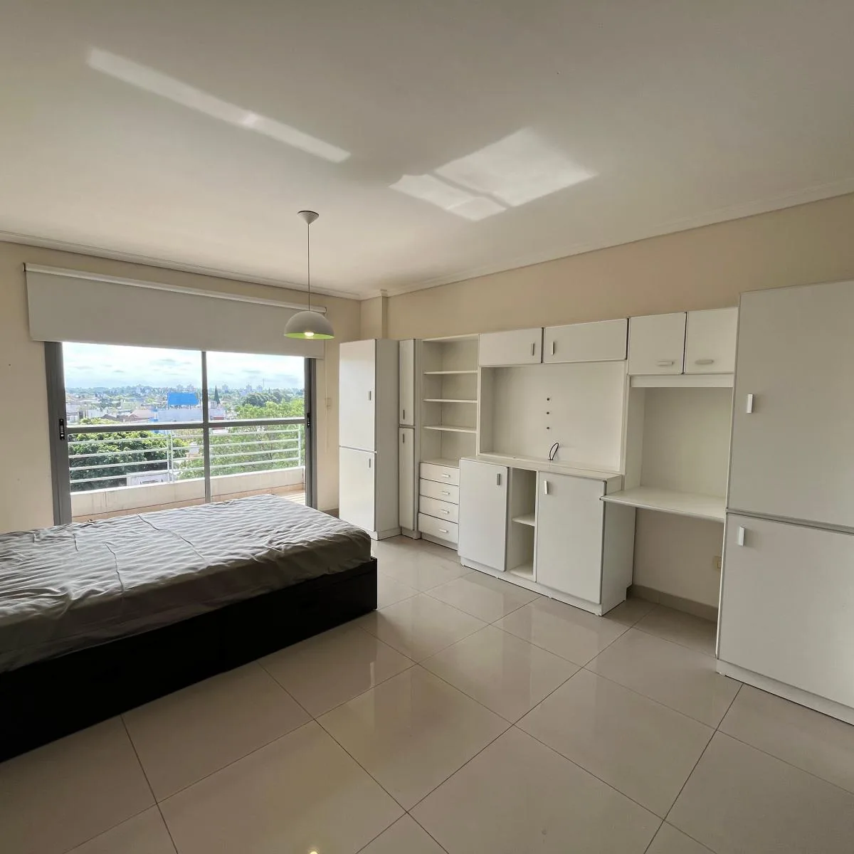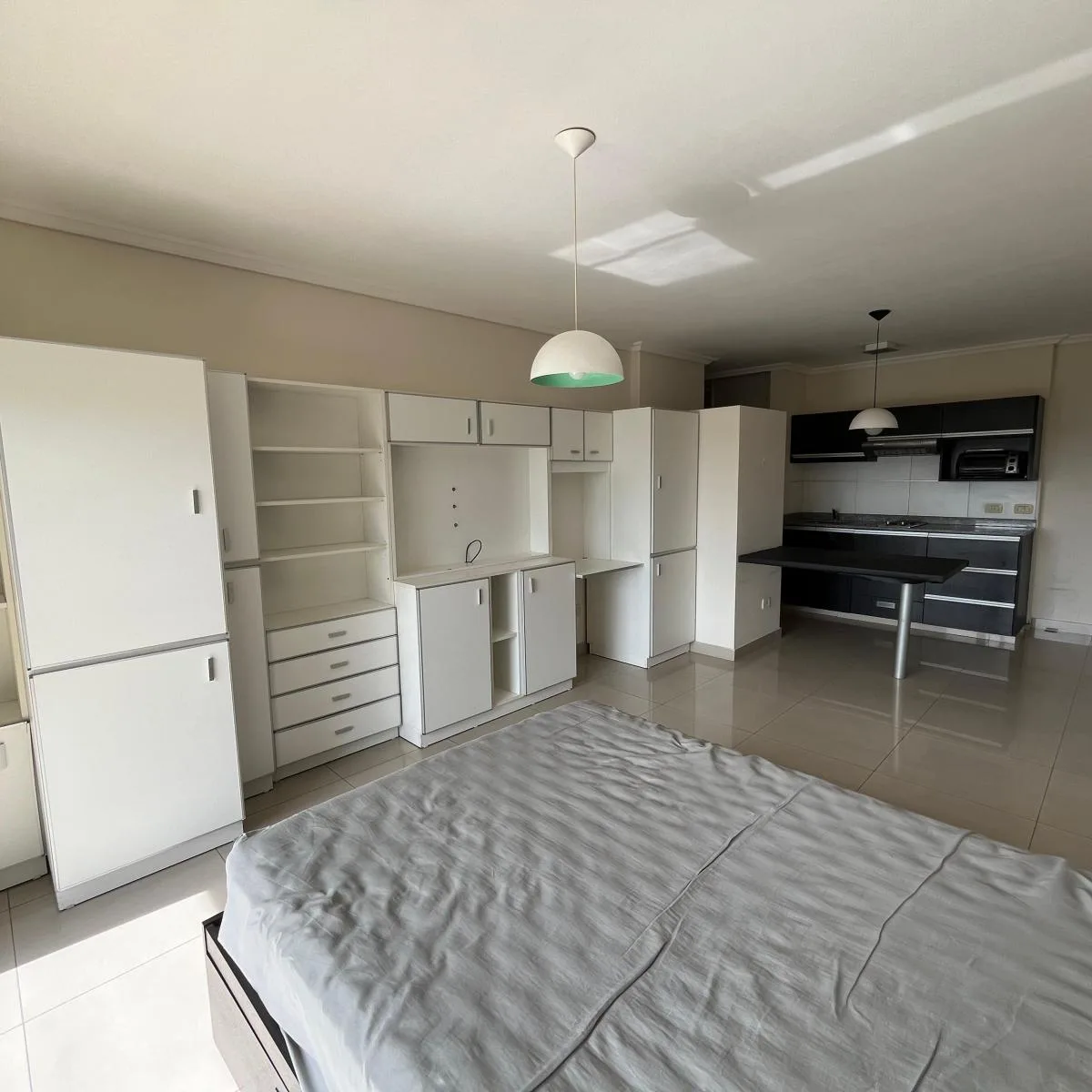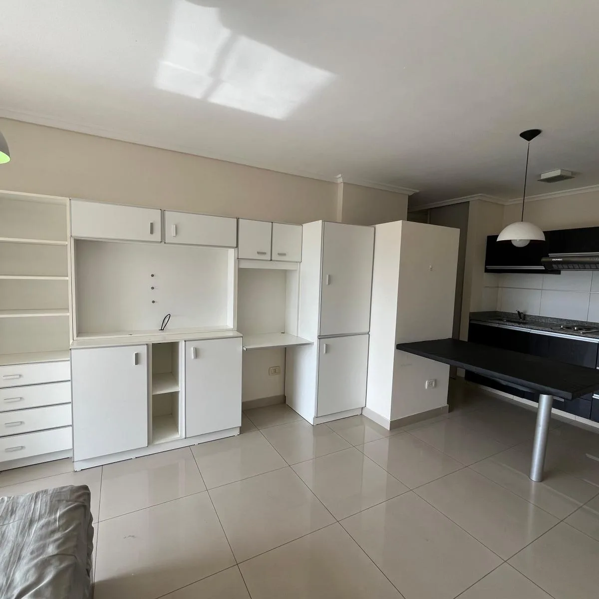 Kitnet de 32 m² cobertos e 36 m² totais, de fundos (contrafrente), com 1 ambiente e 1 banheiro. Cozinha e living com área de jantar, com ar-condicionado, caldeira e varanda. O prédio tem 8 andares, 5 unidades por andar, elevador com acesso para pessoas com mobilidade reduzida, academia, laundry, área de churrasco, piscina e salão de festas, além de encarregado e vigilância.