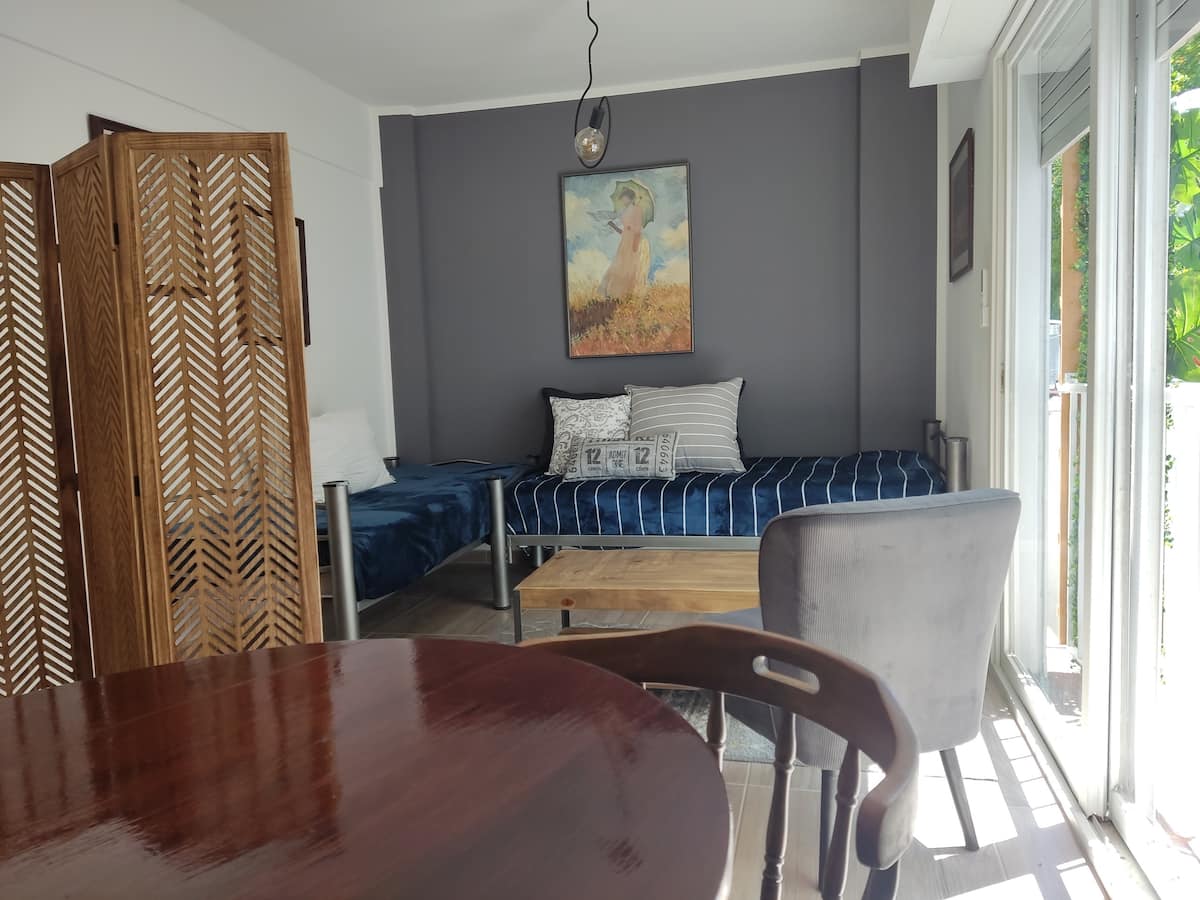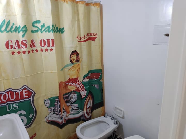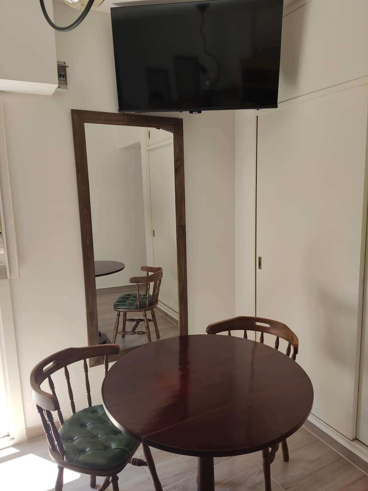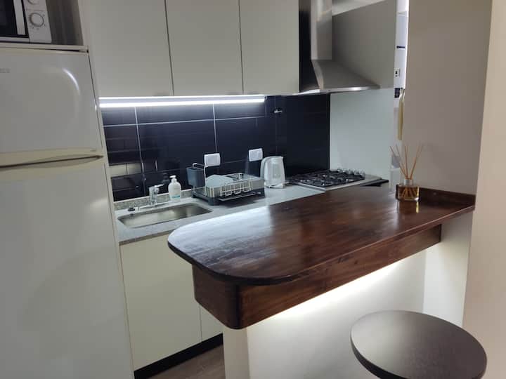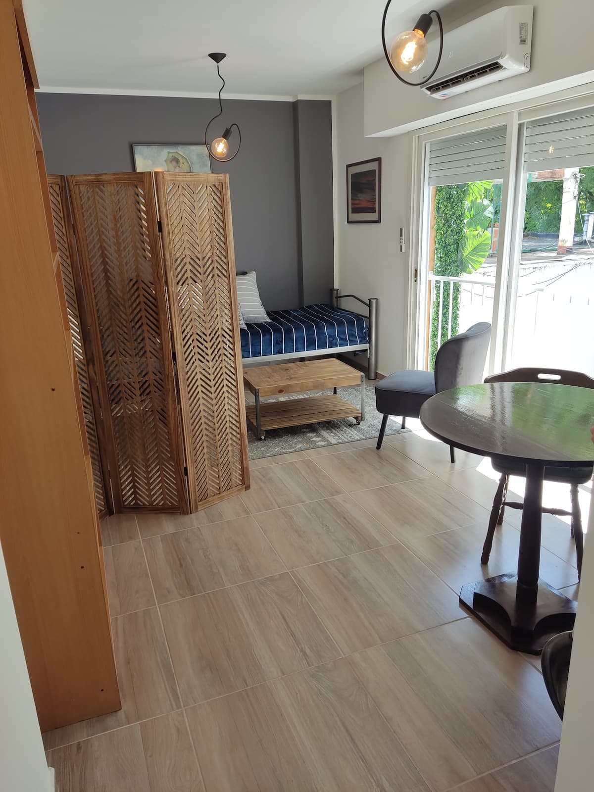 Kitnet (monoambiente) em Olivos, com espaços setorizados. Texto indica que o imóvel foi montado de forma nova.