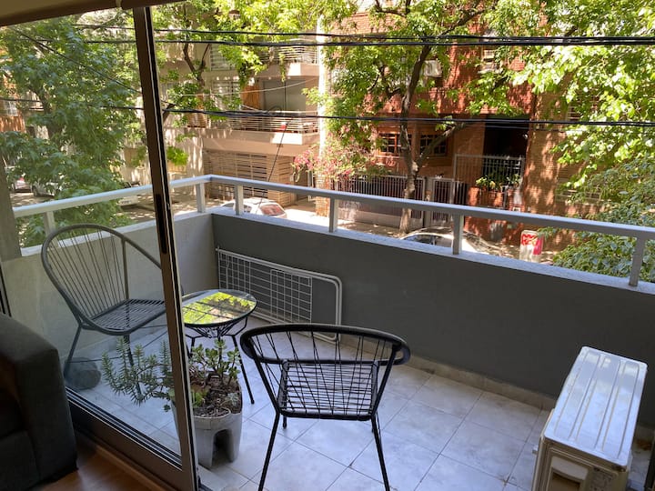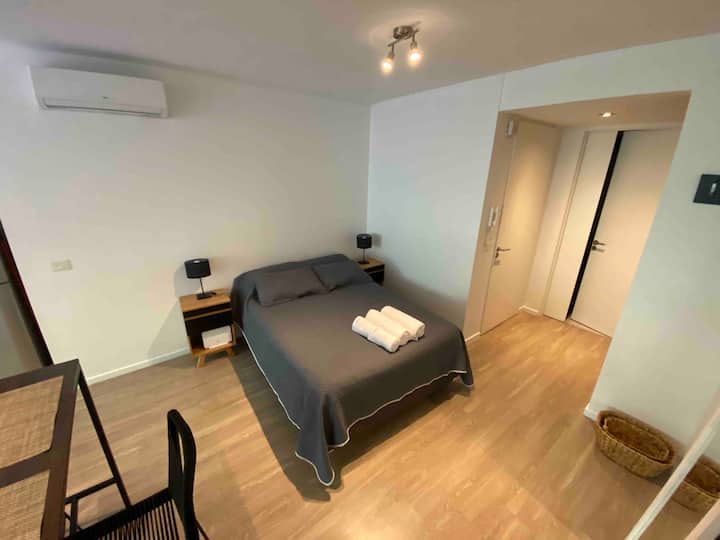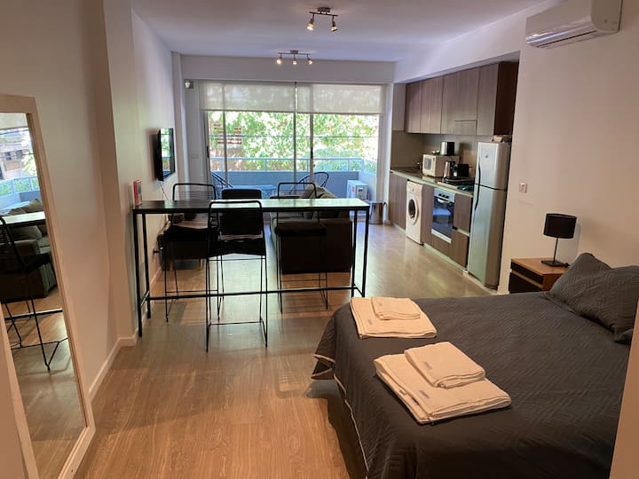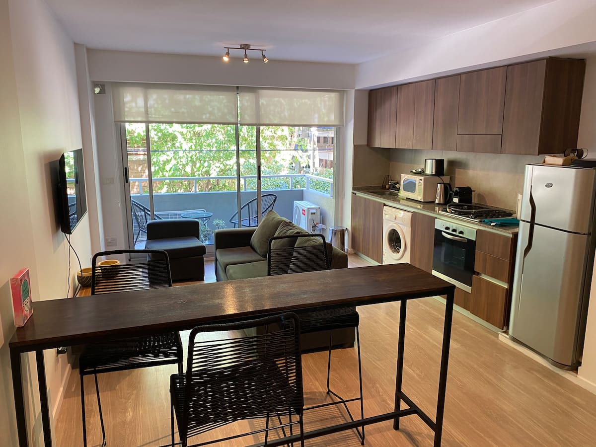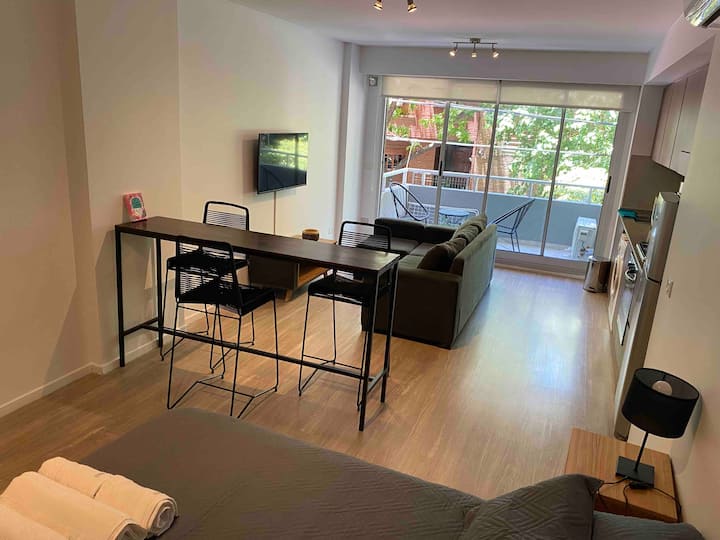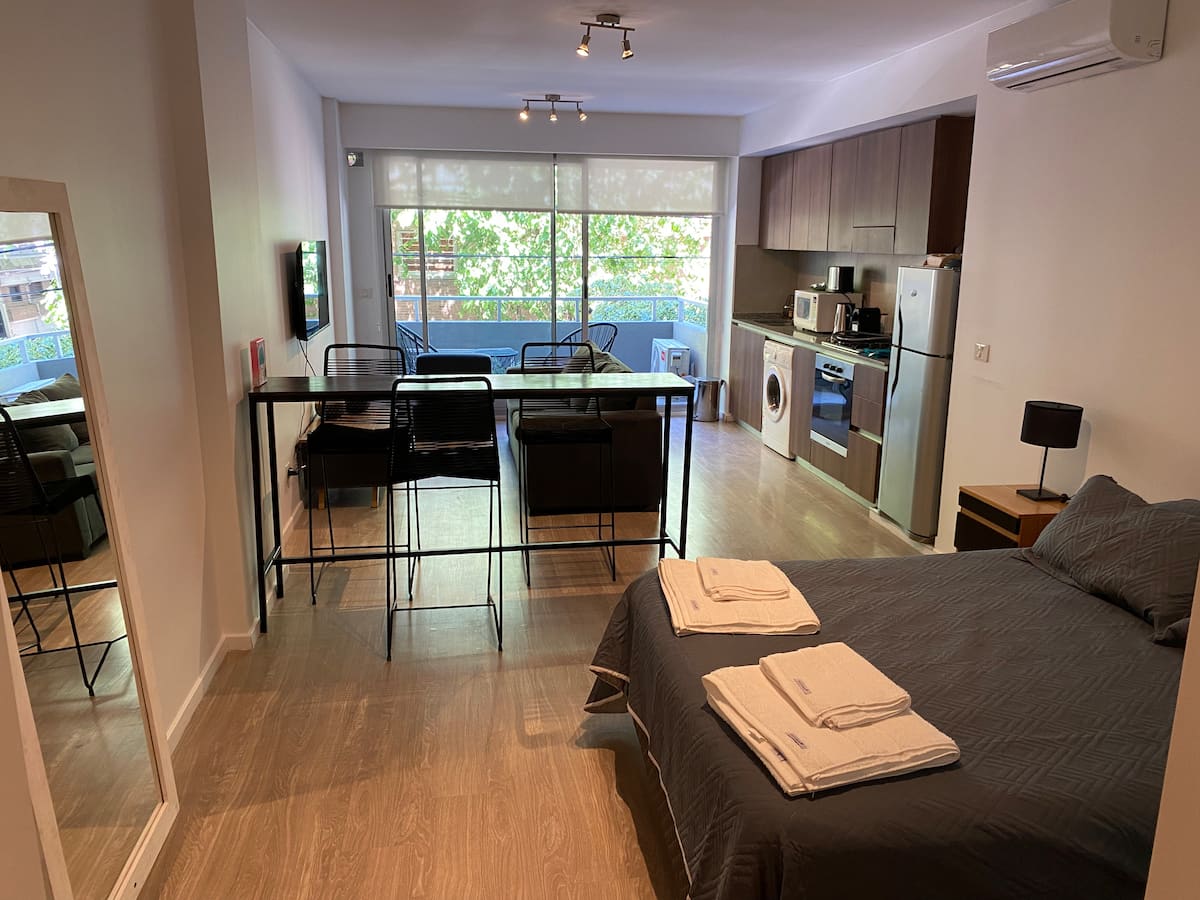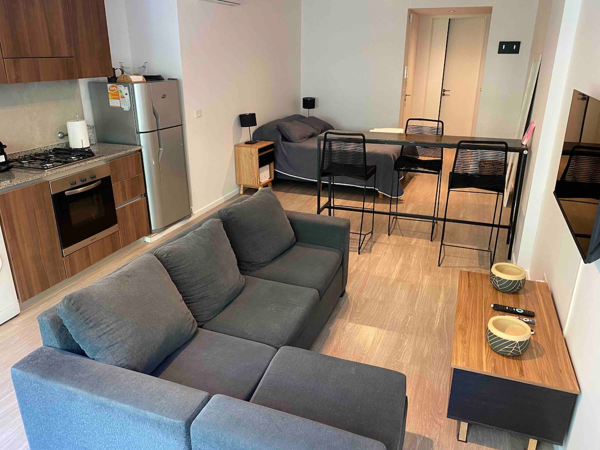 Apartamento tipo kitnet em Palermo. A unidade fica a duas quadras da estação Carranza da linha D do metrô. Há espaço com cama e roupa de cama; o terceiro hóspede pode dormir no sofá.