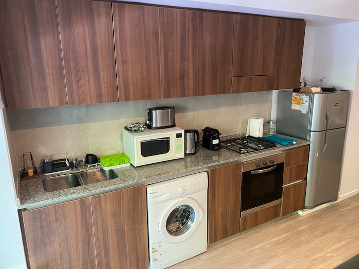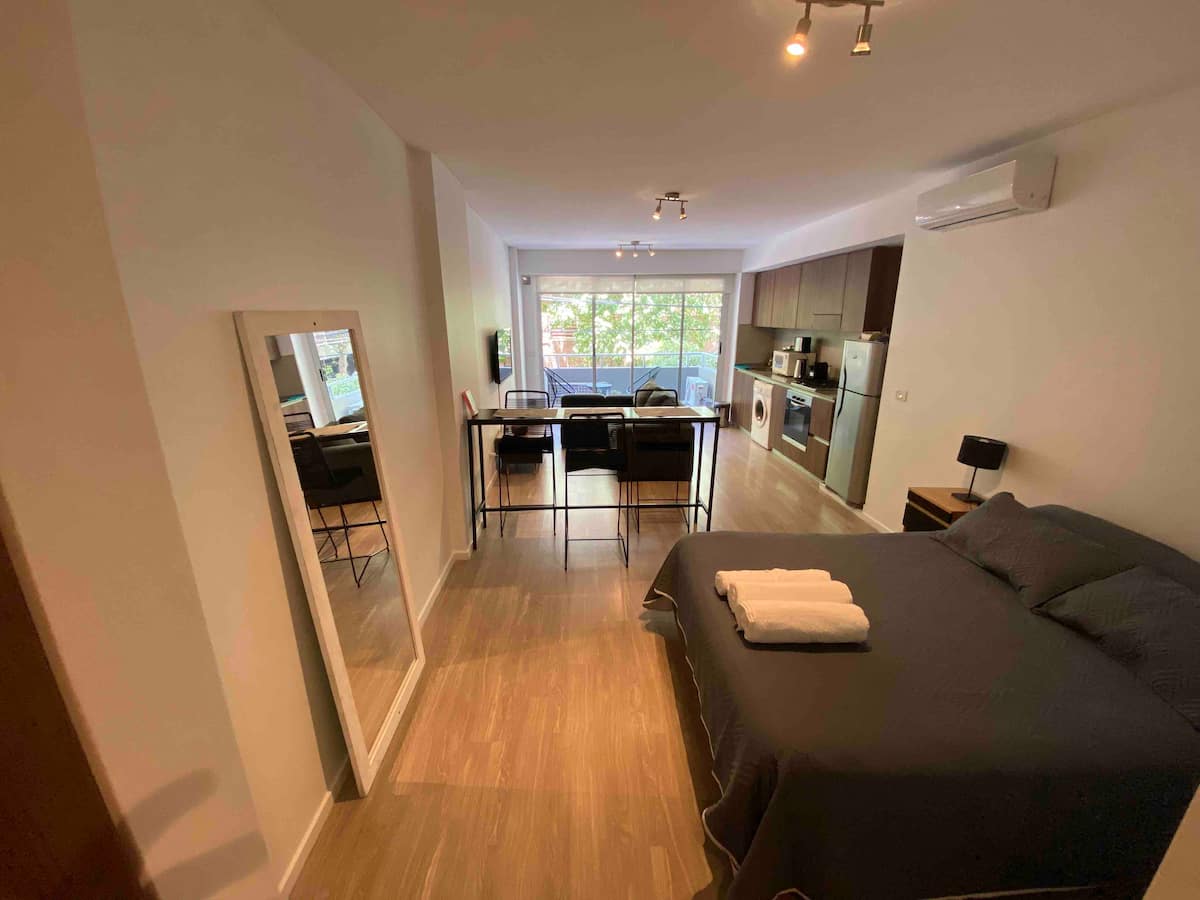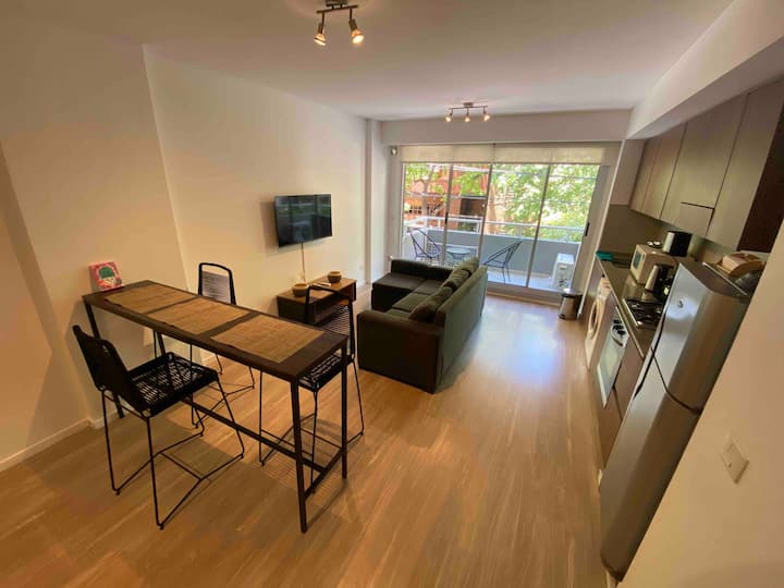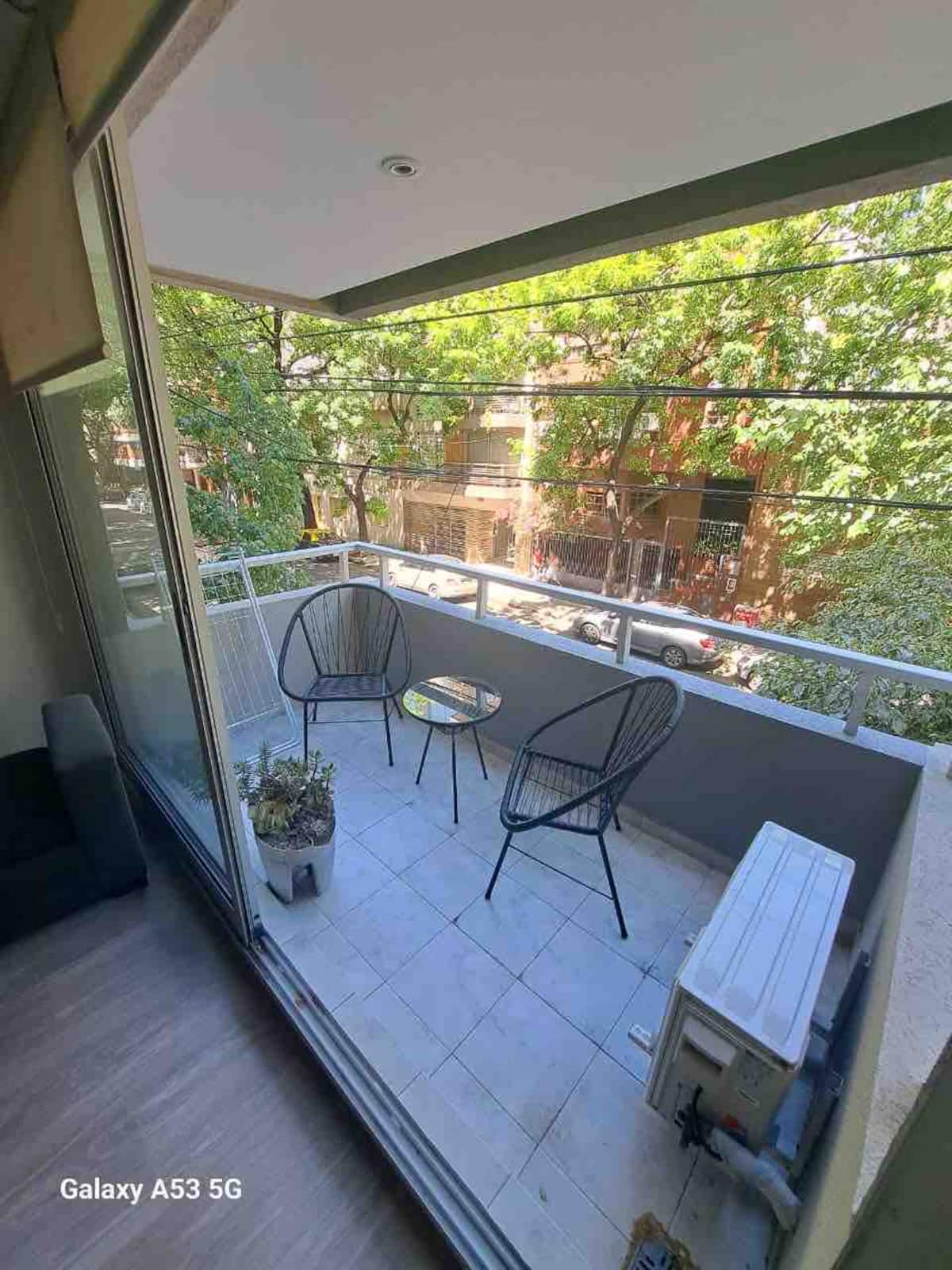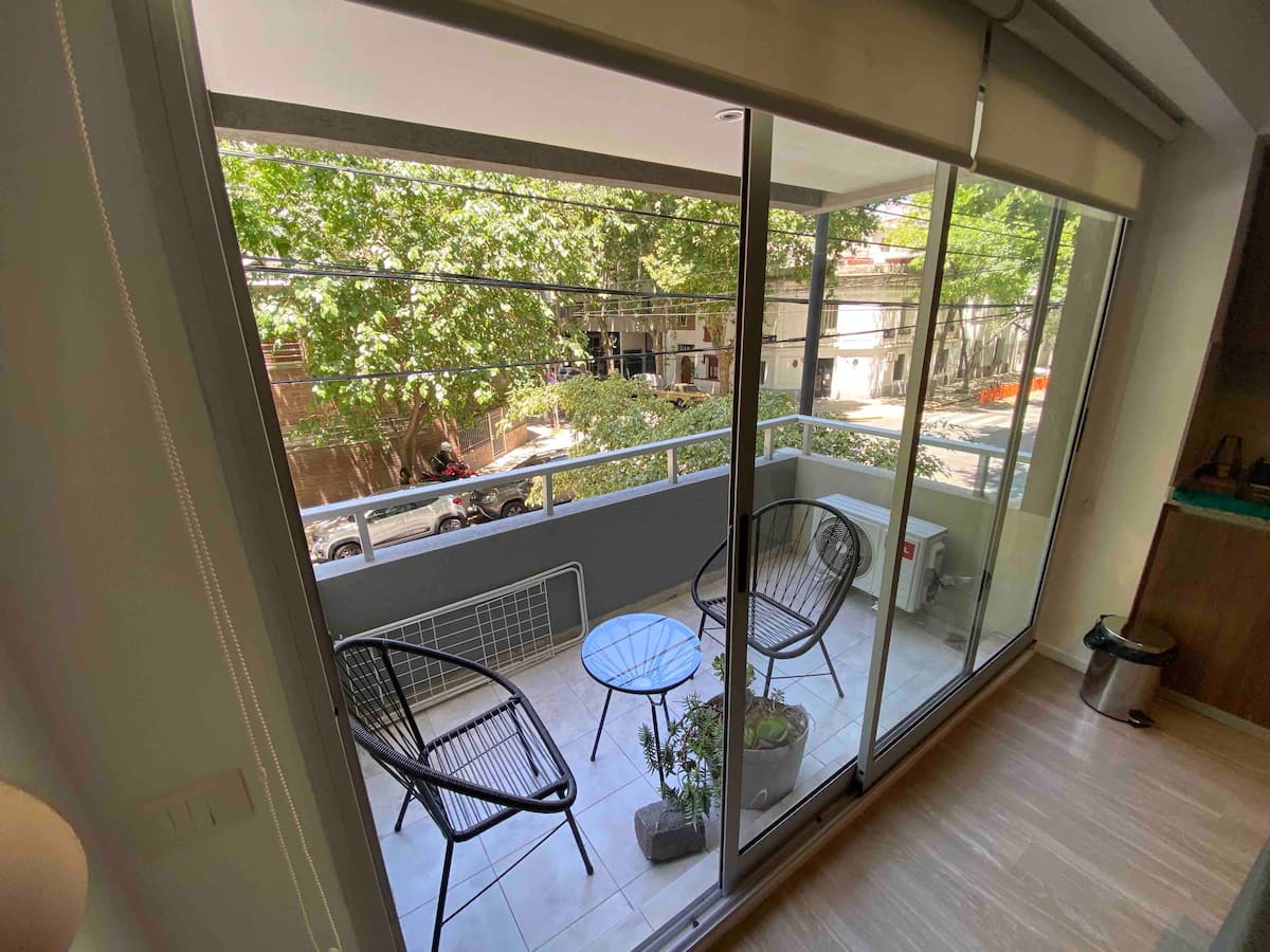 Apartamento tipo kitnet em Palermo. A unidade fica a duas quadras da estação Carranza da linha D do metrô. Há espaço com cama e roupa de cama; o terceiro hóspede pode dormir no sofá.