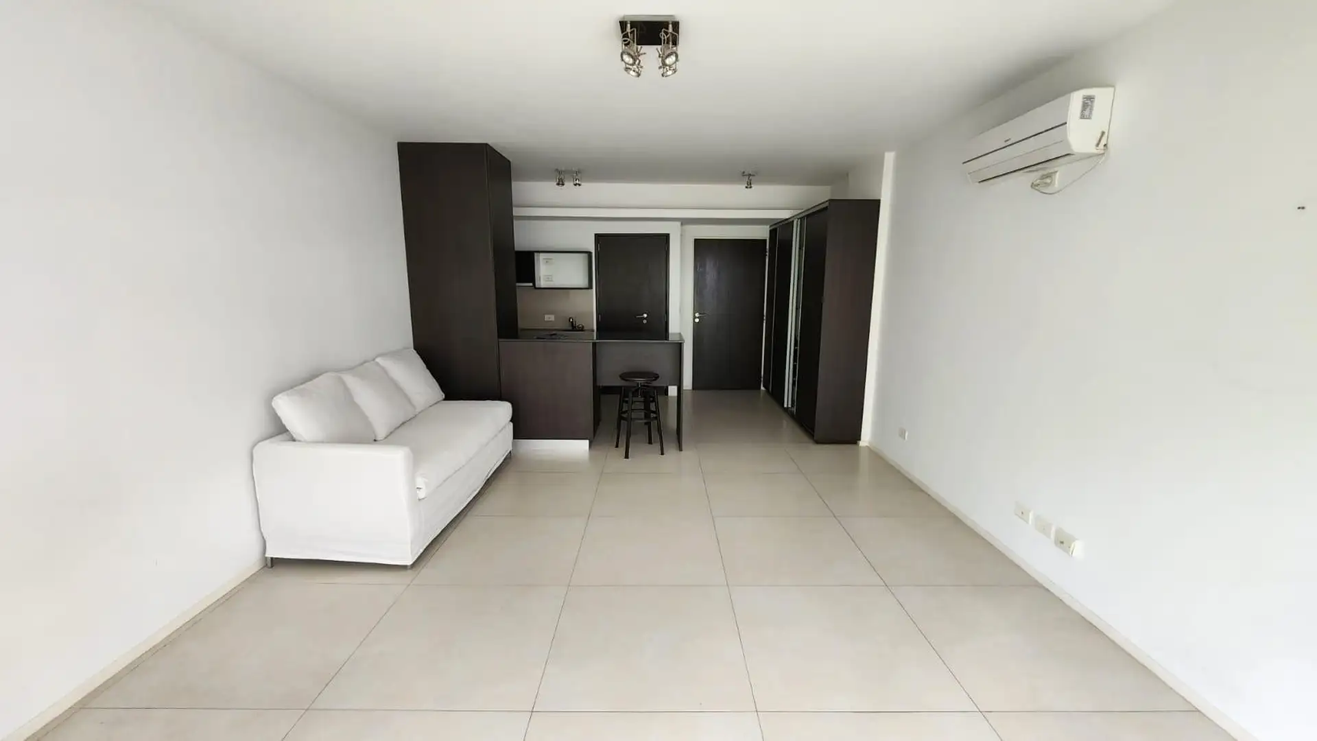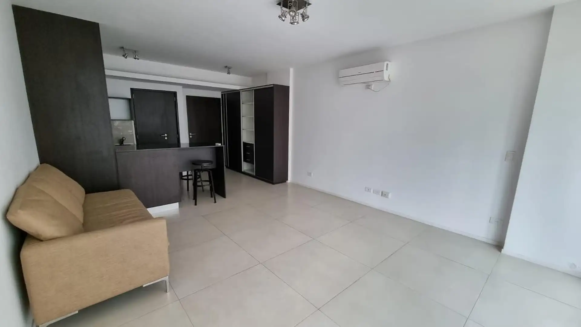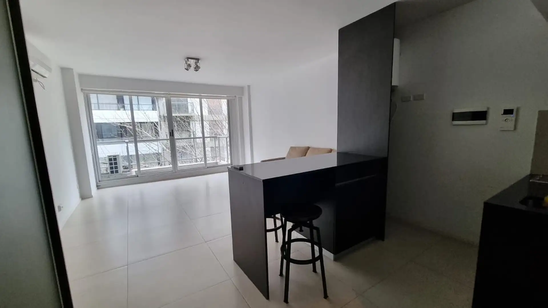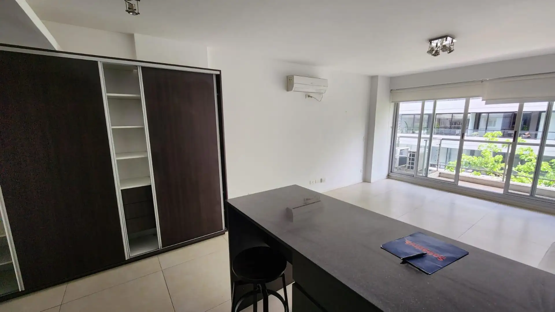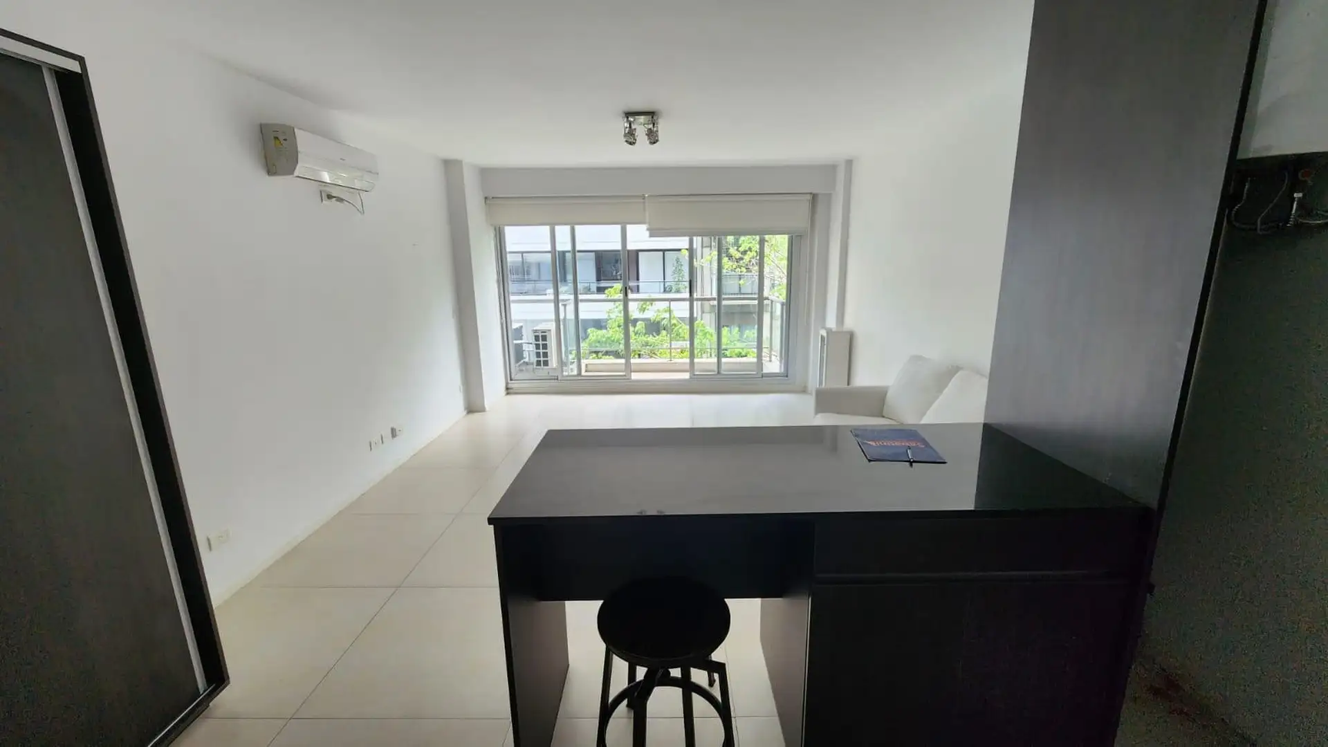Kitnet (um ambiente) semimesiado, de frente para a rua. Possui cozinha com balcão integrado e banquetas, amplo armário de 3 folhas feito sob medida e ambiente principal de 6,85 x 4. Inclui varanda de 4 m² com vista aberta, ar-condicionado frio/calor, cortinas roller e black-out e luminárias completas. Há churrasqueira no último andar e cortinas; o mobiliário adicional (sofá) é opcional. O imóvel fica a 2 quadras da Av. L. M. Campos e Libertador, próximo ao trem Mitre, à linha D do Subte e a linh