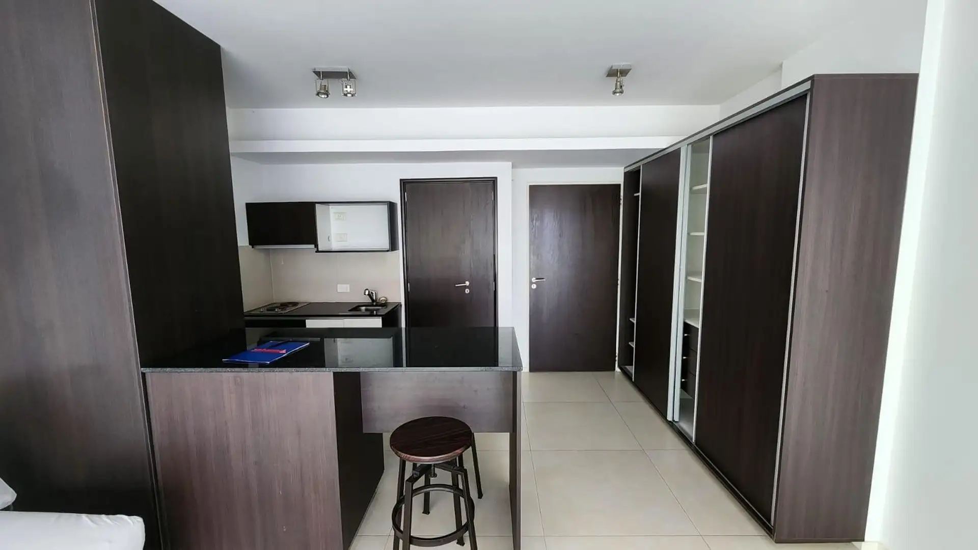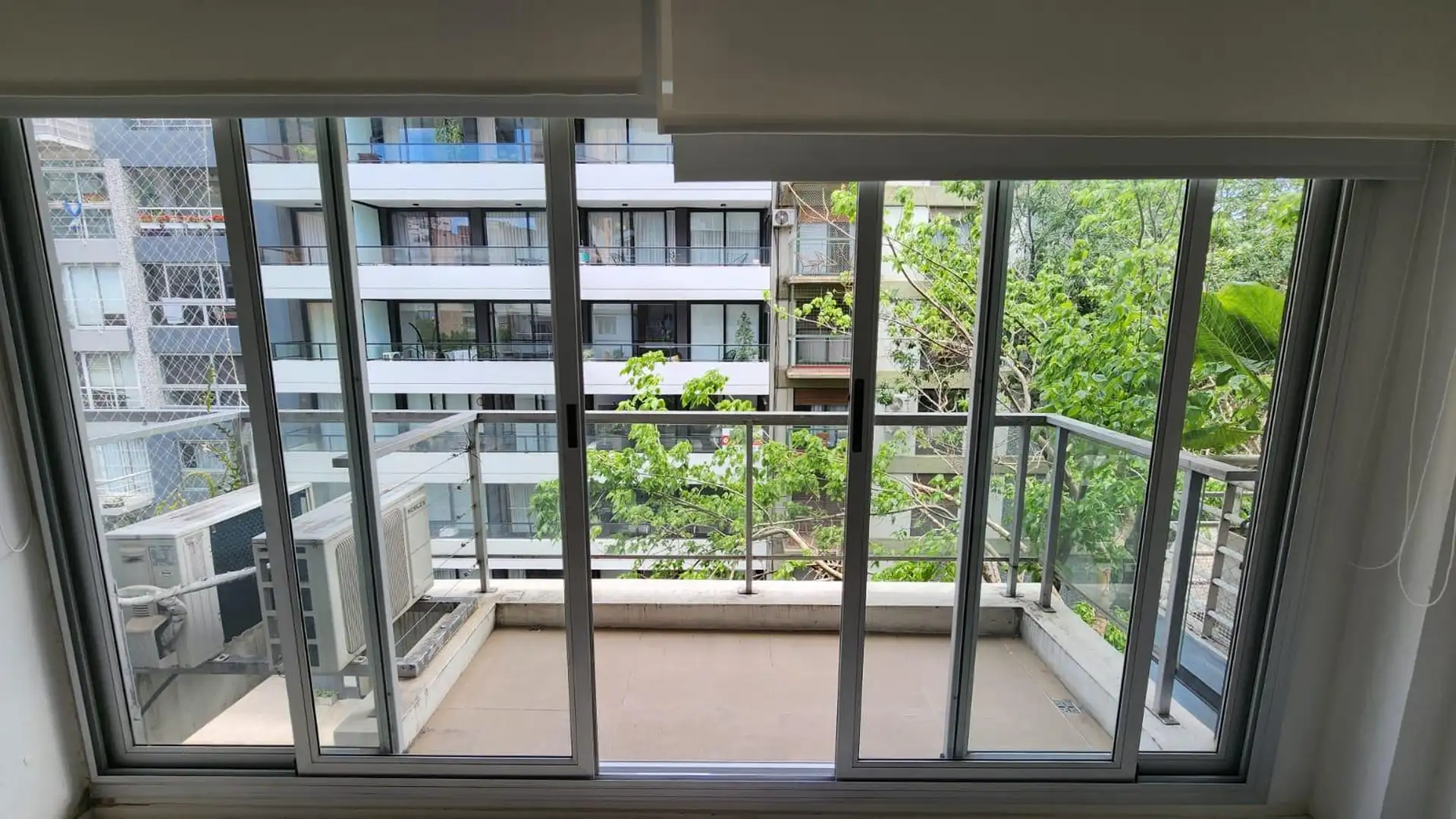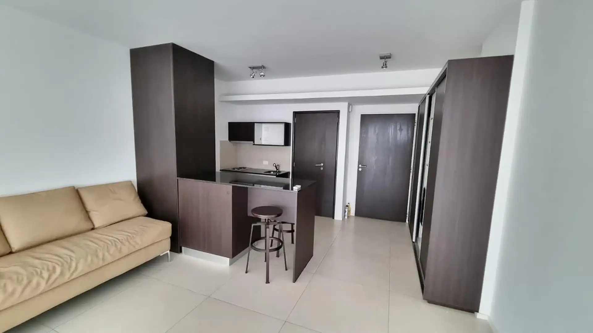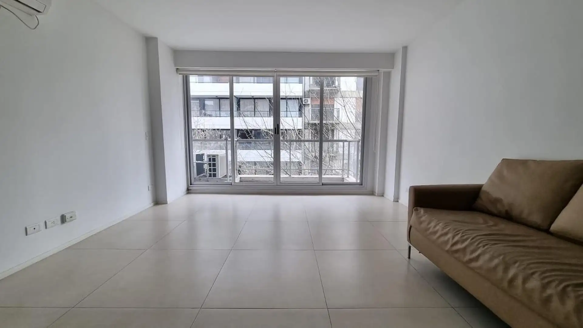 Kitnet (um ambiente) semimesiado, de frente para a rua. Possui cozinha com balcão integrado e banquetas, amplo armário de 3 folhas feito sob medida e ambiente principal de 6,85 x 4. Inclui varanda de 4 m² com vista aberta, ar-condicionado frio/calor, cortinas roller e black-out e luminárias completas. Há churrasqueira no último andar e cortinas; o mobiliário adicional (sofá) é opcional. O imóvel fica a 2 quadras da Av. L. M. Campos e Libertador, próximo ao trem Mitre, à linha D do Subte e a linh