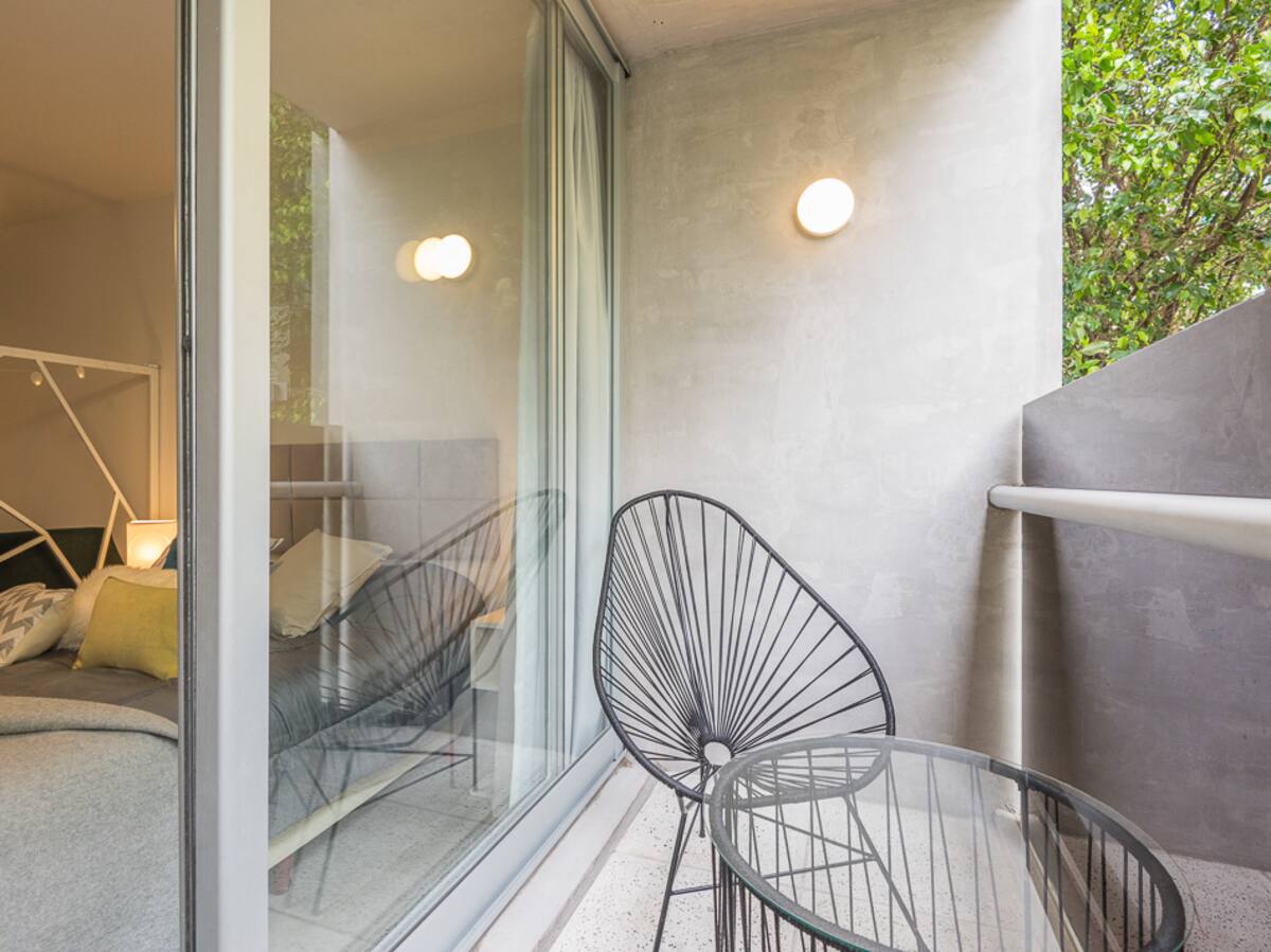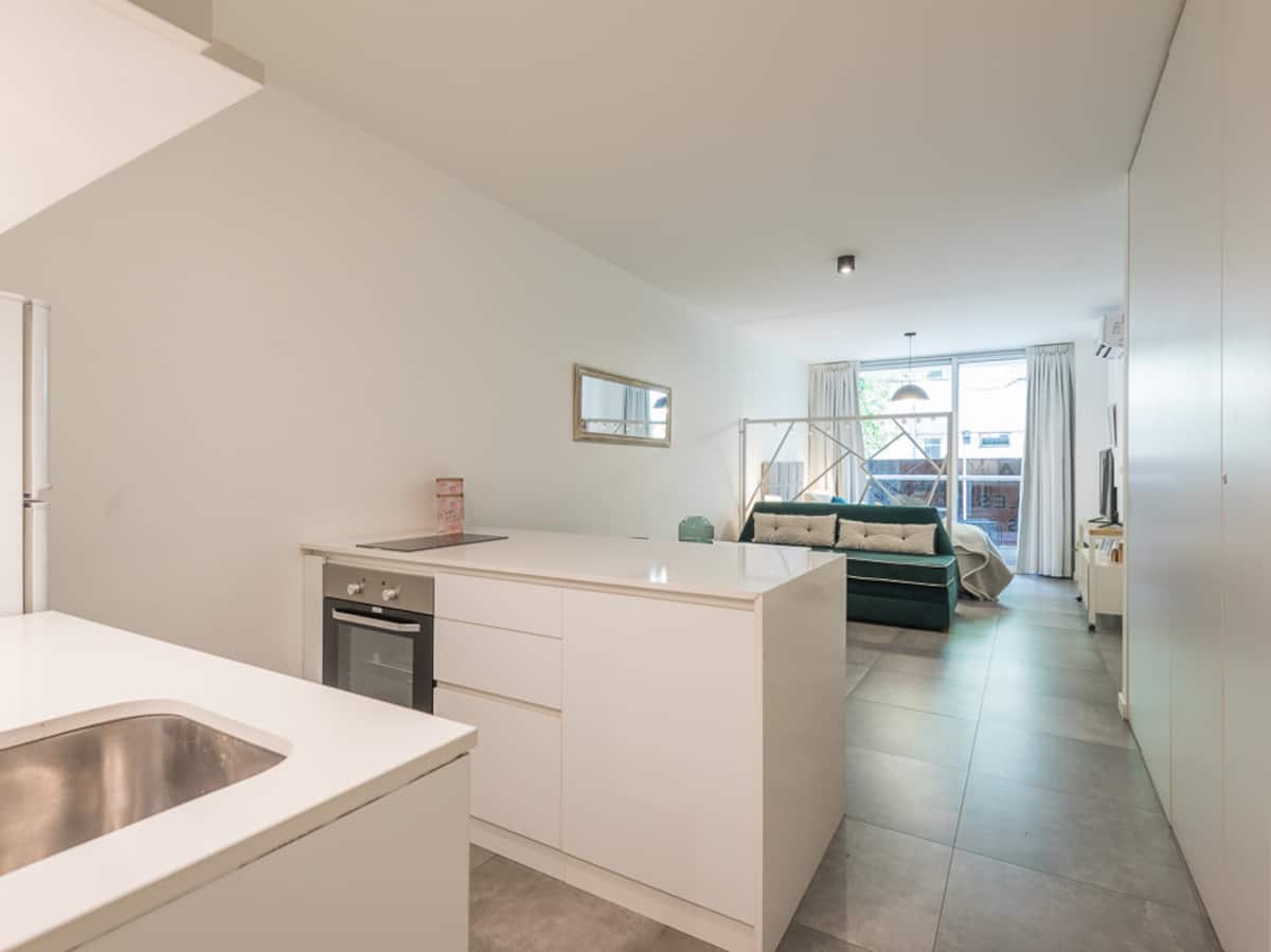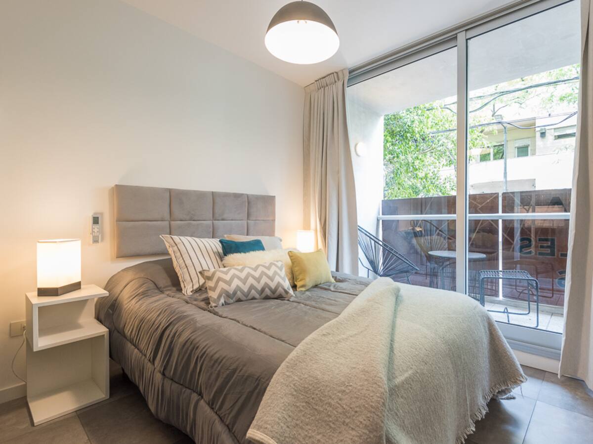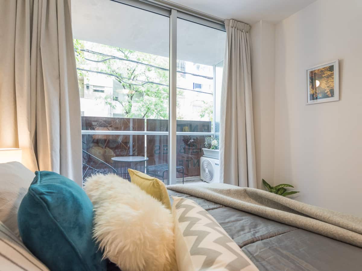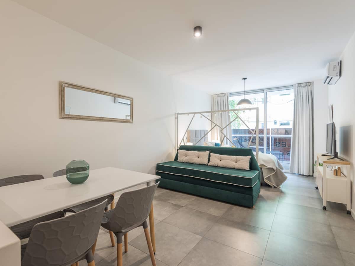 Kitnet em Palermo, em Buenos Aires. Tem cama de casal e sofá-cama no ambiente, mesa com cadeiras, cozinha integrada com máquina de lavar e banheiro completo com box de chuveiro. Inclui varanda com vista e acomodação para 4 pessoas.