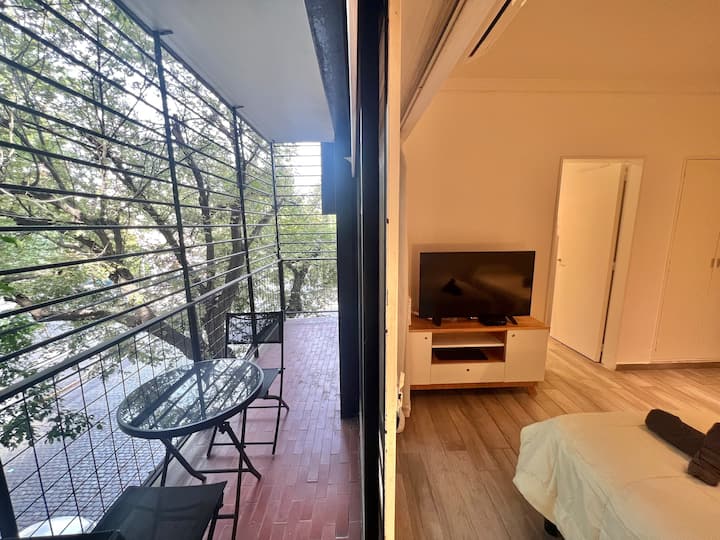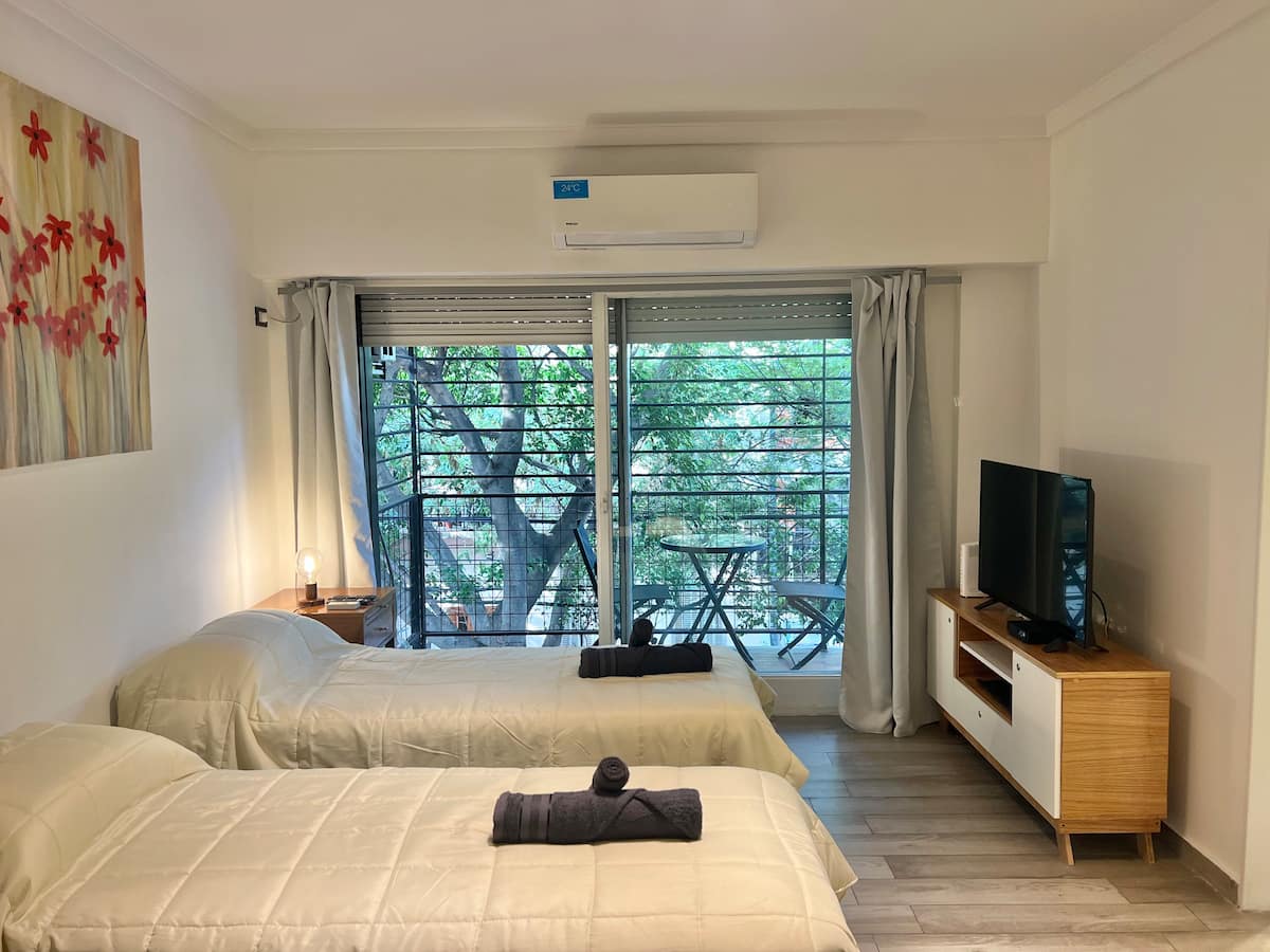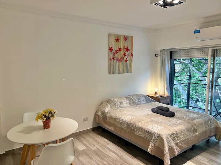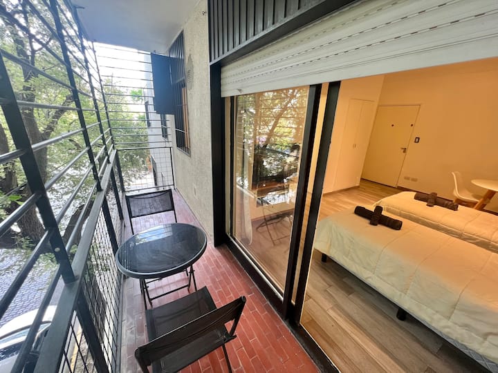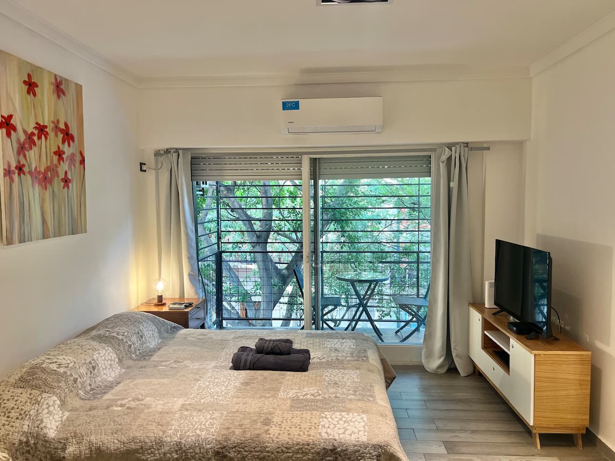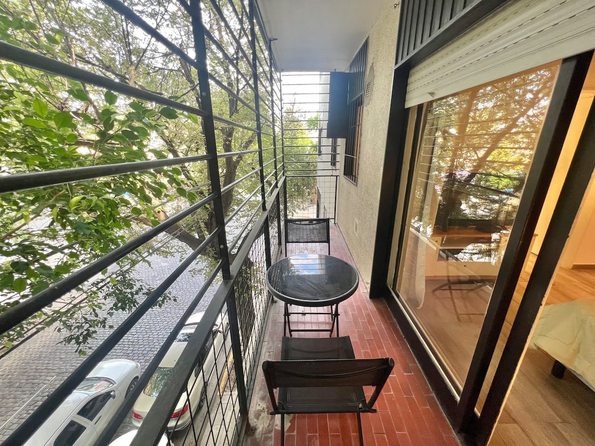 Apartamento de 1 ambiente em Palermo Soho, com varanda. Fica perto da Plaza Armenia e a alguns quarteirões da Plaza Serrano, com opções de transporte nas proximidades. A reserva para estadas de 20 dias ou mais pode incluir uma política de consumo de energia elétrica: se o uso ultrapassar 500 kWh durante a estadia, poderá haver cobrança adicional. O acesso ao imóvel exige o envio prévio de identificação de todos os passageiros para registro no prédio e o check-in é feito por autoatendimento, com