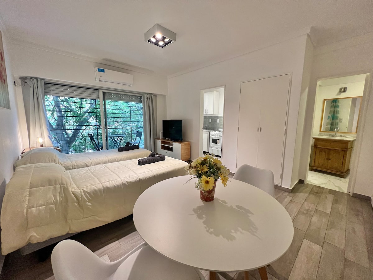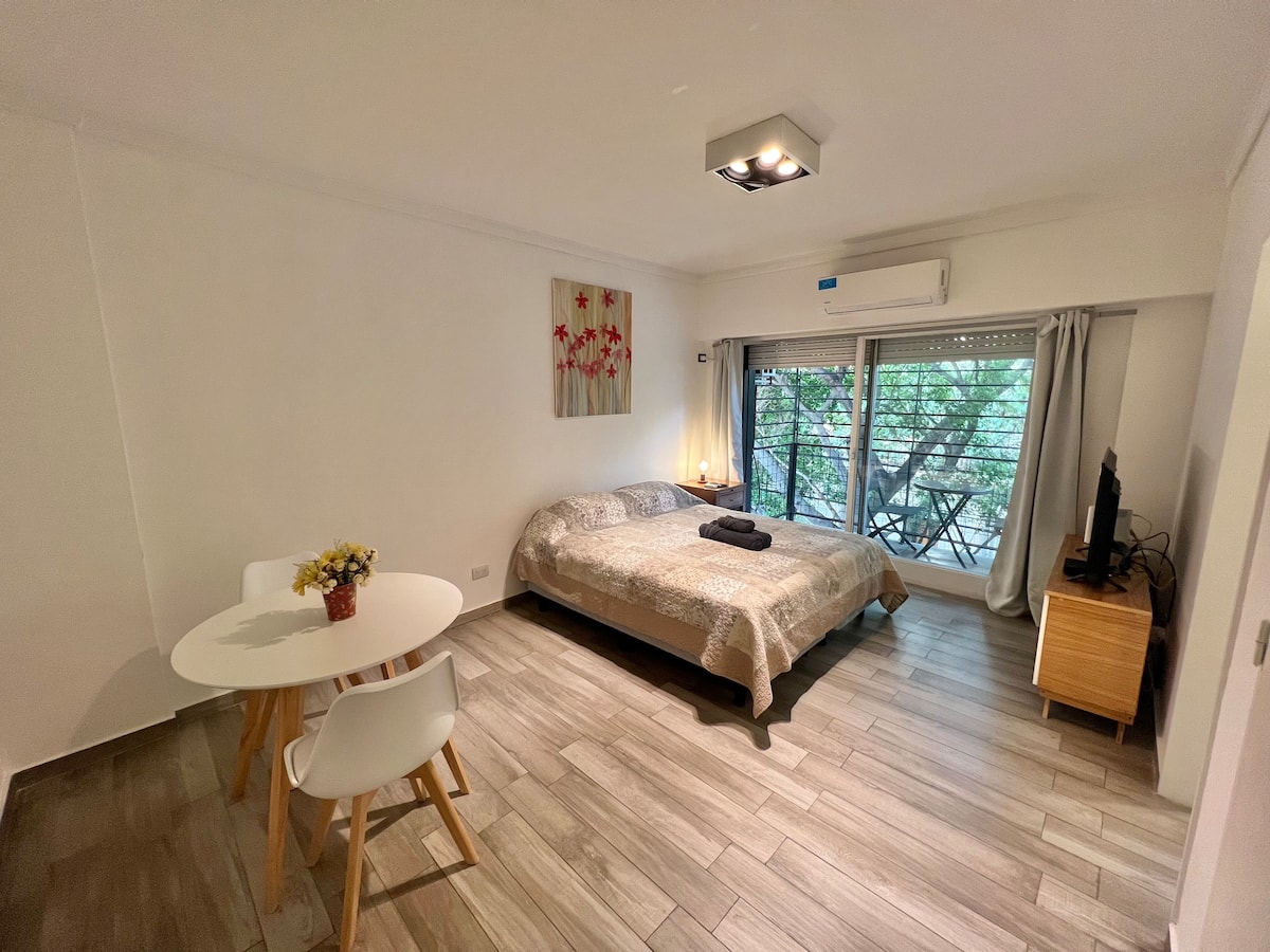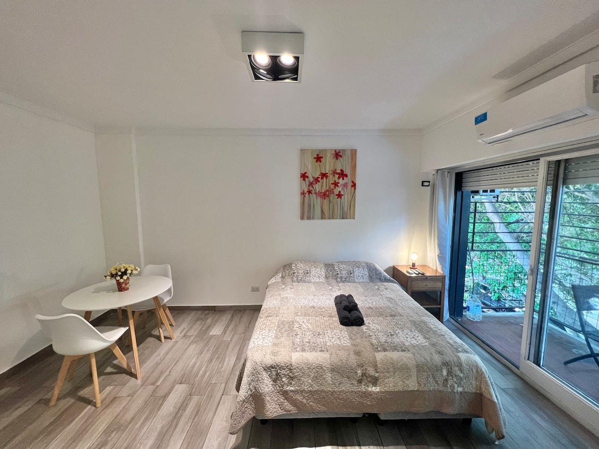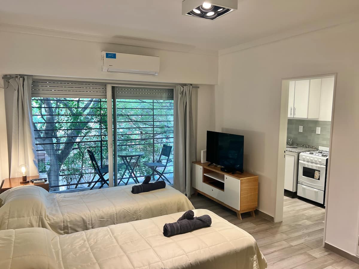 Apartamento de 1 ambiente em Palermo Soho, com varanda. Fica perto da Plaza Armenia e a alguns quarteirões da Plaza Serrano, com opções de transporte nas proximidades. A reserva para estadas de 20 dias ou mais pode incluir uma política de consumo de energia elétrica: se o uso ultrapassar 500 kWh durante a estadia, poderá haver cobrança adicional. O acesso ao imóvel exige o envio prévio de identificação de todos os passageiros para registro no prédio e o check-in é feito por autoatendimento, com