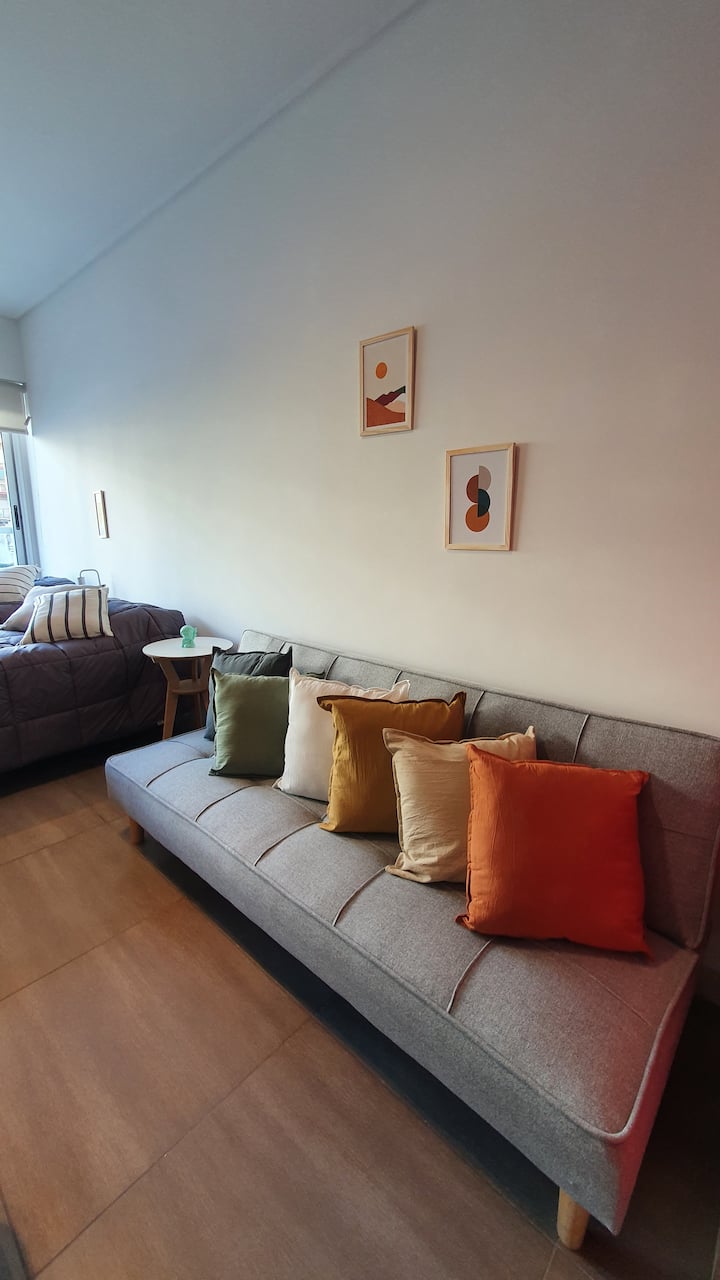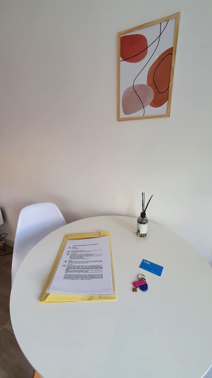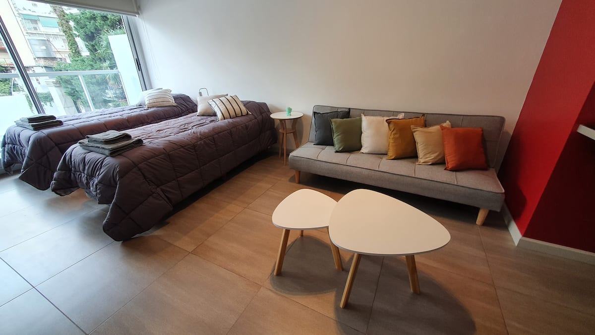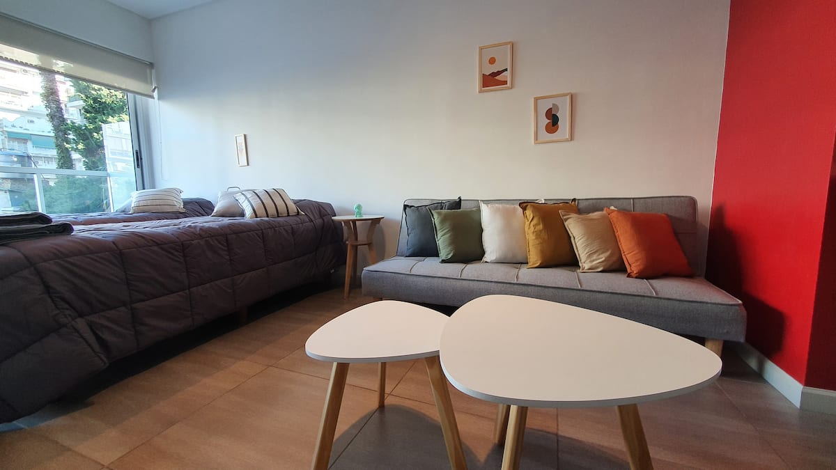 Kitnet reformada em Palermo Hollywood, no 2º andar com acesso por elevador, com varanda. Inclui cozinha tipo kitchenette com geladeira com freezer e forno micro-ondas, banheiro completo com banheira, ar-condicionado individual frio e quente e TV smart. O Wi-Fi é gratuito para uso exclusivo. Fornece roupa de cama, conjunto de toalhas por pessoa, utensílios de cozinha, secador de cabelo e ferro, além de acesso com cartão SUBE para transporte público.