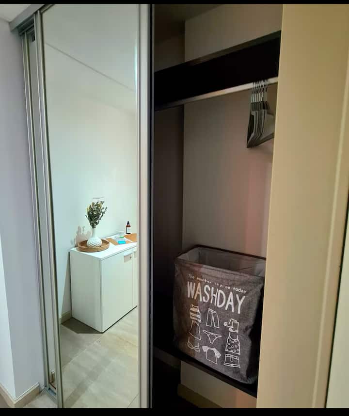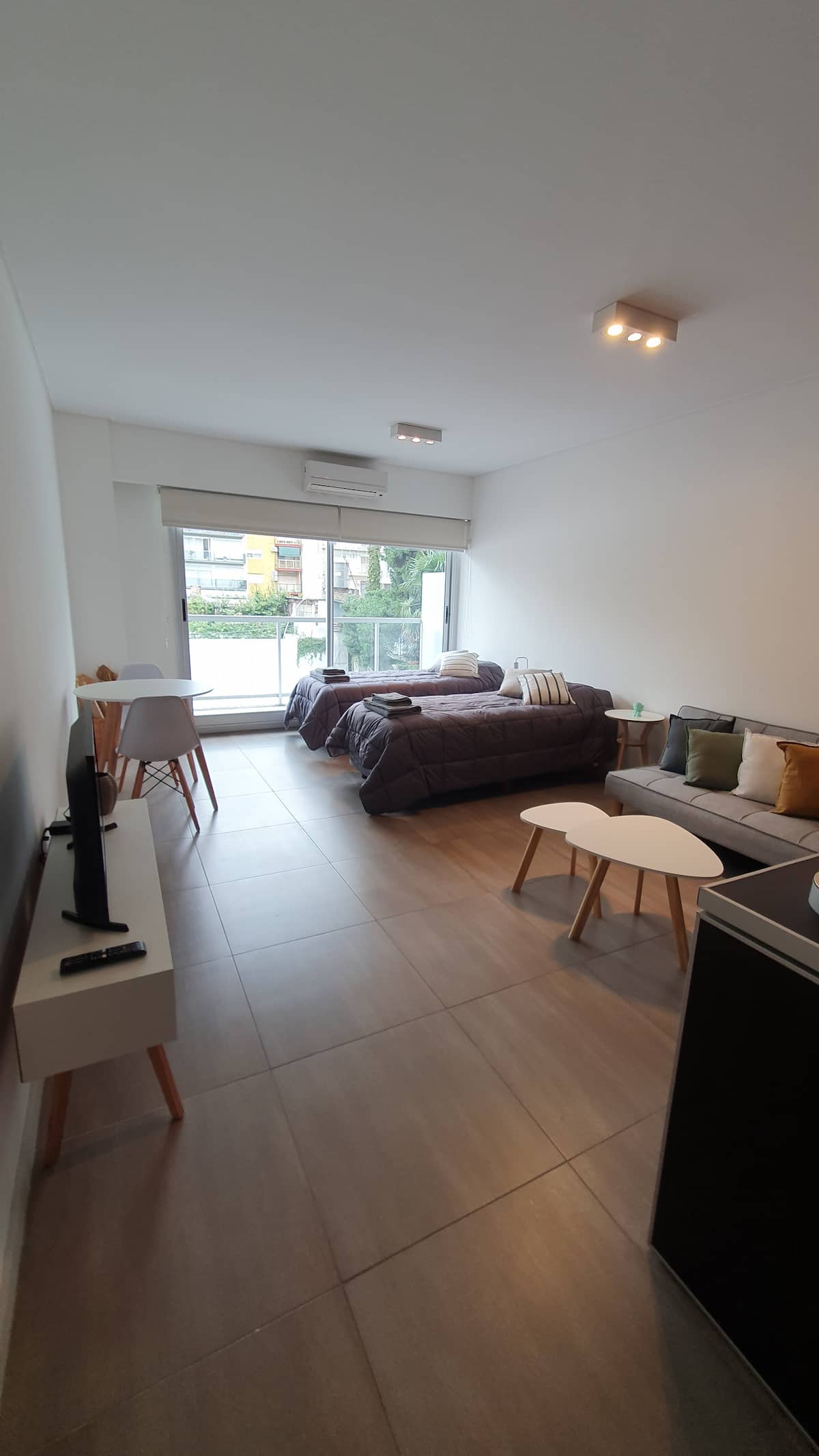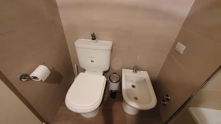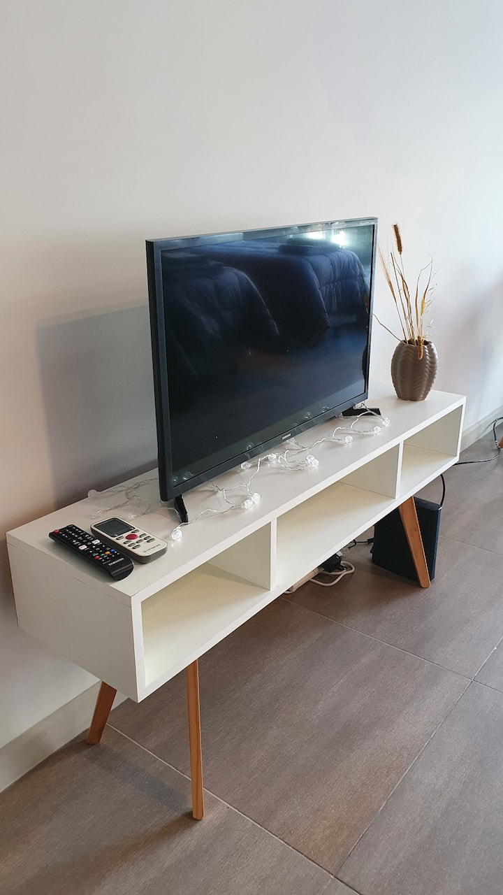 Kitnet reformada em Palermo Hollywood, no 2º andar com acesso por elevador, com varanda. Inclui cozinha tipo kitchenette com geladeira com freezer e forno micro-ondas, banheiro completo com banheira, ar-condicionado individual frio e quente e TV smart. O Wi-Fi é gratuito para uso exclusivo. Fornece roupa de cama, conjunto de toalhas por pessoa, utensílios de cozinha, secador de cabelo e ferro, além de acesso com cartão SUBE para transporte público.