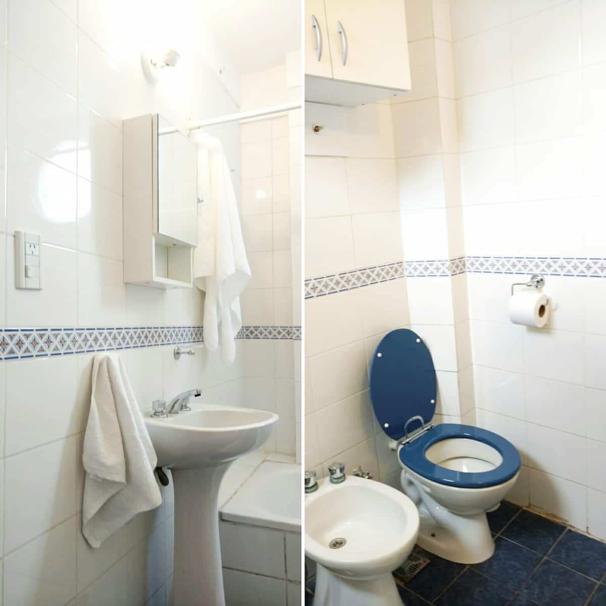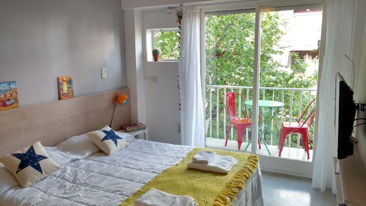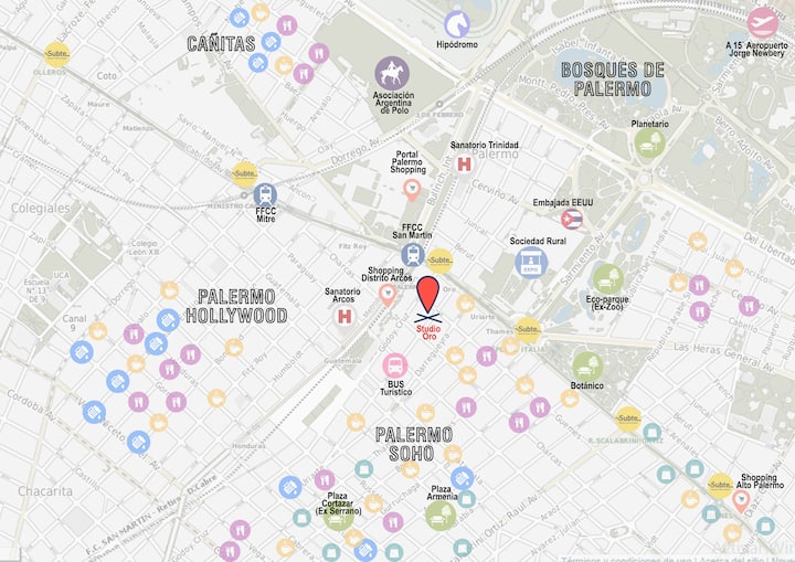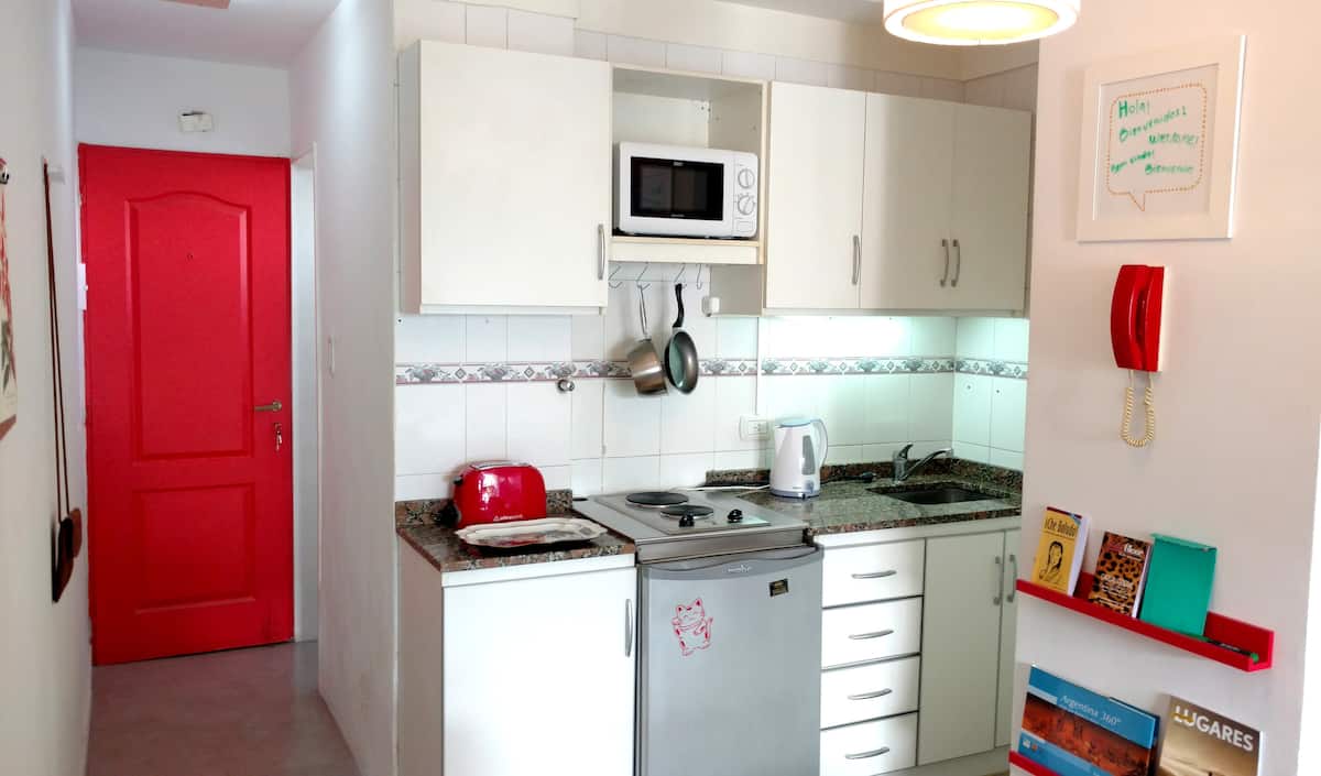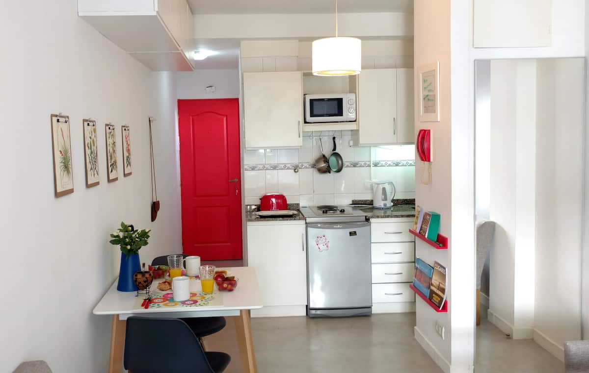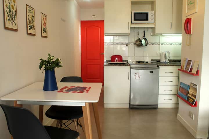 Kitnet mobiliada em Palermo, a poucas quadras da Plaza Italia. Conta com cama queen (180 x 190 cm), cozinha com fogão elétrico de 2 bocas e micro-ondas elétrico, e banheiro com banheira. O prédio tem área de lavanderia no último andar e segurança noturna. Há possibilidade de ruído entre 8:00 e 17:00 em dias úteis devido a obras nas proximidades; para entrar no prédio é necessário subir degraus.