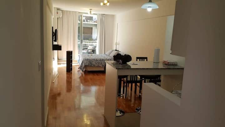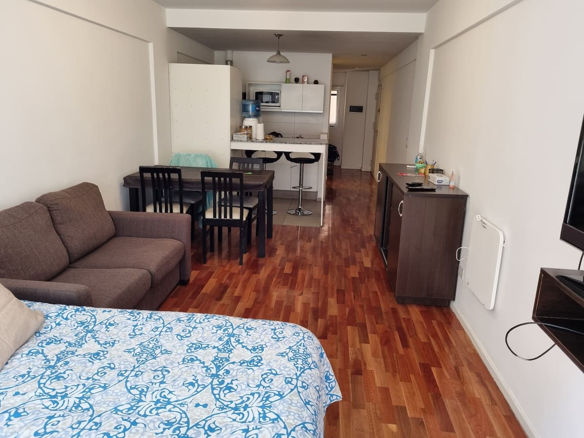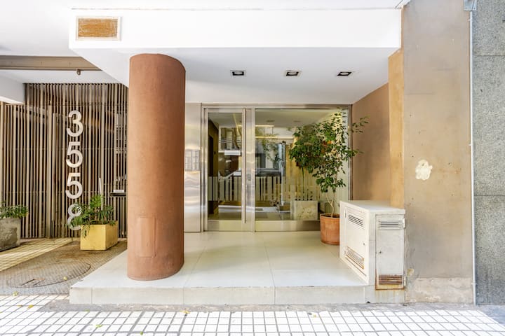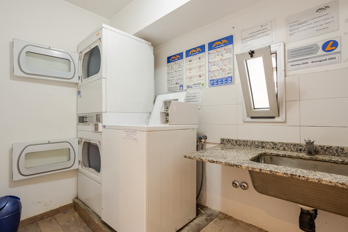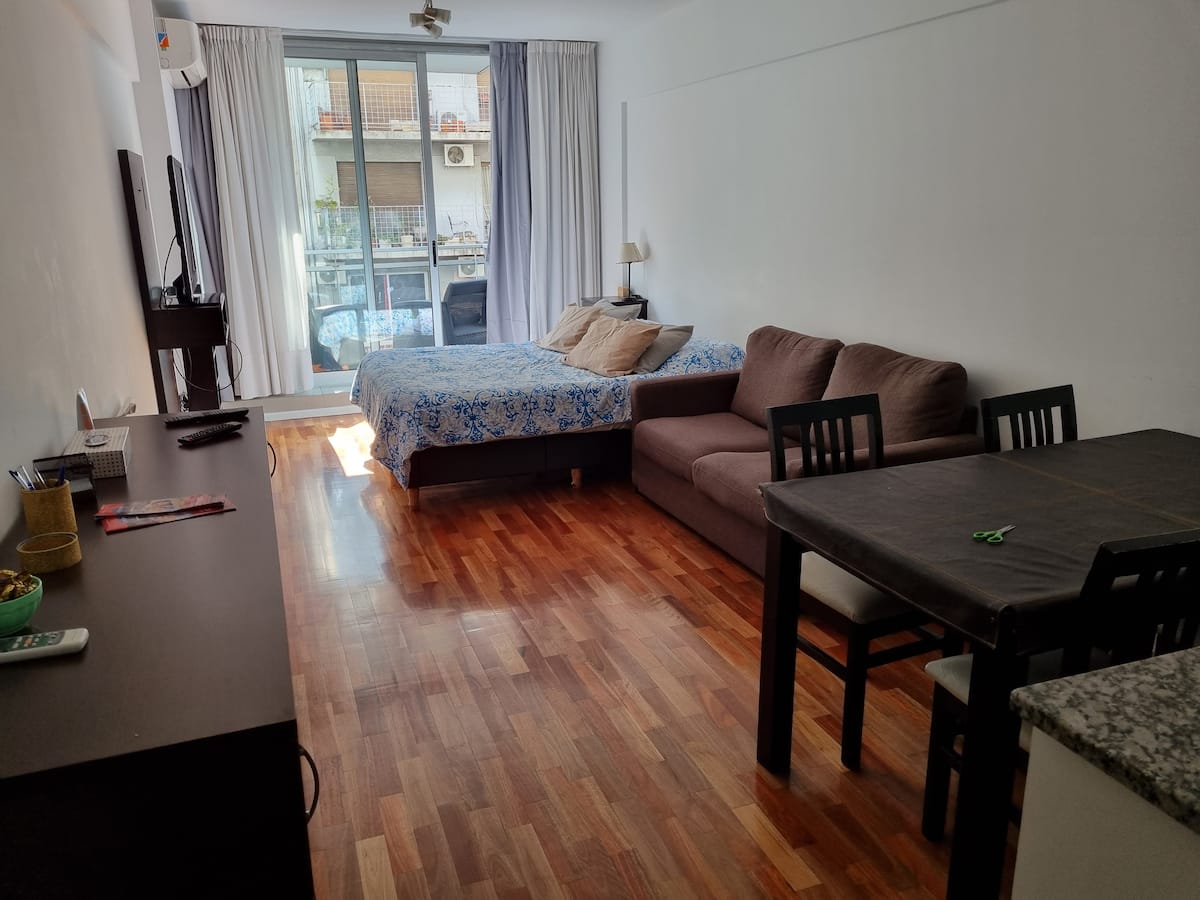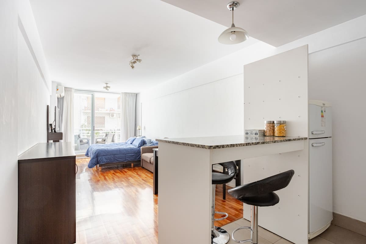 Kitnet em Palermo, voltada a estadias de curta ou longa duração. O edifício tem uma área comum no 9º andar com churrasqueira. No mesmo andar fica a lavanderia, com máquina de lavar e 2 secadoras; há também varal. Para usar as máquinas, é necessário comprar fichas em um quiosque. O imóvel fica em área tranquila, próximo de ponto de ônibus e do metrô, e a 1 quarteirão do shopping Alto Palermo.