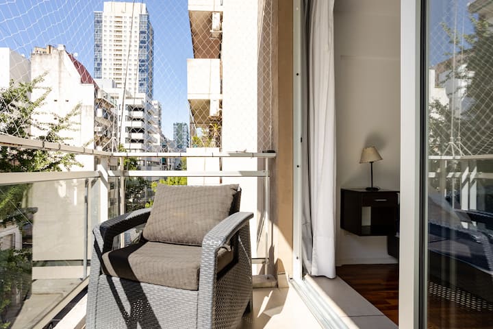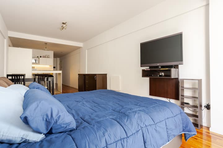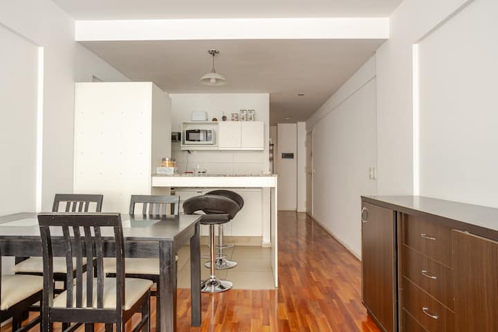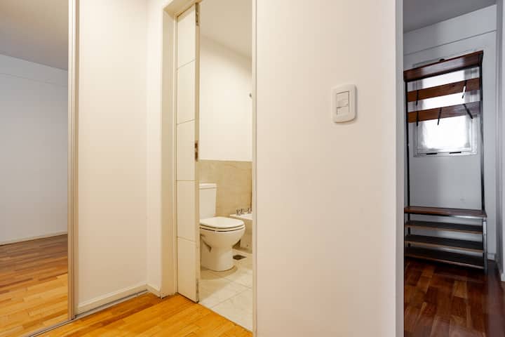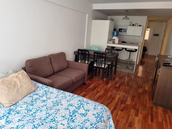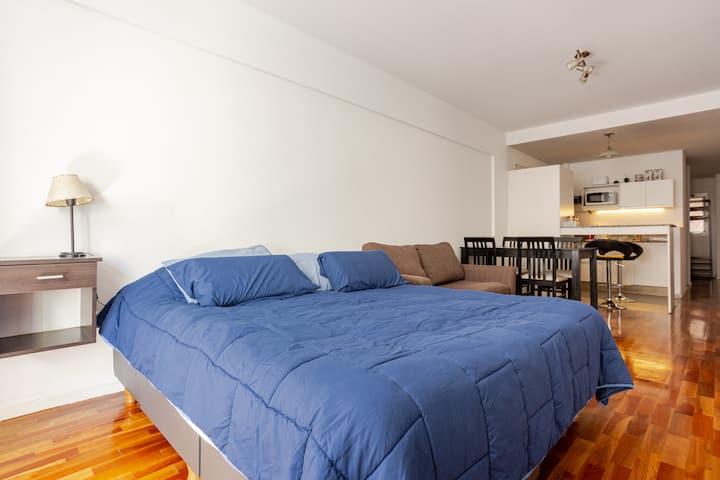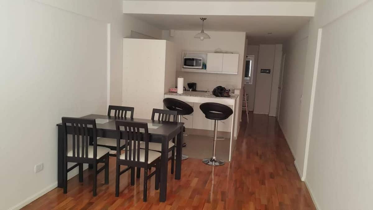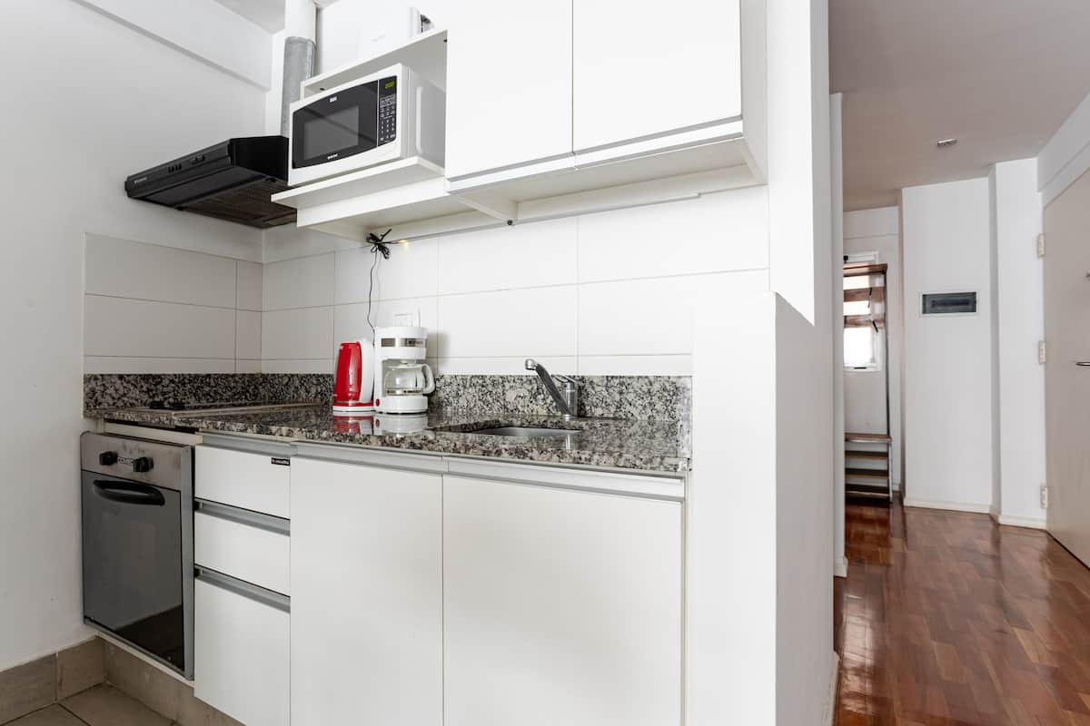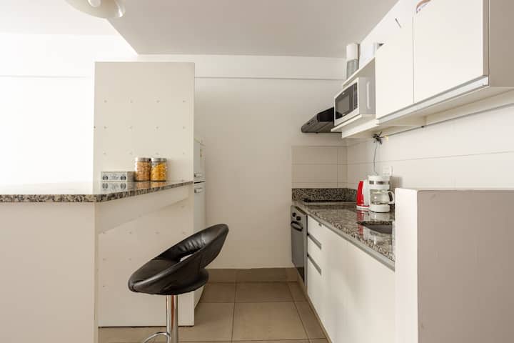 Kitnet em Palermo, voltada a estadias de curta ou longa duração. O edifício tem uma área comum no 9º andar com churrasqueira. No mesmo andar fica a lavanderia, com máquina de lavar e 2 secadoras; há também varal. Para usar as máquinas, é necessário comprar fichas em um quiosque. O imóvel fica em área tranquila, próximo de ponto de ônibus e do metrô, e a 1 quarteirão do shopping Alto Palermo.