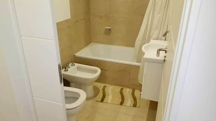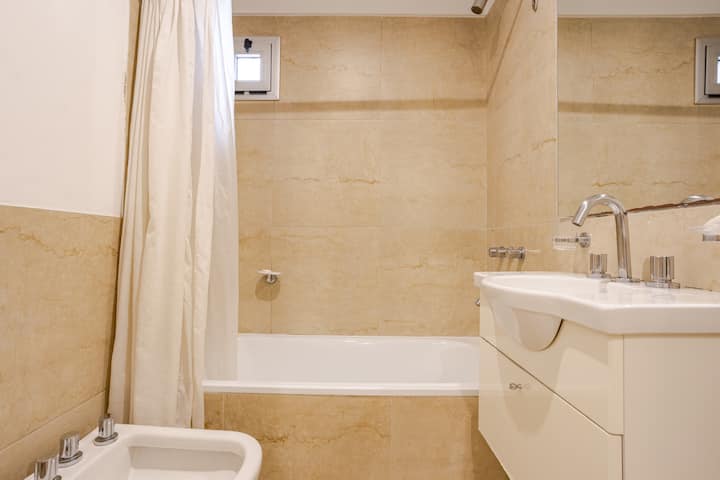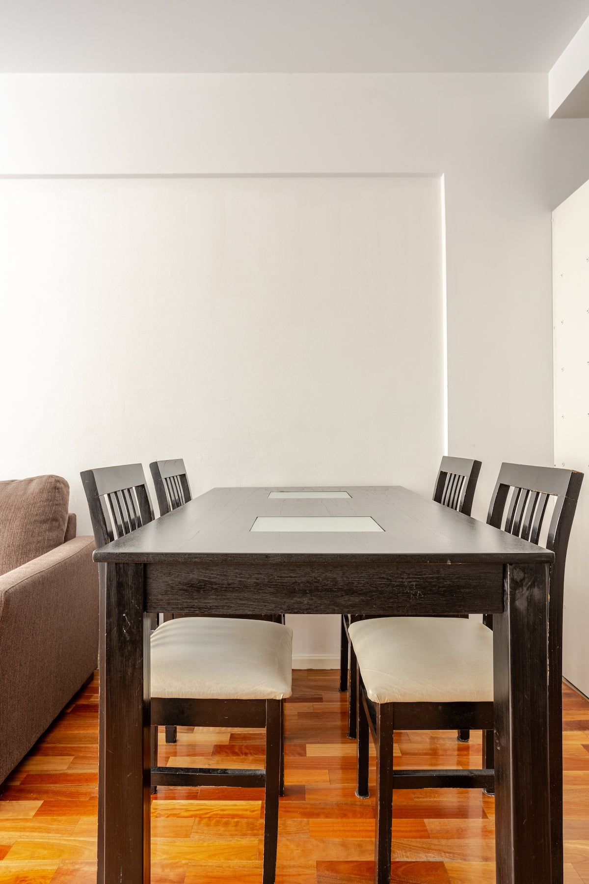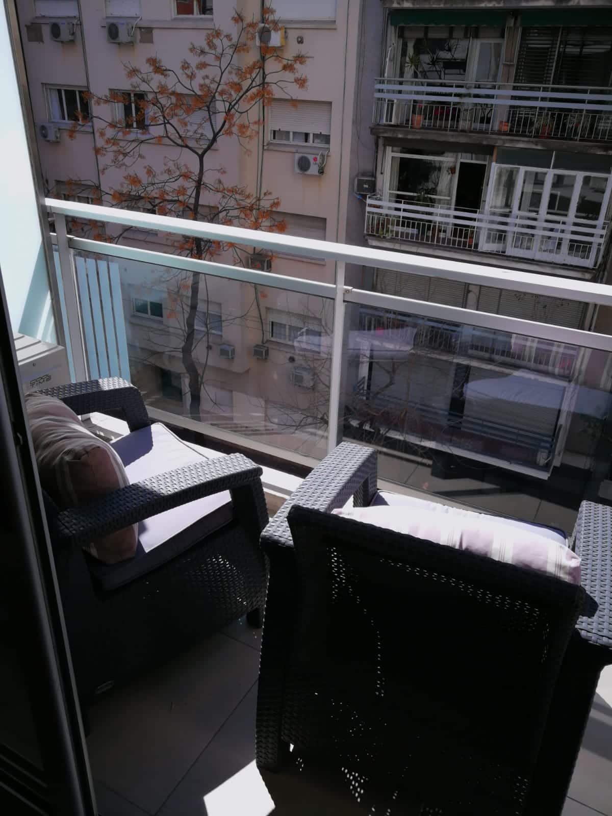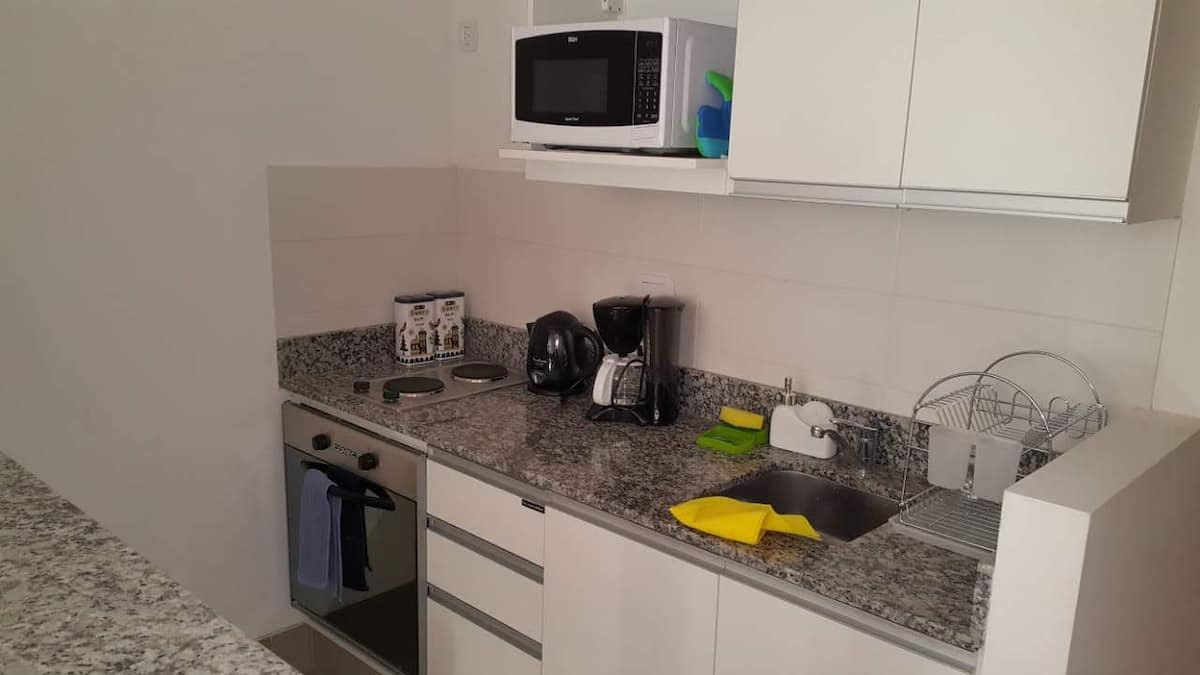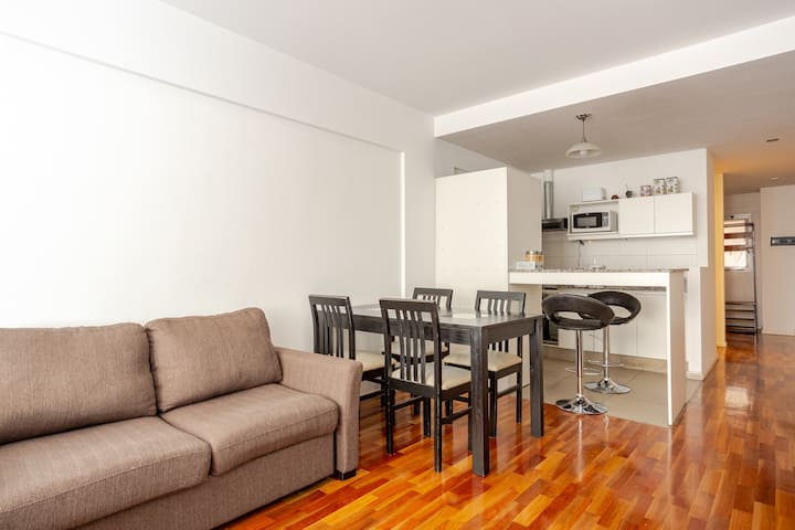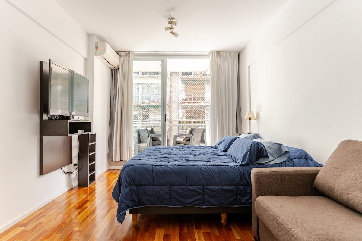 Kitnet em Palermo, voltada a estadias de curta ou longa duração. O edifício tem uma área comum no 9º andar com churrasqueira. No mesmo andar fica a lavanderia, com máquina de lavar e 2 secadoras; há também varal. Para usar as máquinas, é necessário comprar fichas em um quiosque. O imóvel fica em área tranquila, próximo de ponto de ônibus e do metrô, e a 1 quarteirão do shopping Alto Palermo.