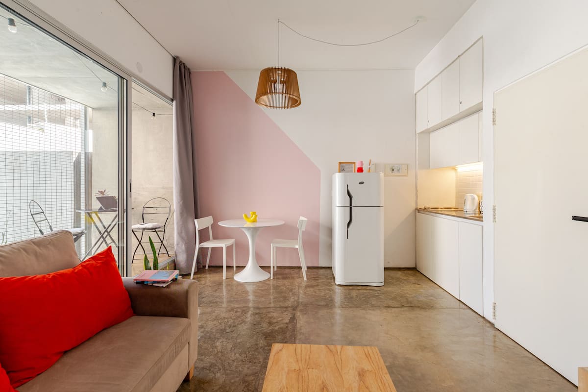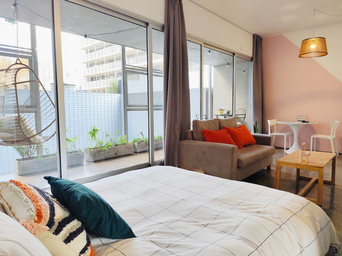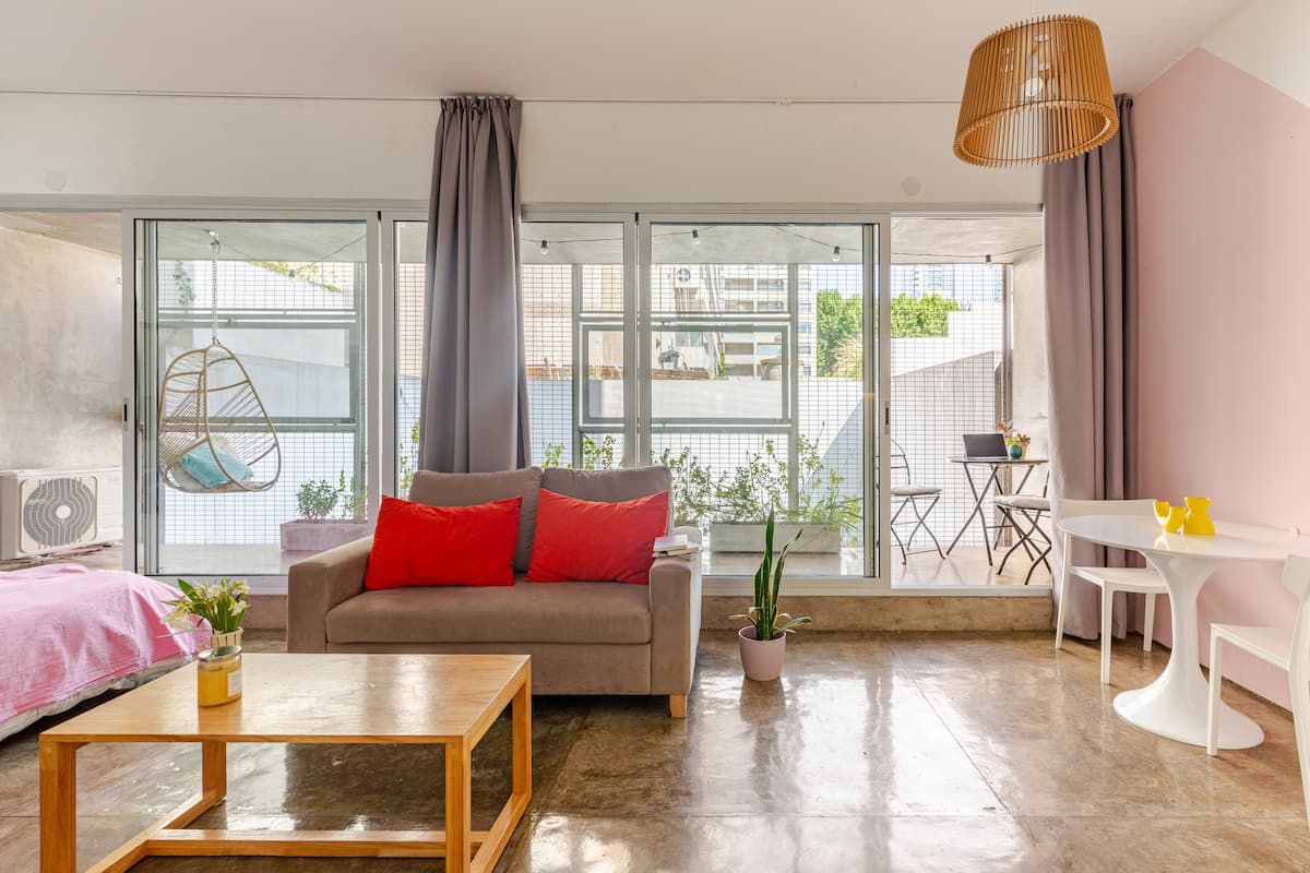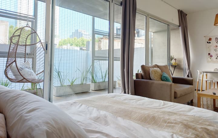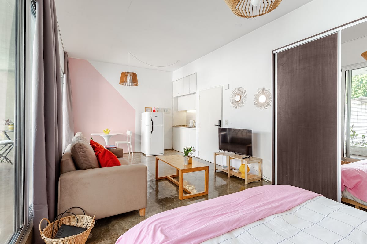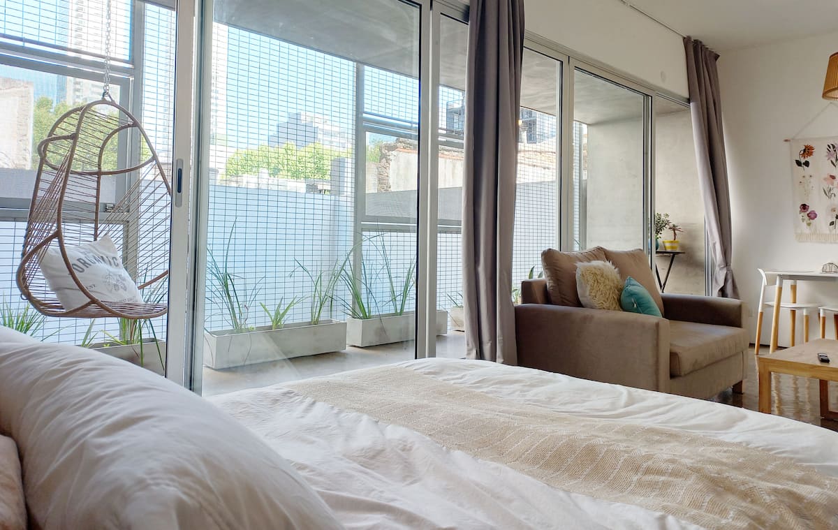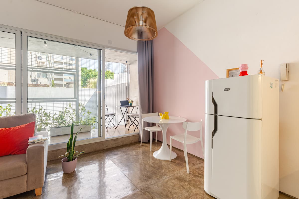Kitnet (apartamento de um único ambiente) em Palermo Hollywood, mobiliada, com varanda ampla e iluminação natural. Cozinha equipada, com Wi-Fi de alta velocidade para videochamadas e TV Smart de 45”. O acesso é por self check-in, com adaptador universal de tomada, além de cartão de transporte e itens de lazer (jogos).