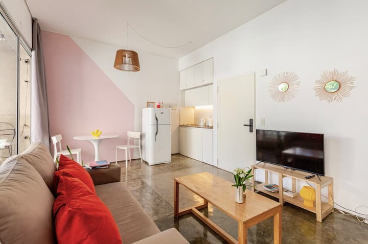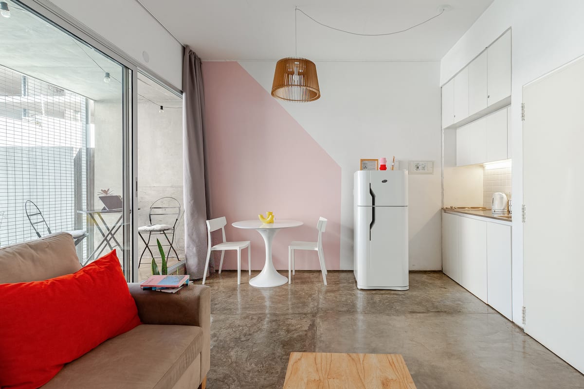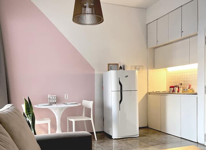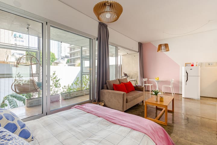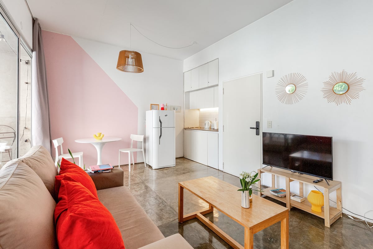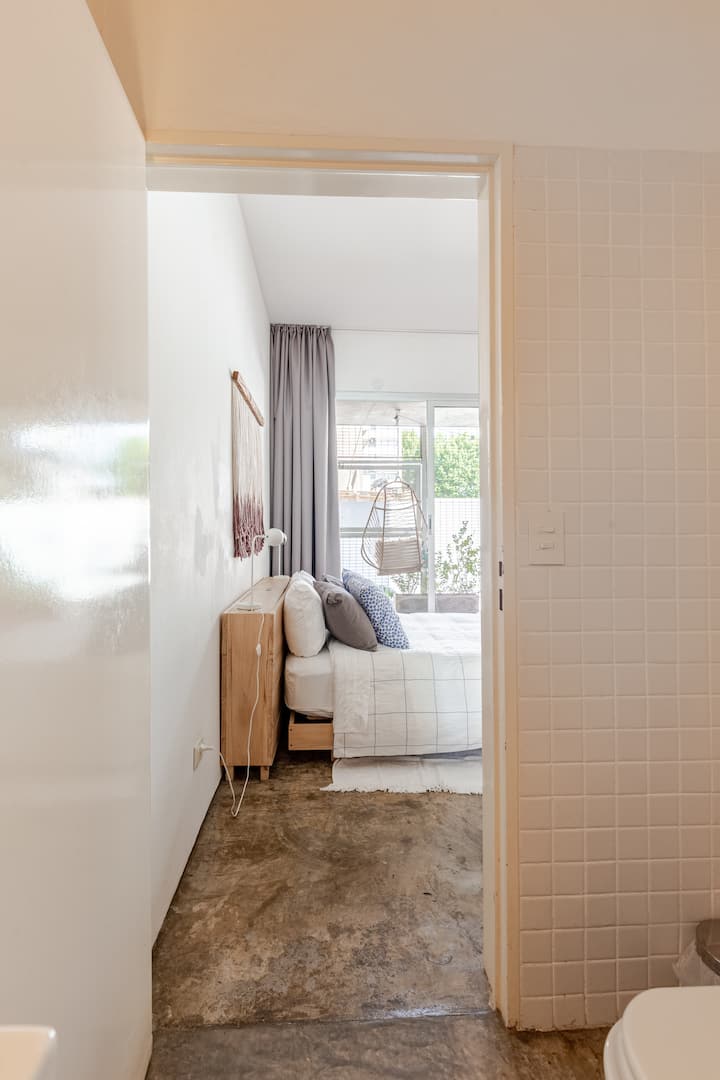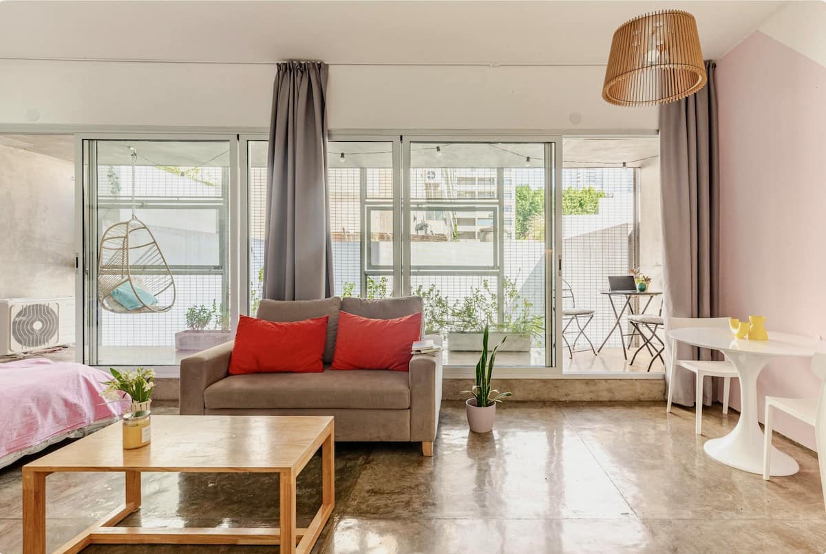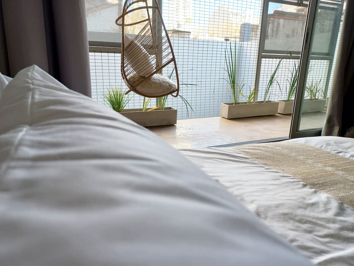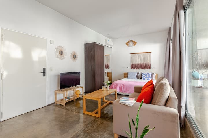 Kitnet (apartamento de um único ambiente) em Palermo Hollywood, mobiliada, com varanda ampla e iluminação natural. Cozinha equipada, com Wi-Fi de alta velocidade para videochamadas e TV Smart de 45”. O acesso é por self check-in, com adaptador universal de tomada, além de cartão de transporte e itens de lazer (jogos).