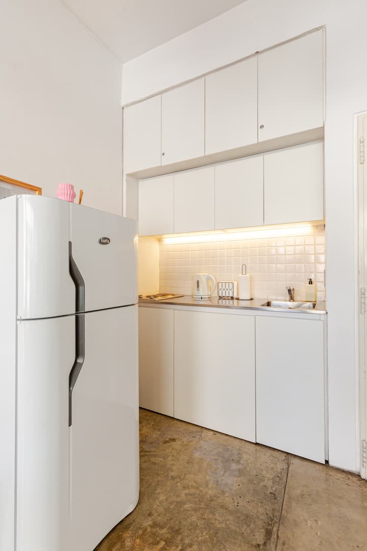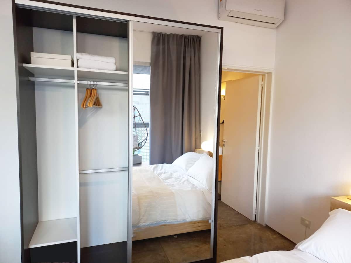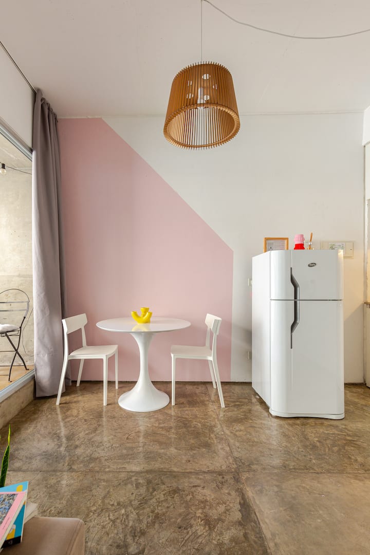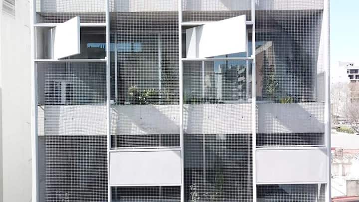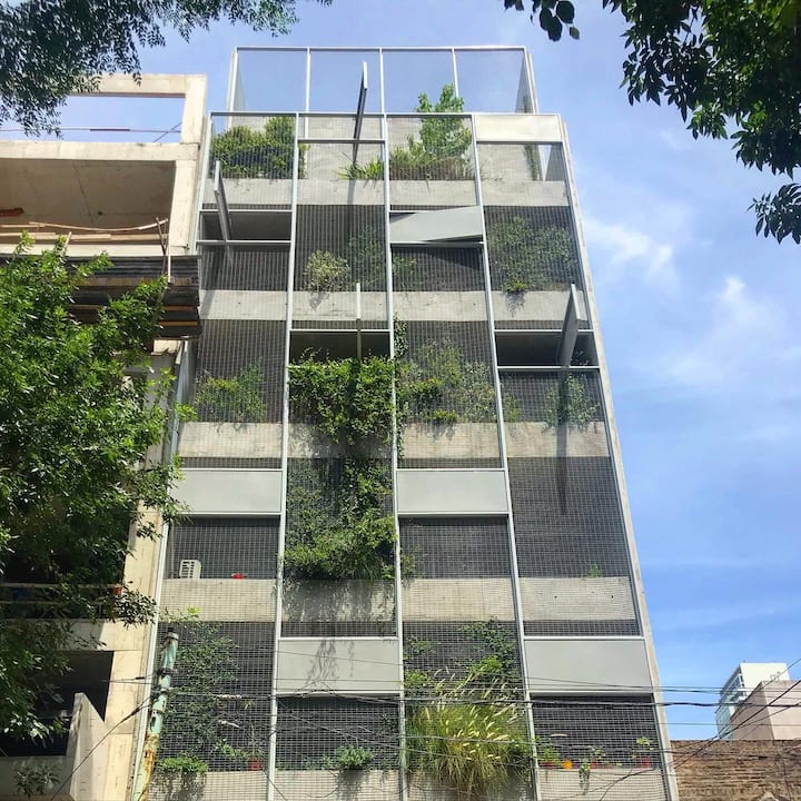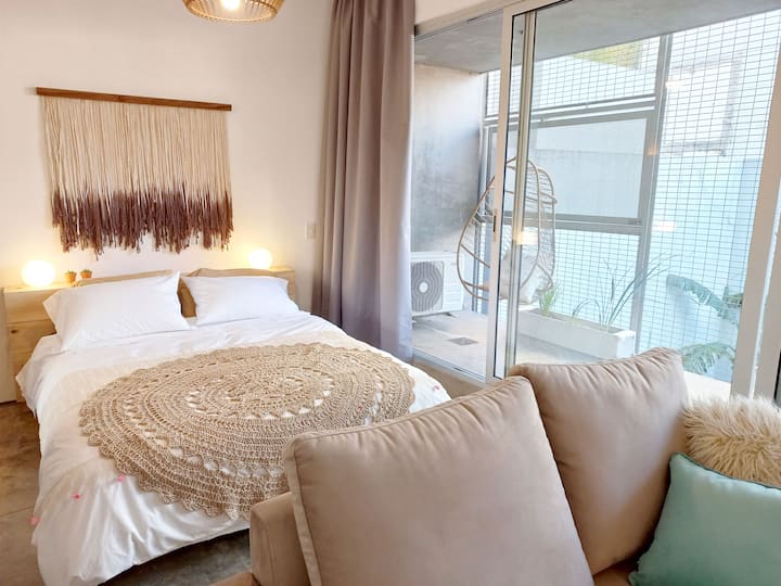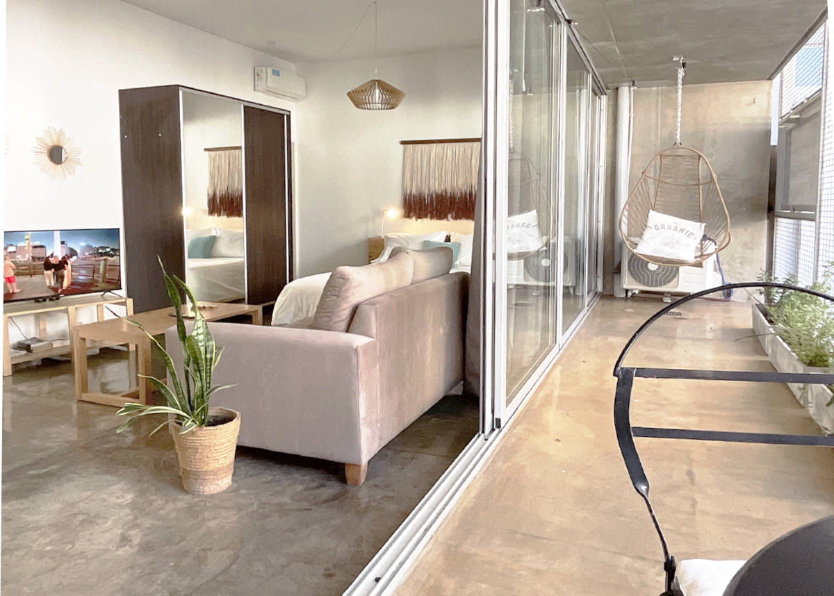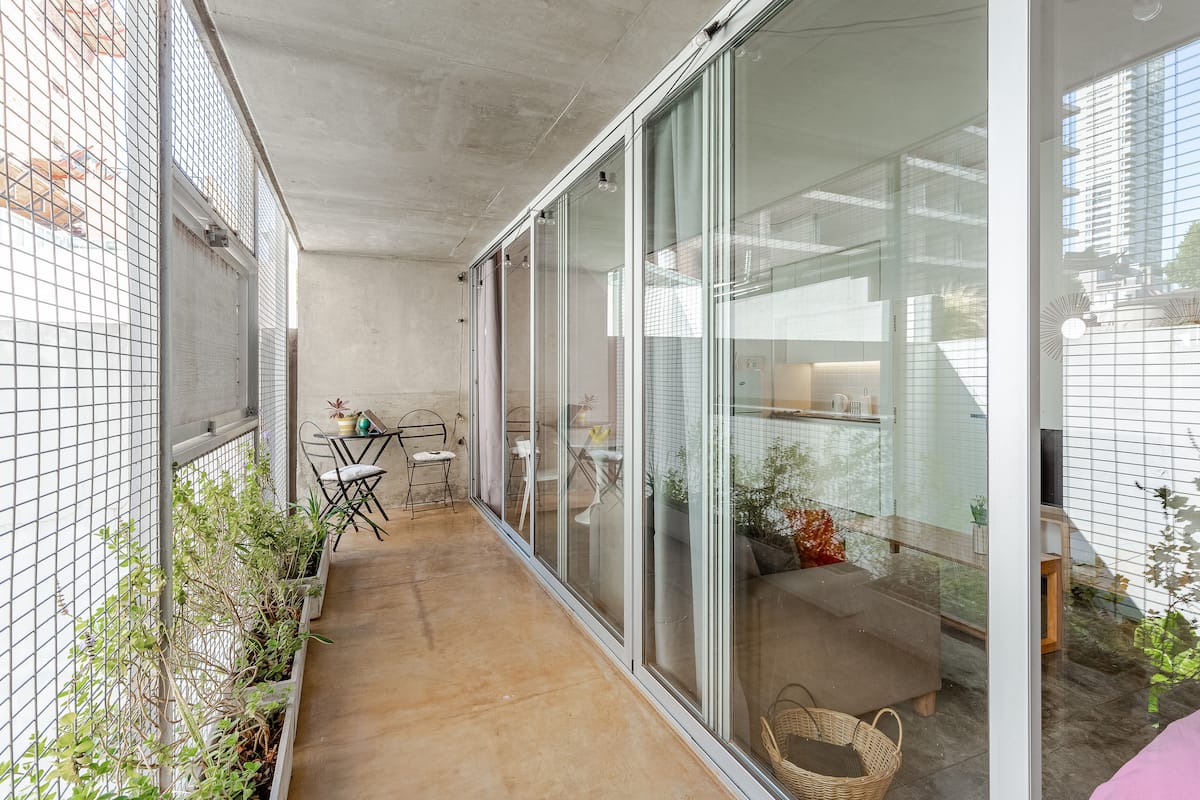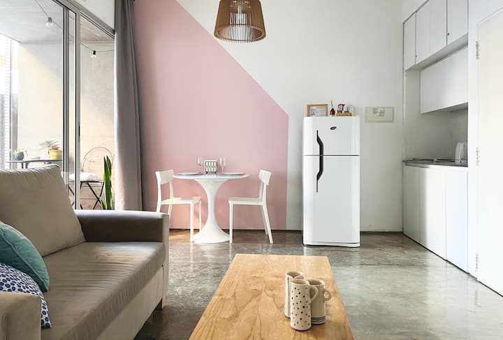 Kitnet (apartamento de um único ambiente) em Palermo Hollywood, mobiliada, com varanda ampla e iluminação natural. Cozinha equipada, com Wi-Fi de alta velocidade para videochamadas e TV Smart de 45”. O acesso é por self check-in, com adaptador universal de tomada, além de cartão de transporte e itens de lazer (jogos).