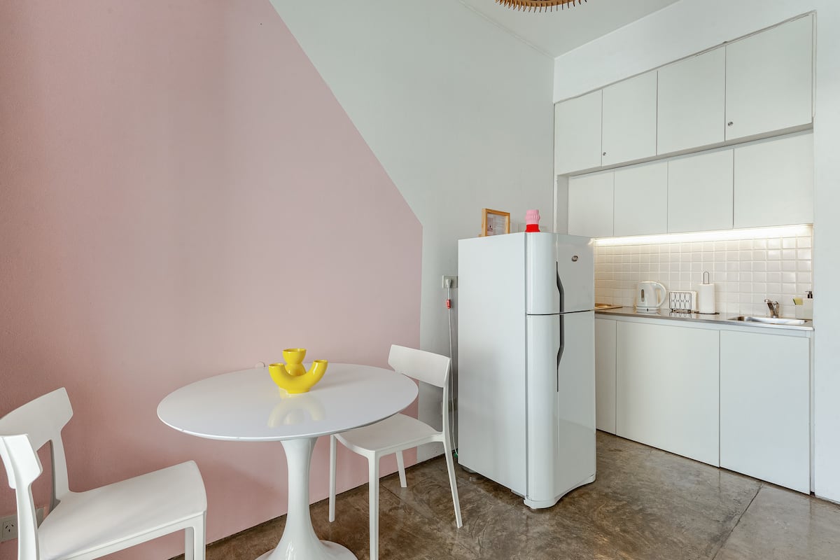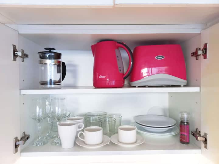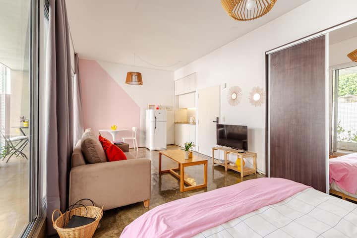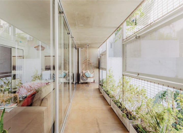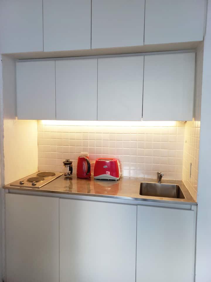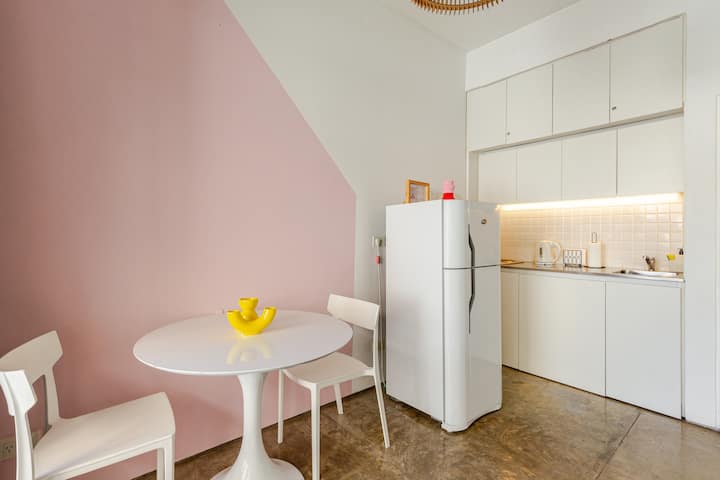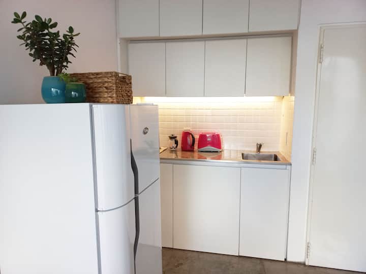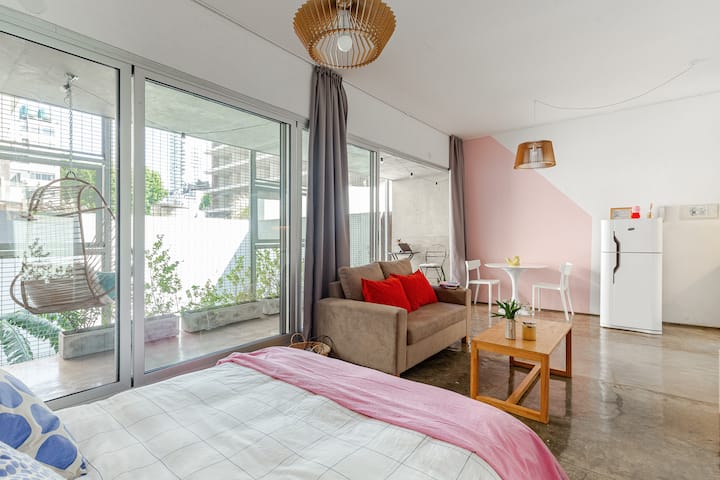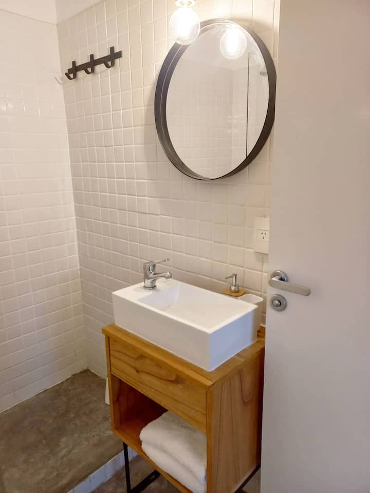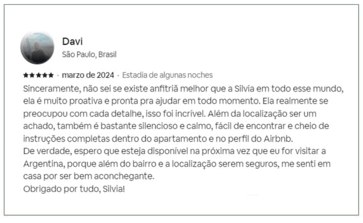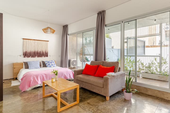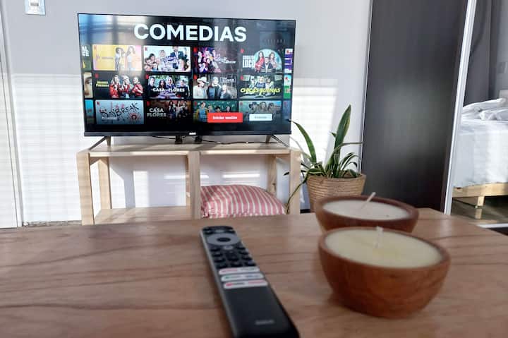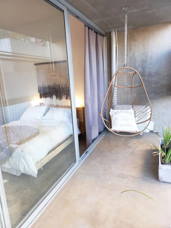 Kitnet (apartamento de um único ambiente) em Palermo Hollywood, mobiliada, com varanda ampla e iluminação natural. Cozinha equipada, com Wi-Fi de alta velocidade para videochamadas e TV Smart de 45”. O acesso é por self check-in, com adaptador universal de tomada, além de cartão de transporte e itens de lazer (jogos).