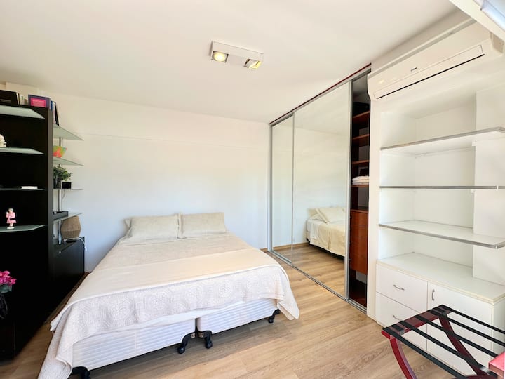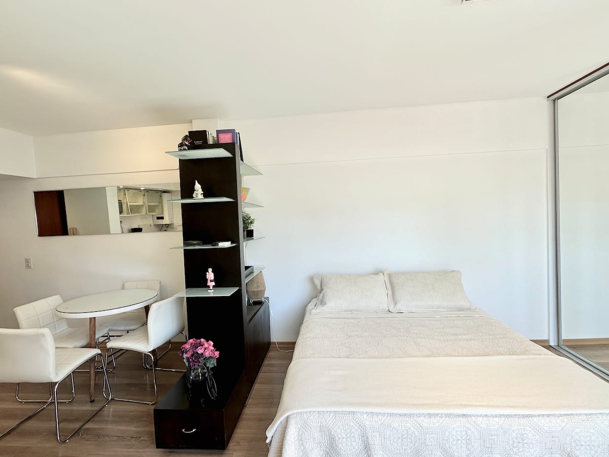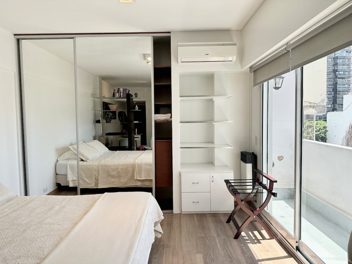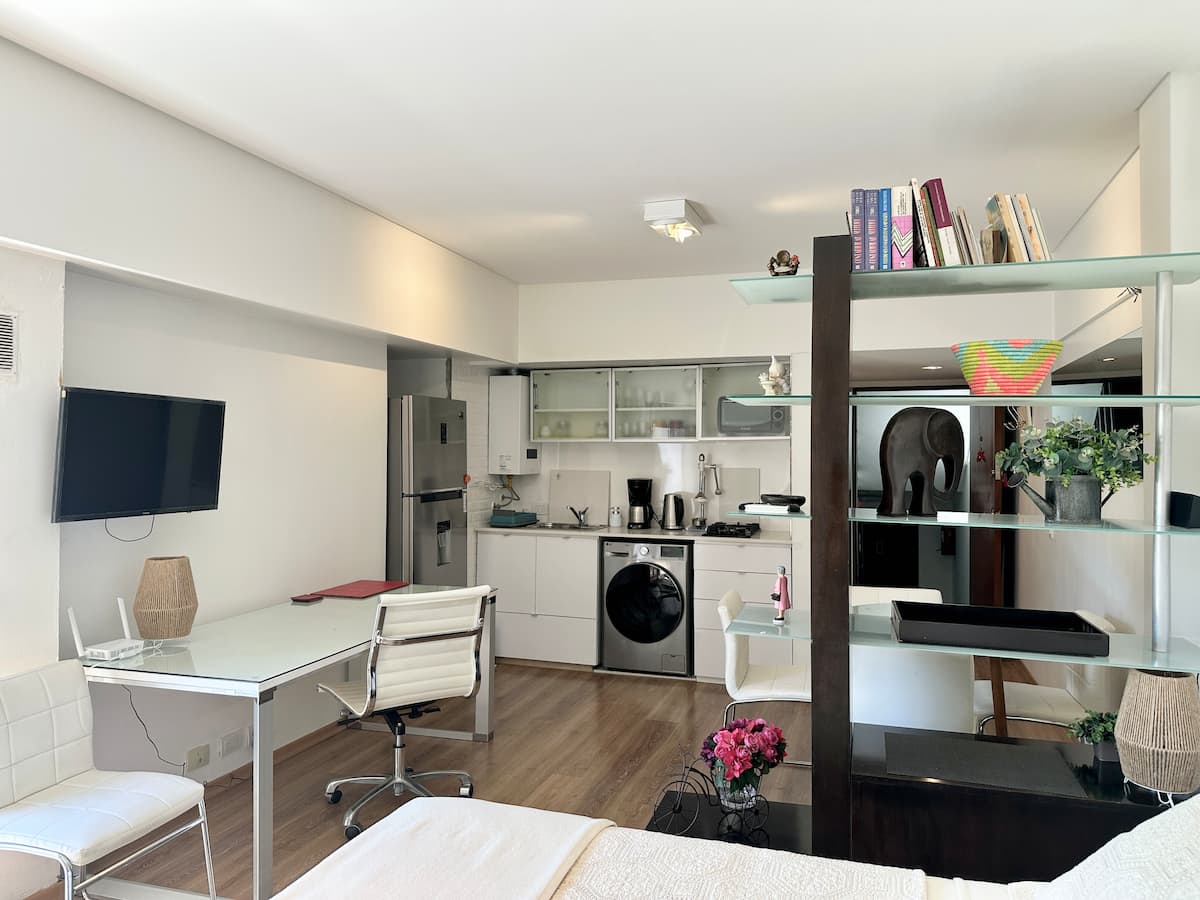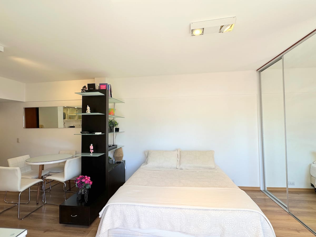 Kitnet de 40 m² em Palermo, em edifício com portaria e elevador. Possui grande janela com ventilação e acesso a uma varanda com vista panorâmica. Inclui Wi-Fi de alta velocidade, TV a cabo, DVD, telefone e ar-condicionado (quente e frio), além de piso de madeira, armário amplo e banheiro completo com box e banheira.