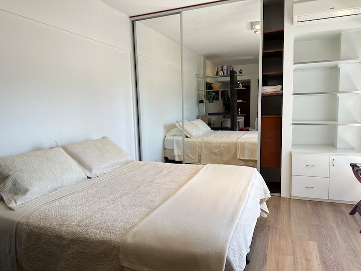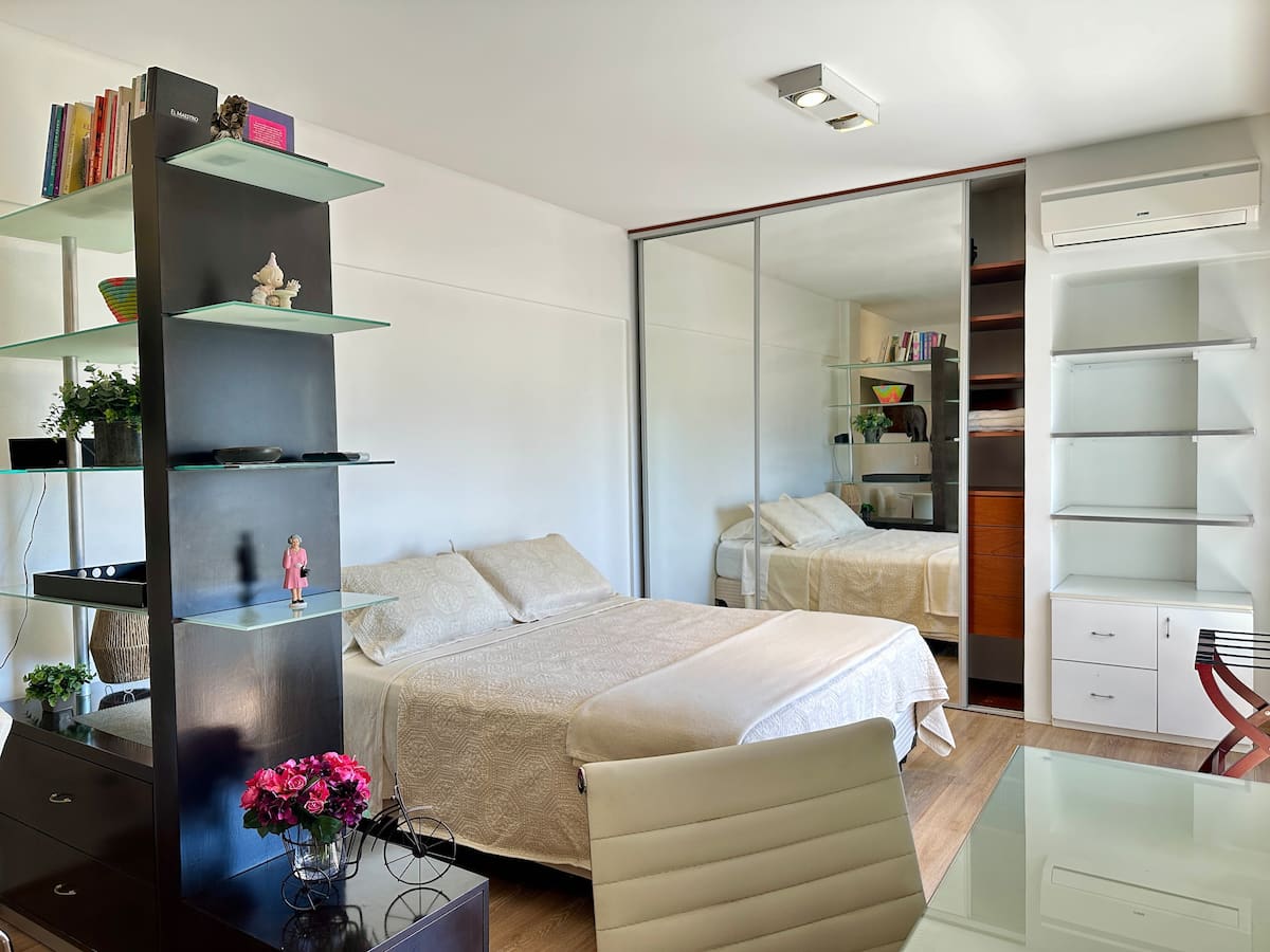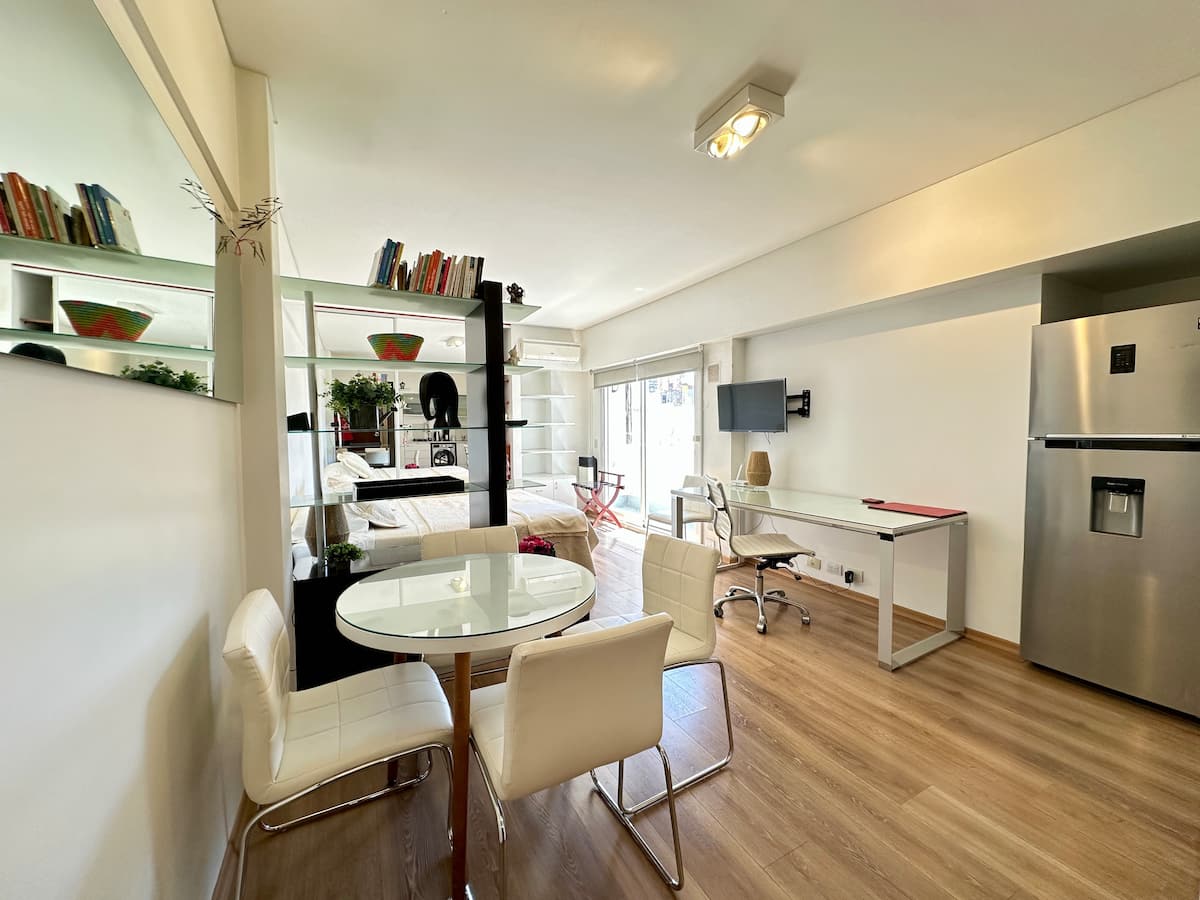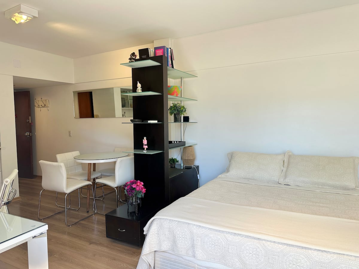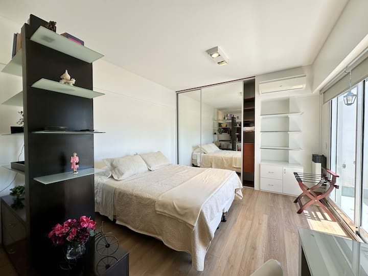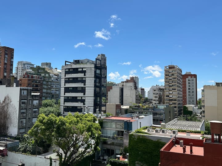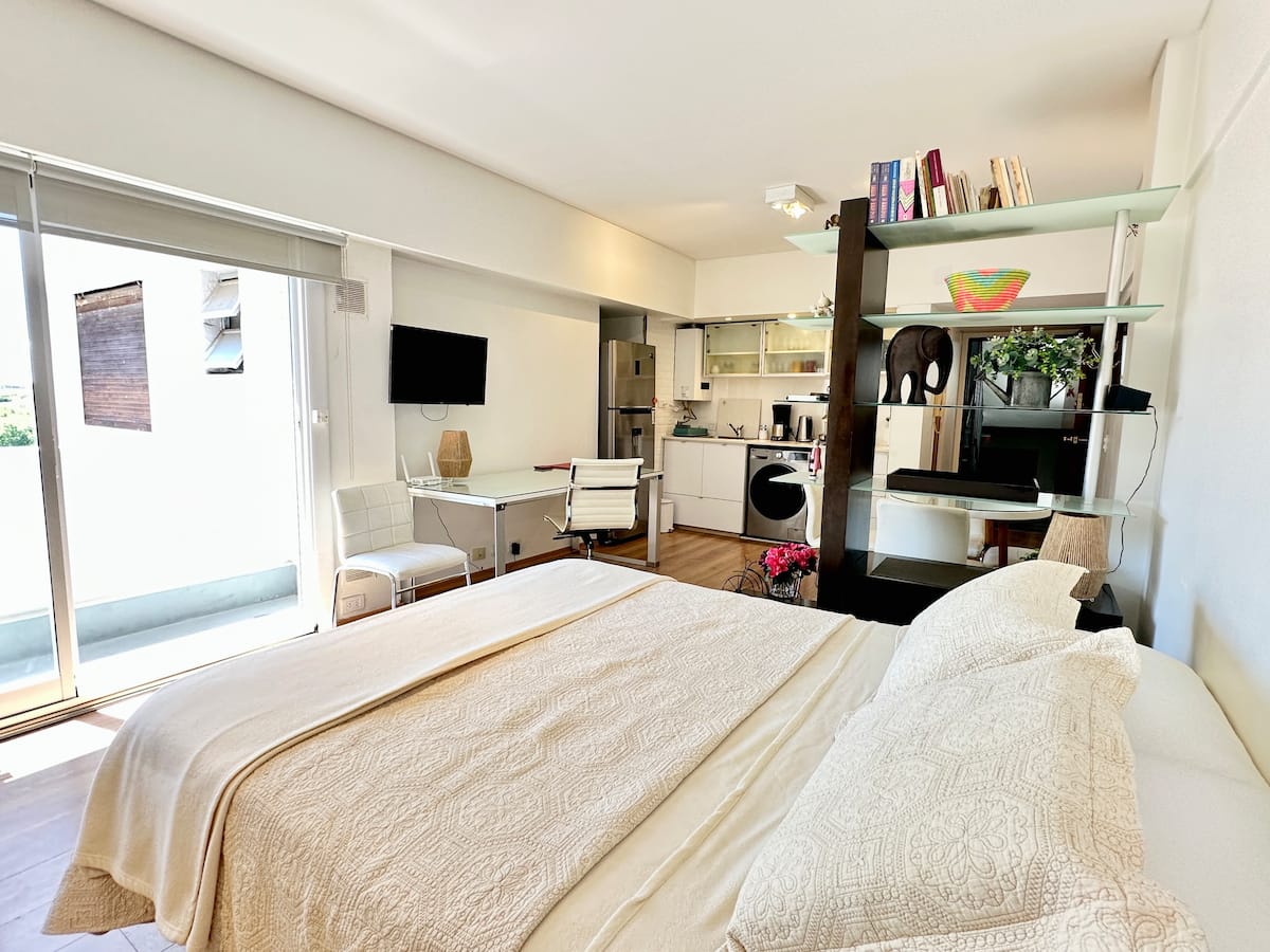 Kitnet de 40 m² em Palermo, em edifício com portaria e elevador. Possui grande janela com ventilação e acesso a uma varanda com vista panorâmica. Inclui Wi-Fi de alta velocidade, TV a cabo, DVD, telefone e ar-condicionado (quente e frio), além de piso de madeira, armário amplo e banheiro completo com box e banheira.