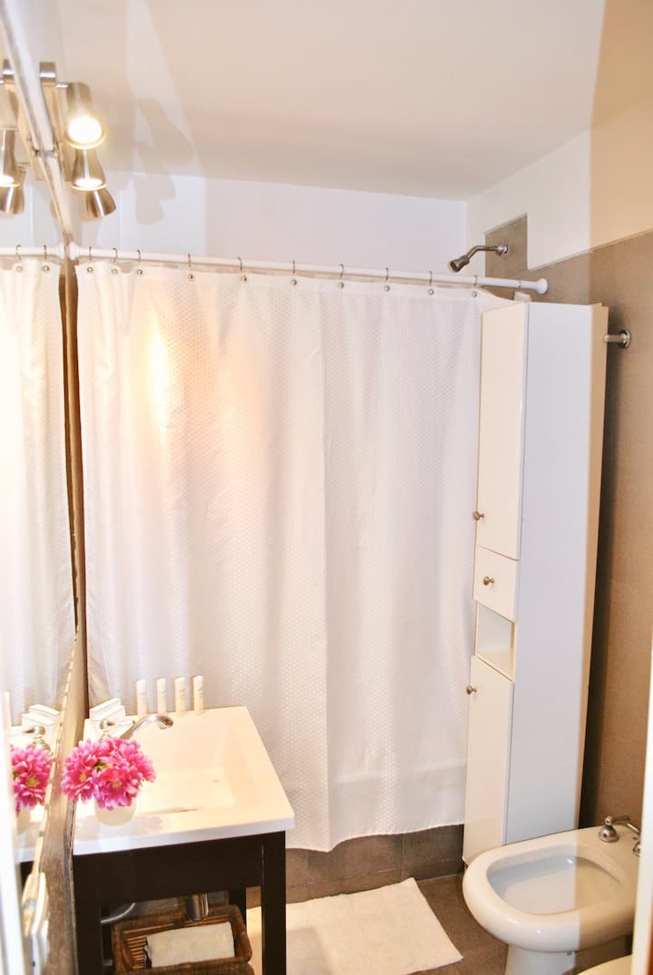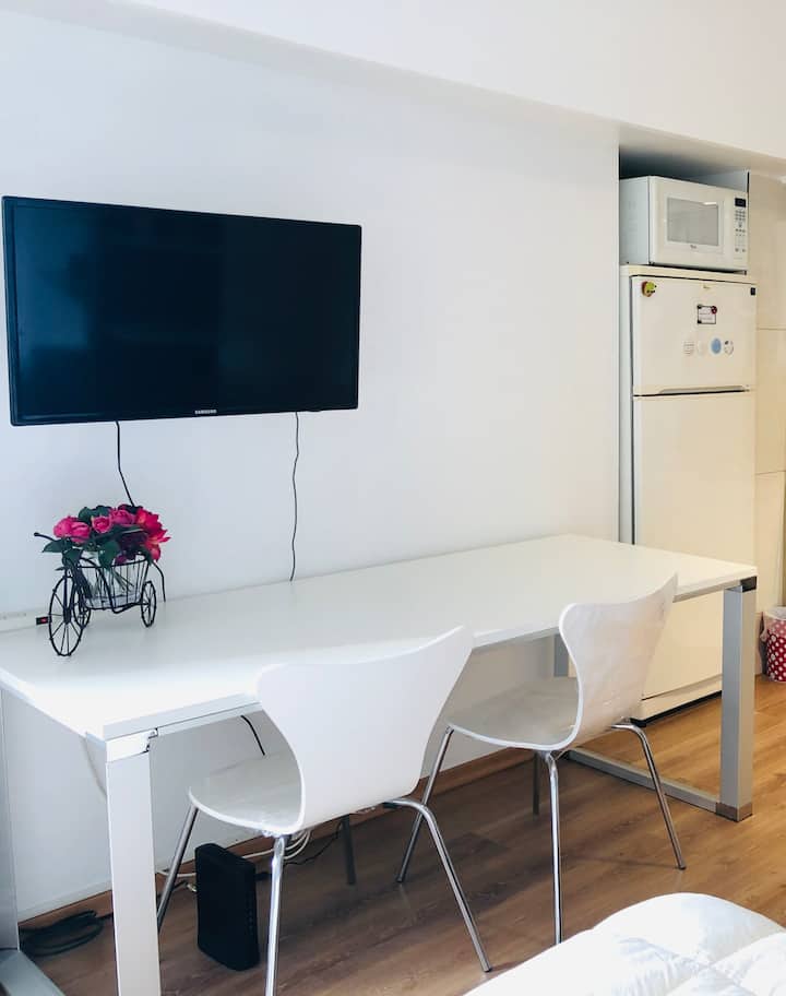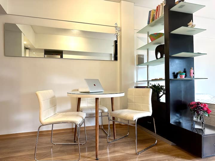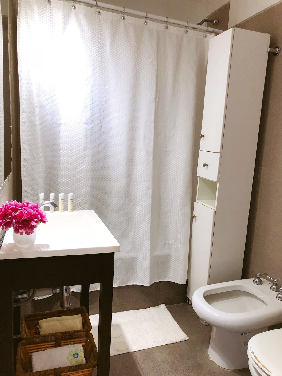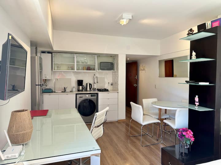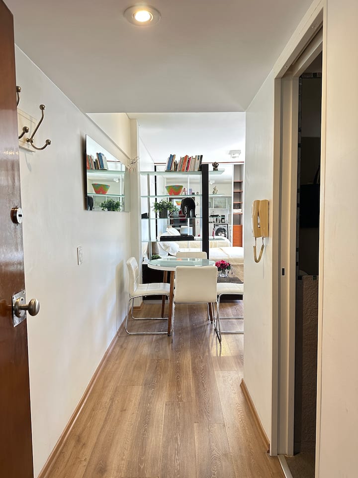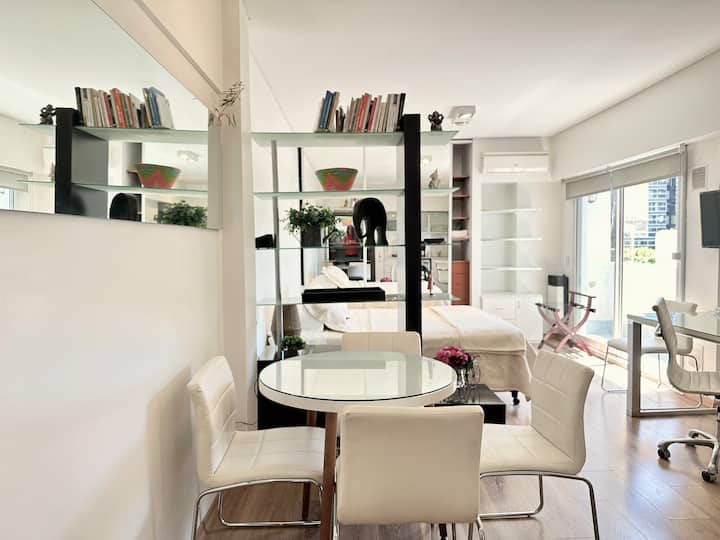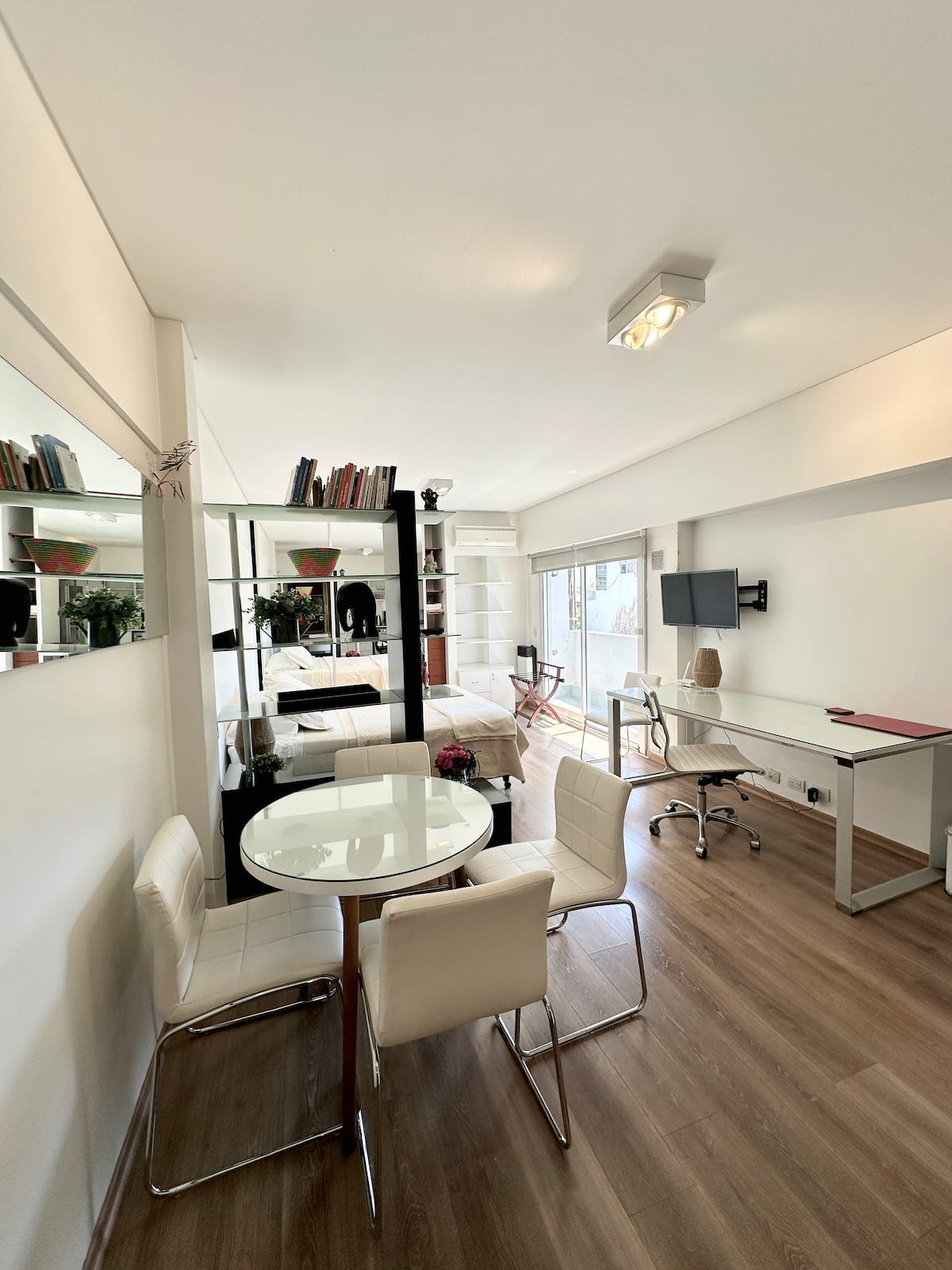 Kitnet de 40 m² em Palermo, em edifício com portaria e elevador. Possui grande janela com ventilação e acesso a uma varanda com vista panorâmica. Inclui Wi-Fi de alta velocidade, TV a cabo, DVD, telefone e ar-condicionado (quente e frio), além de piso de madeira, armário amplo e banheiro completo com box e banheira.