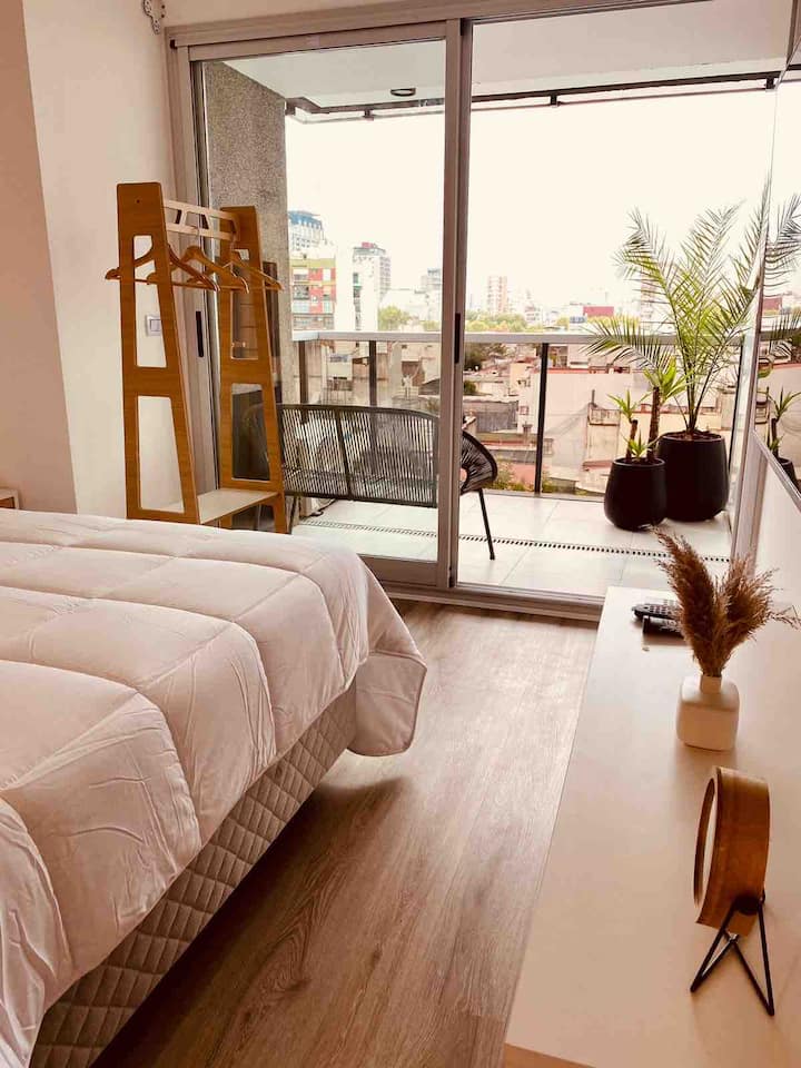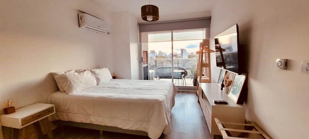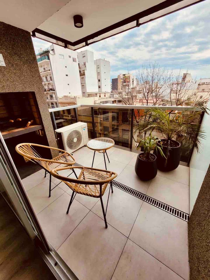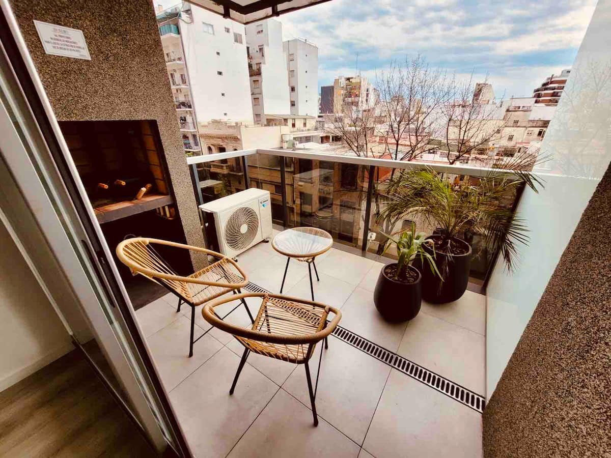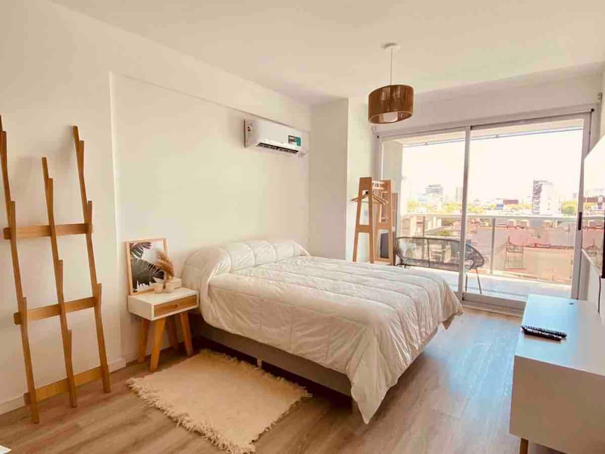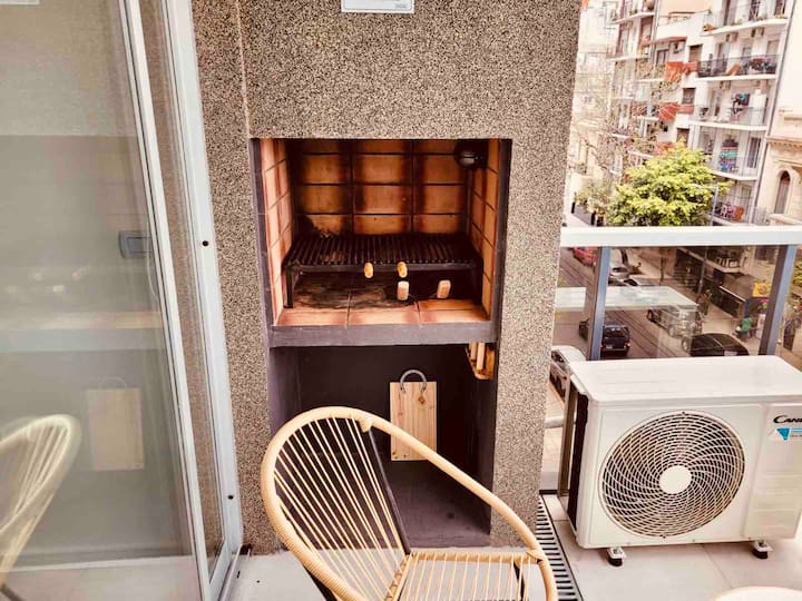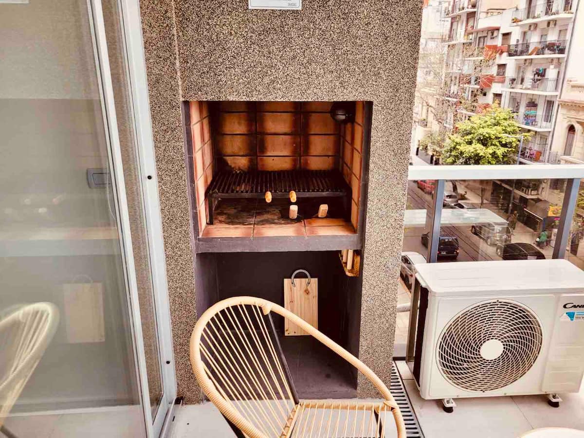 Apartamento mobiliado em Palermo Soho. Unidade de um ambiente com cama queen, roupas de cama e toalhas, utensílios de cozinha, itens de cortesia como café e chá, água quente, ar-condicionado e aquecimento. Inclui TV com streaming e aplicativos, internet Wi‑Fi de alta velocidade (300 MB), churrasqueira privativa na varanda e academia no próprio edifício. Acesso às áreas comuns e privativas do imóvel.