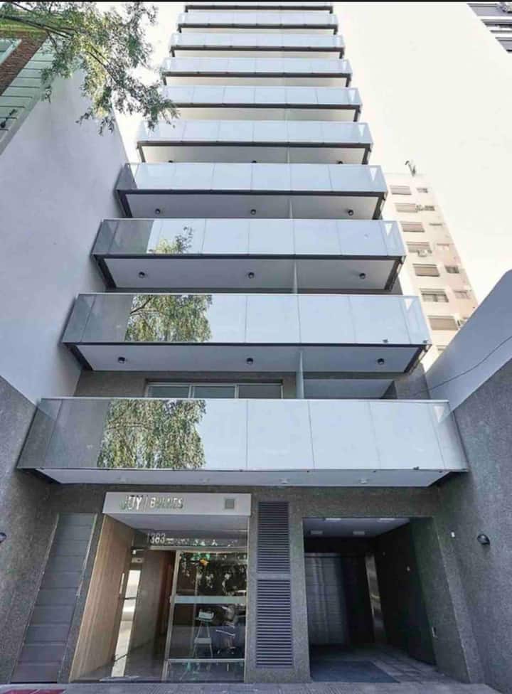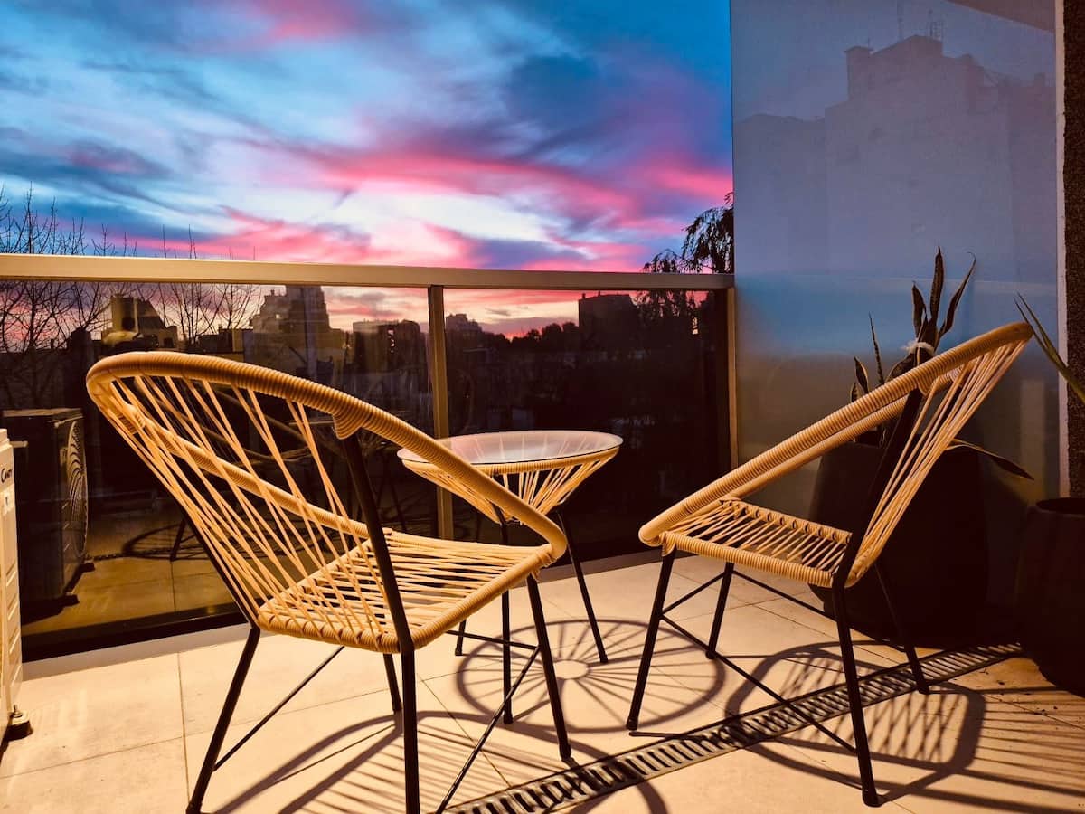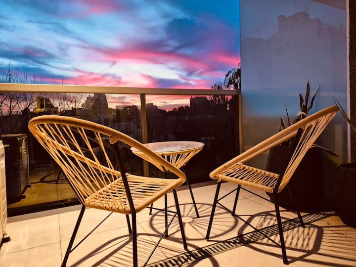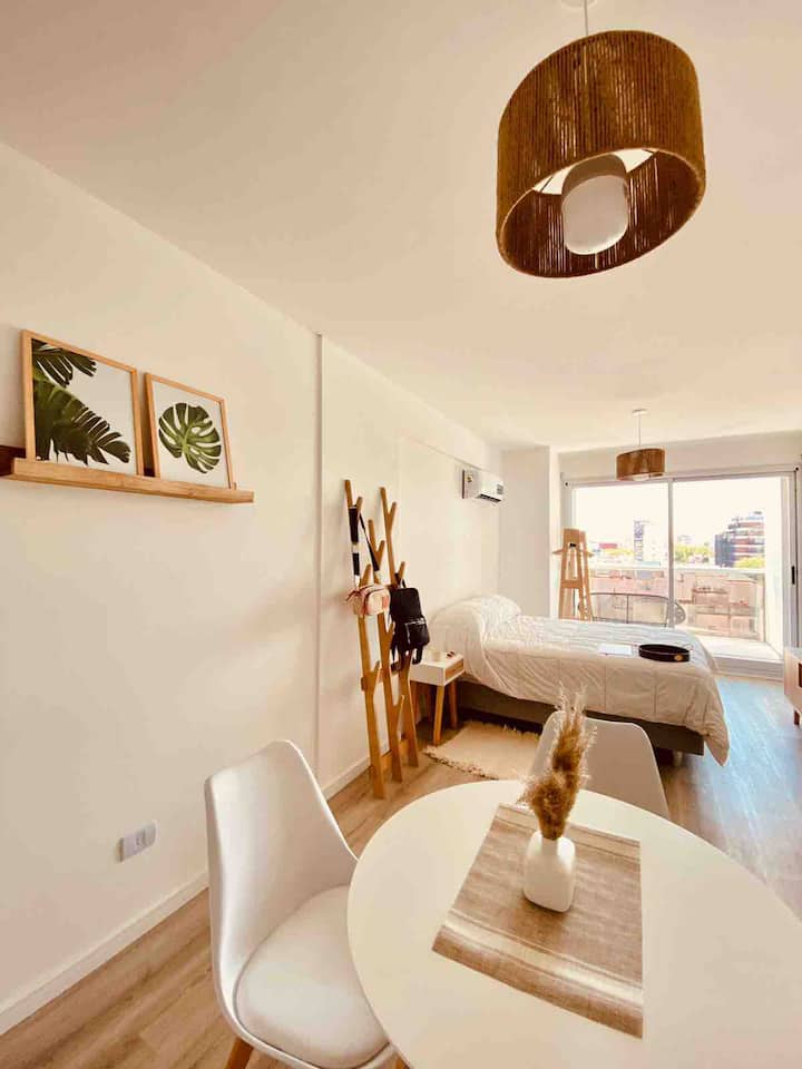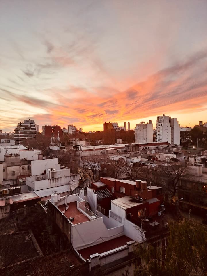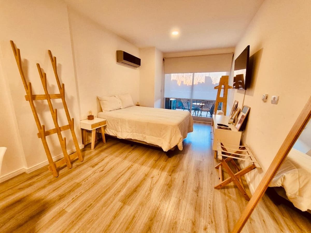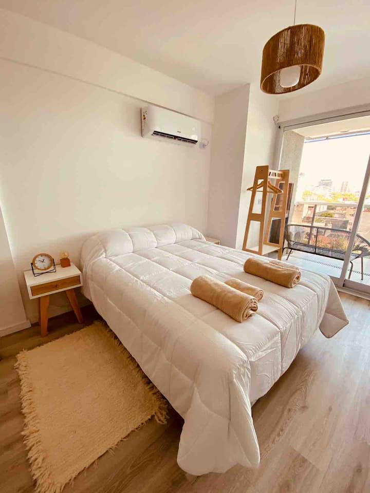 Apartamento mobiliado em Palermo Soho. Unidade de um ambiente com cama queen, roupas de cama e toalhas, utensílios de cozinha, itens de cortesia como café e chá, água quente, ar-condicionado e aquecimento. Inclui TV com streaming e aplicativos, internet Wi‑Fi de alta velocidade (300 MB), churrasqueira privativa na varanda e academia no próprio edifício. Acesso às áreas comuns e privativas do imóvel.