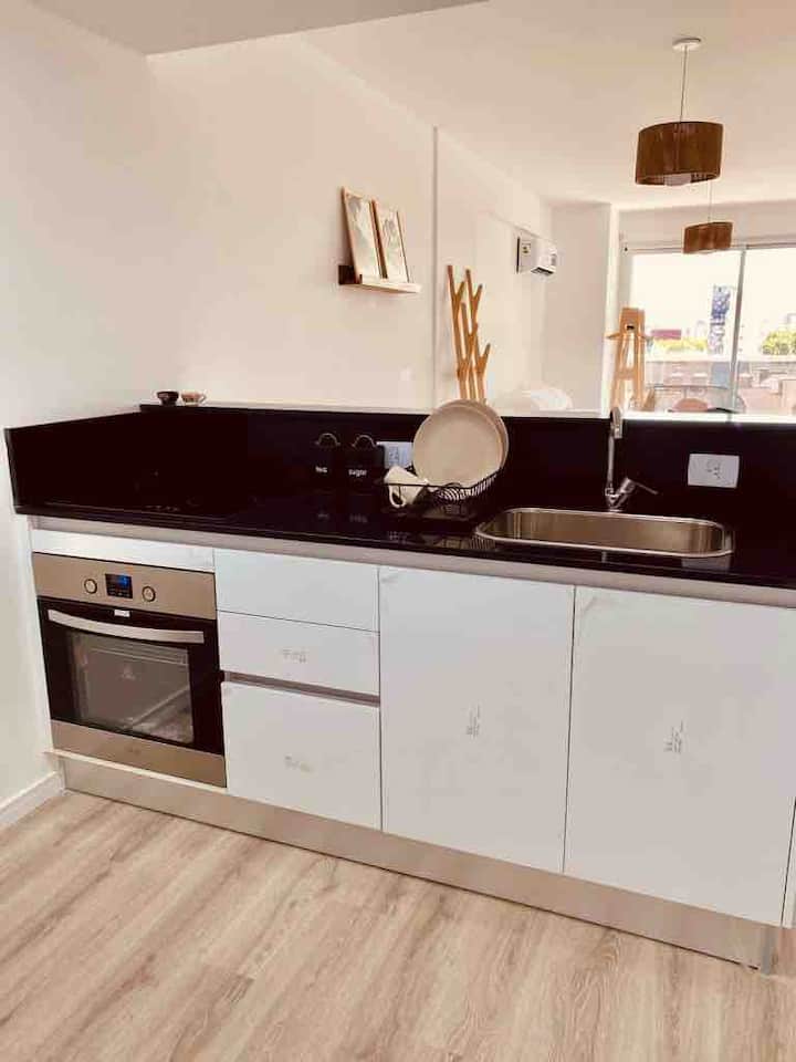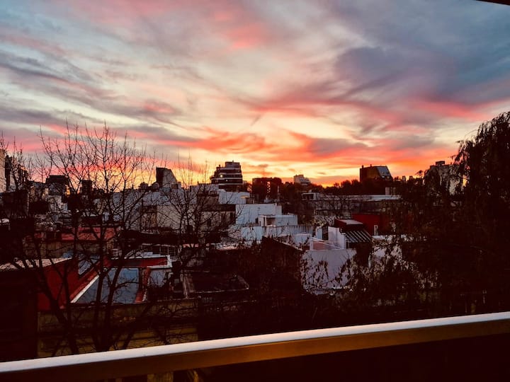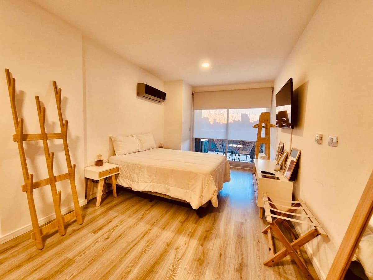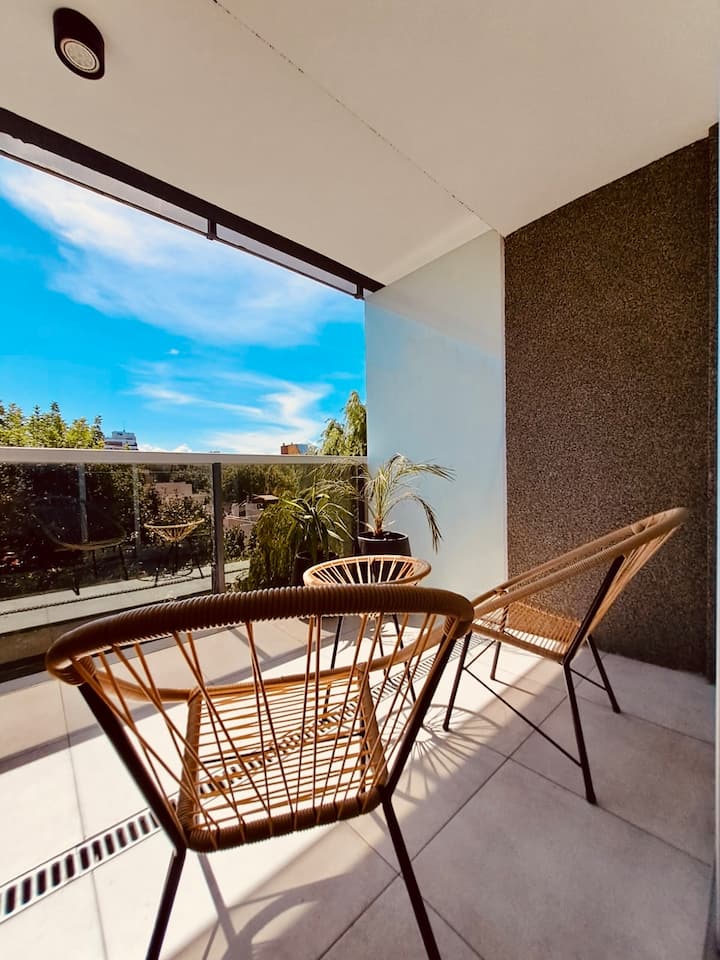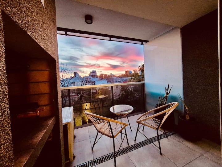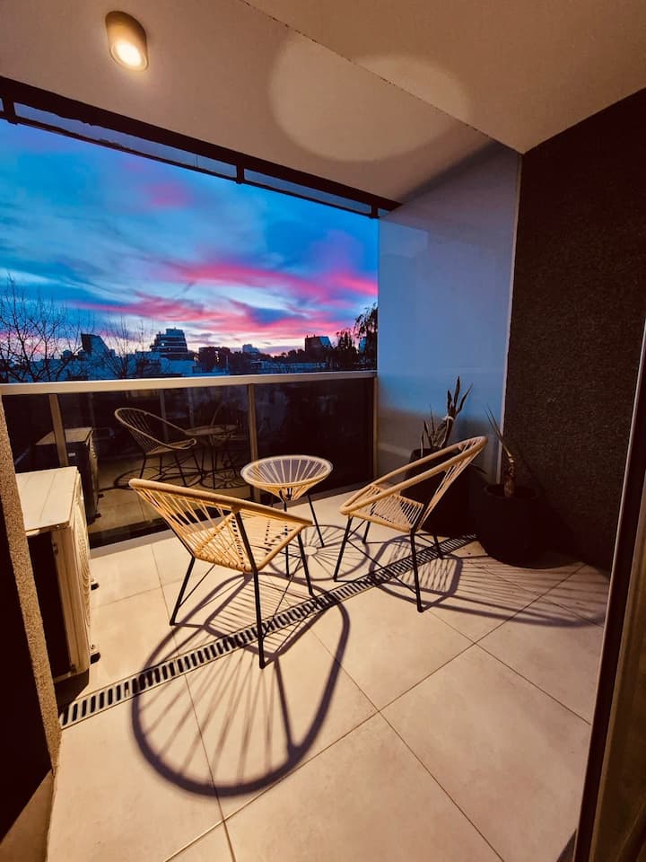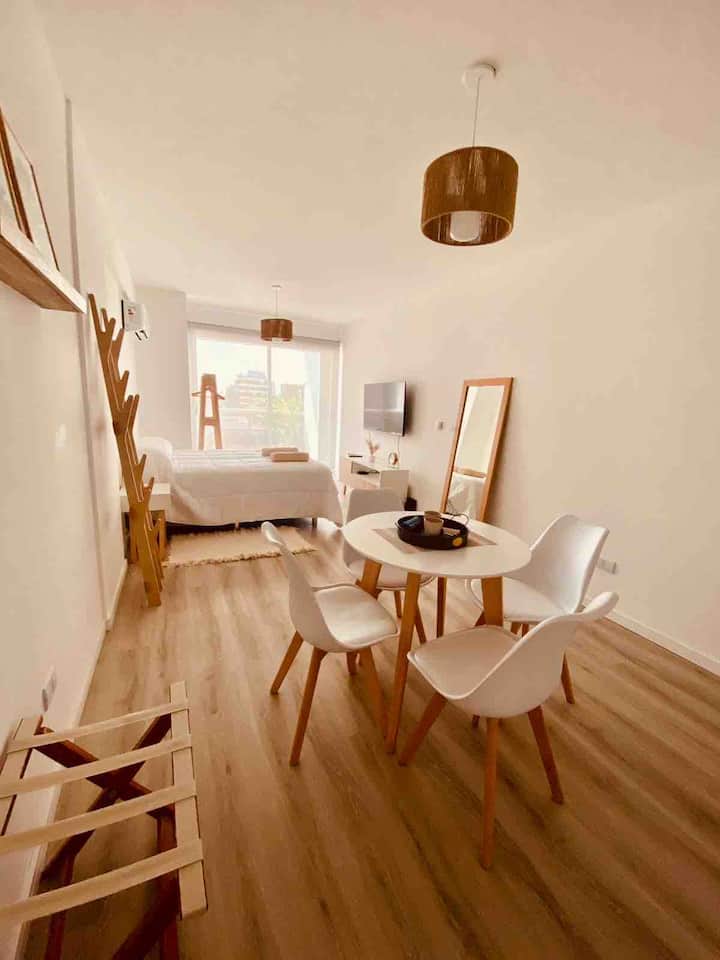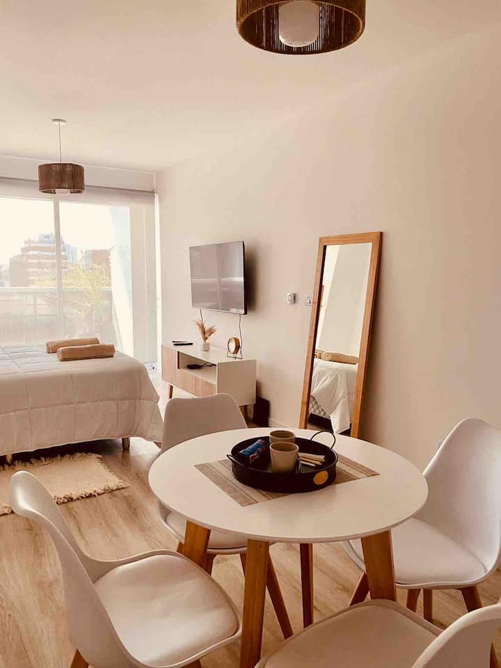 Apartamento mobiliado em Palermo Soho. Unidade de um ambiente com cama queen, roupas de cama e toalhas, utensílios de cozinha, itens de cortesia como café e chá, água quente, ar-condicionado e aquecimento. Inclui TV com streaming e aplicativos, internet Wi‑Fi de alta velocidade (300 MB), churrasqueira privativa na varanda e academia no próprio edifício. Acesso às áreas comuns e privativas do imóvel.