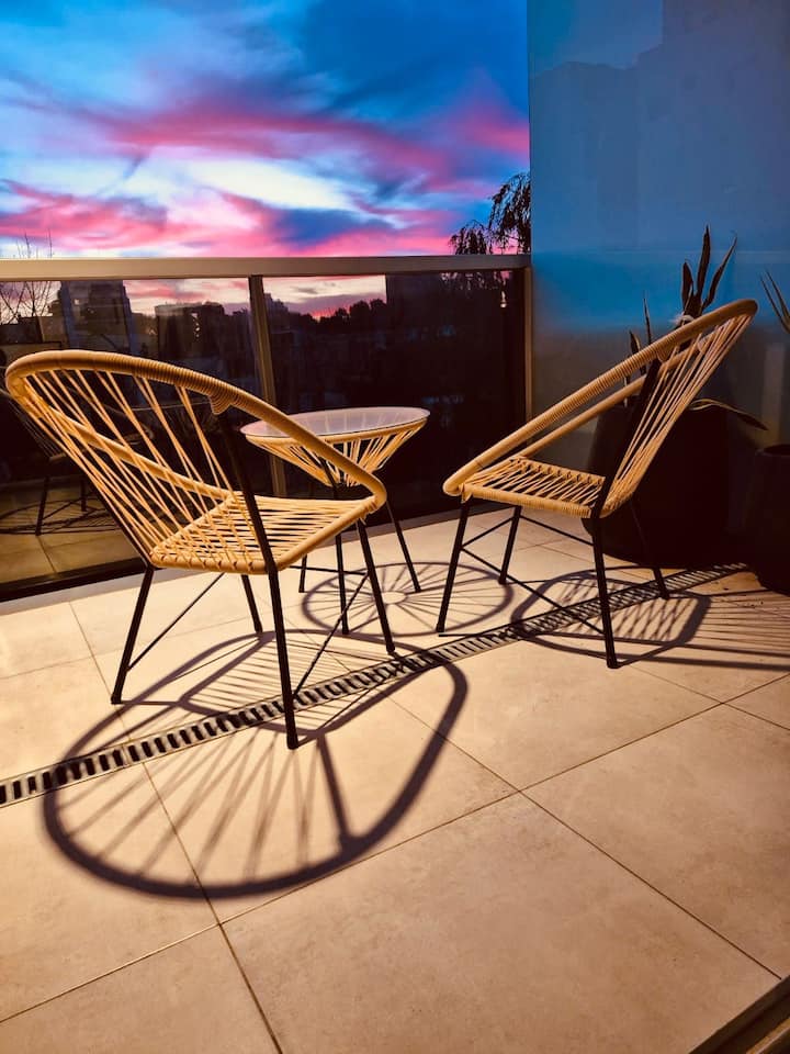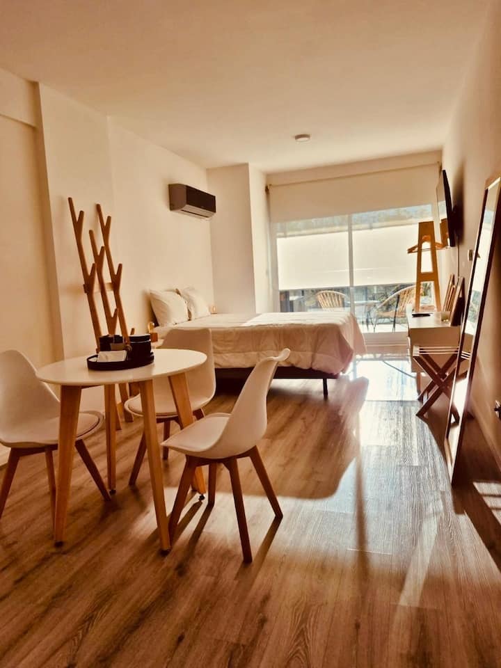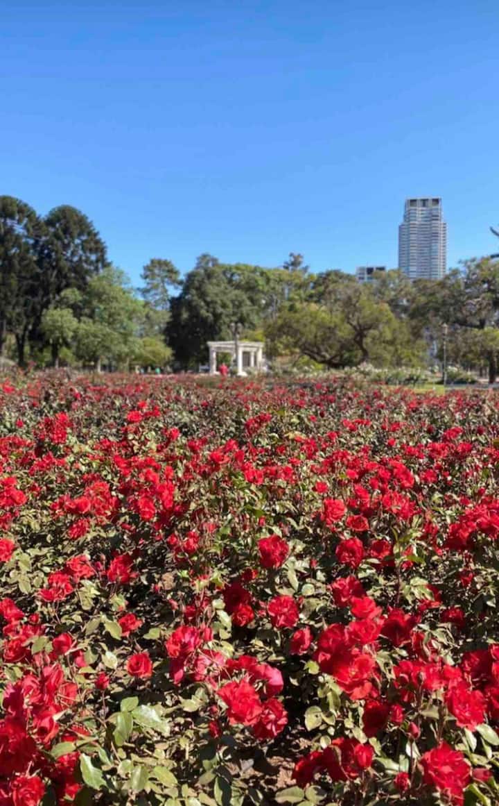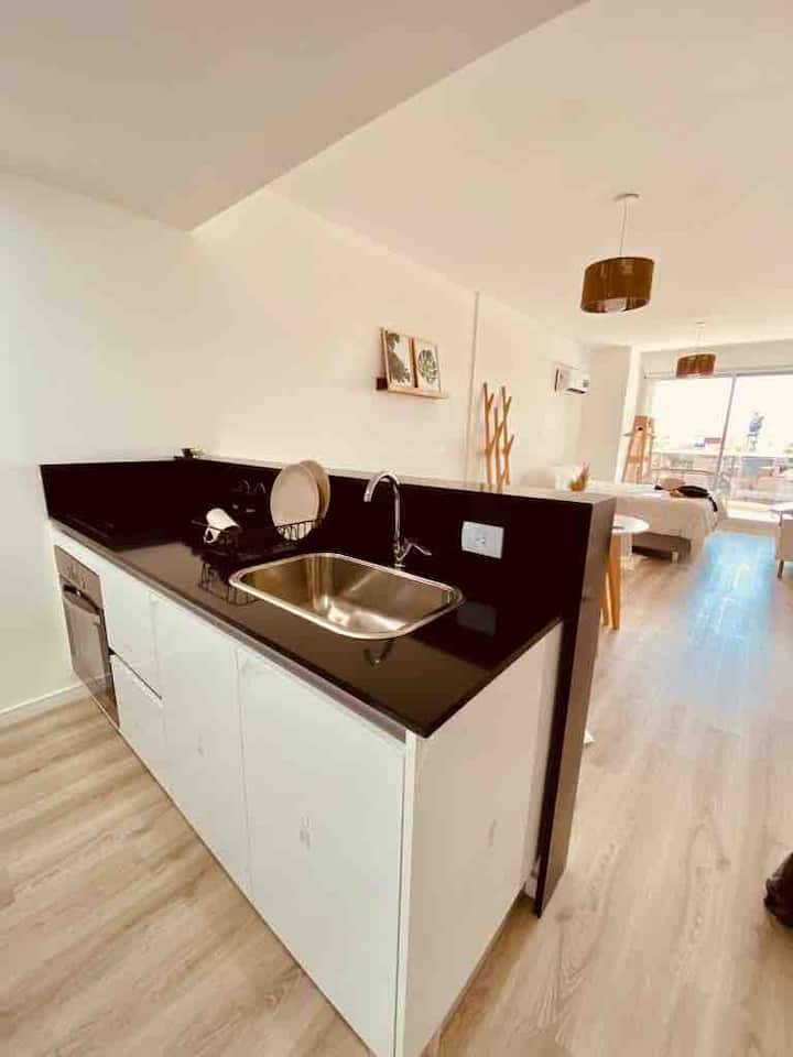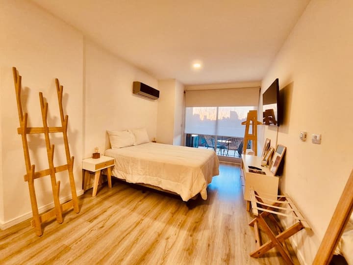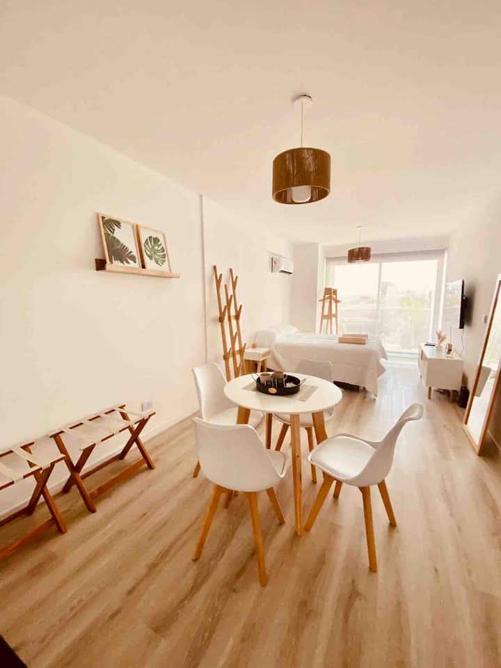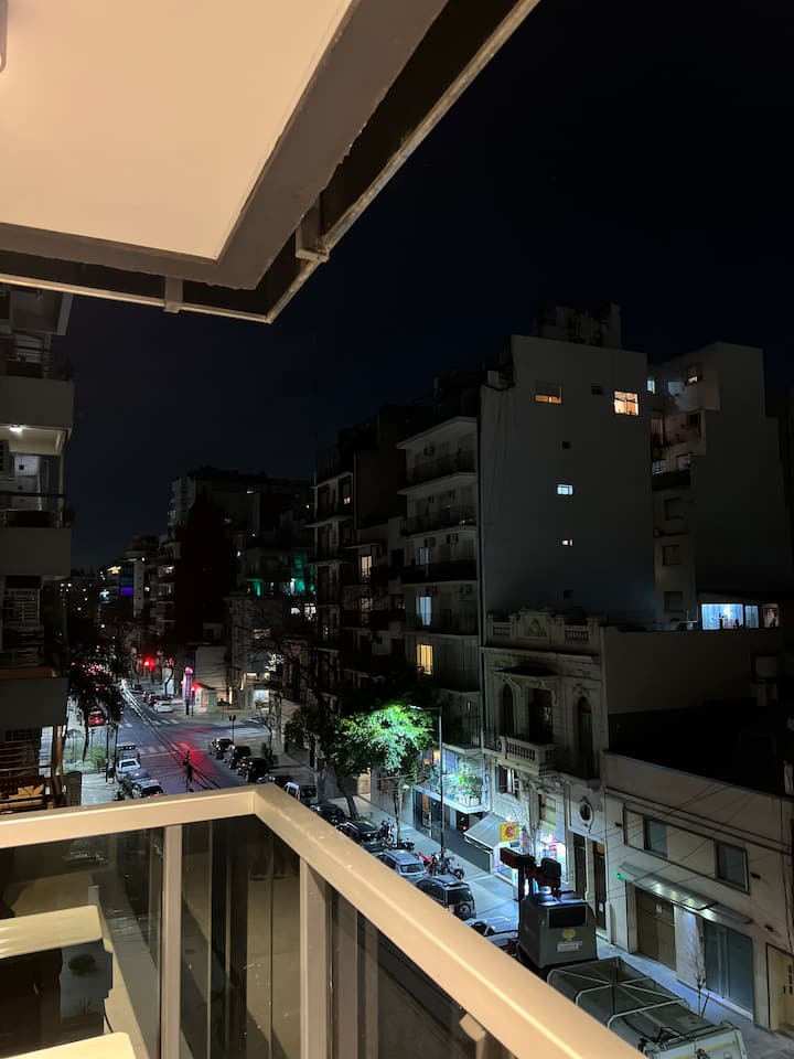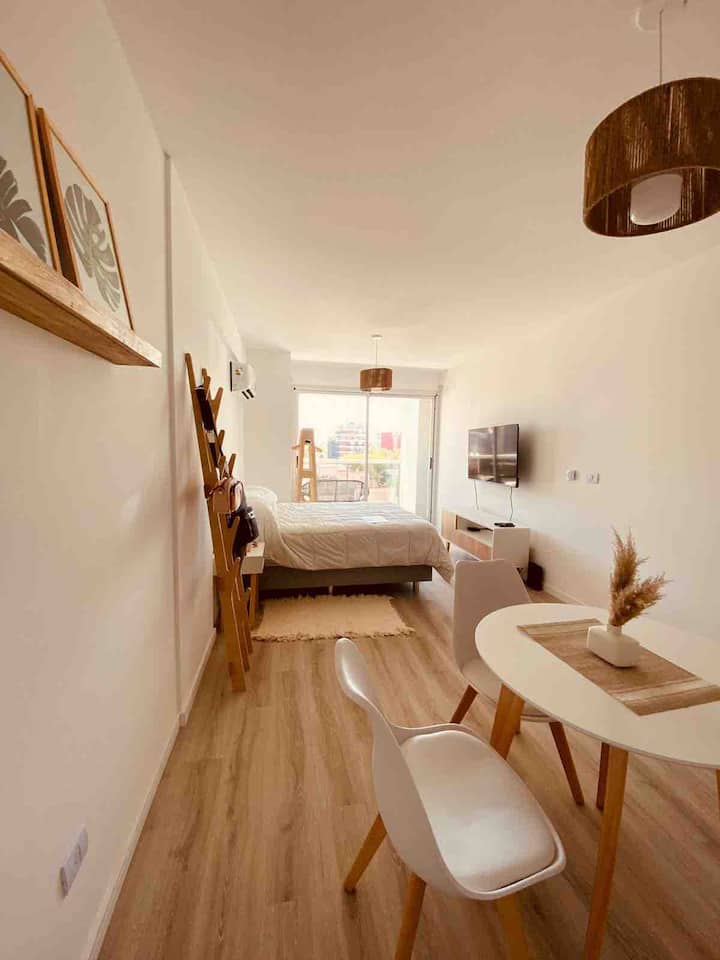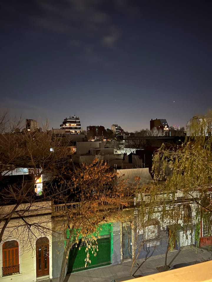 Apartamento mobiliado em Palermo Soho. Unidade de um ambiente com cama queen, roupas de cama e toalhas, utensílios de cozinha, itens de cortesia como café e chá, água quente, ar-condicionado e aquecimento. Inclui TV com streaming e aplicativos, internet Wi‑Fi de alta velocidade (300 MB), churrasqueira privativa na varanda e academia no próprio edifício. Acesso às áreas comuns e privativas do imóvel.