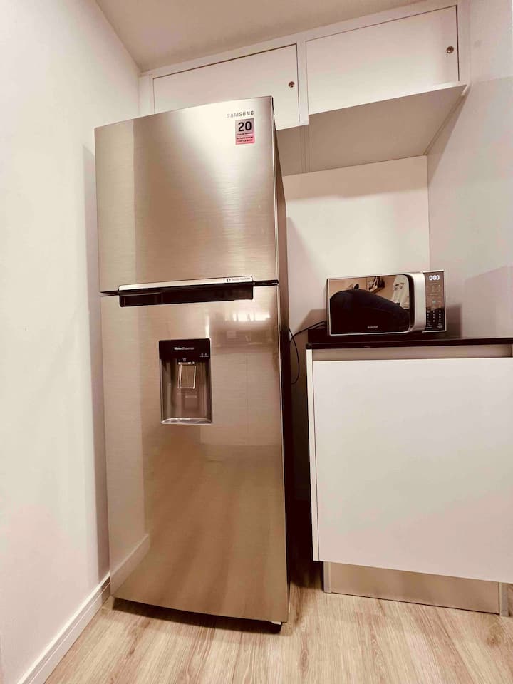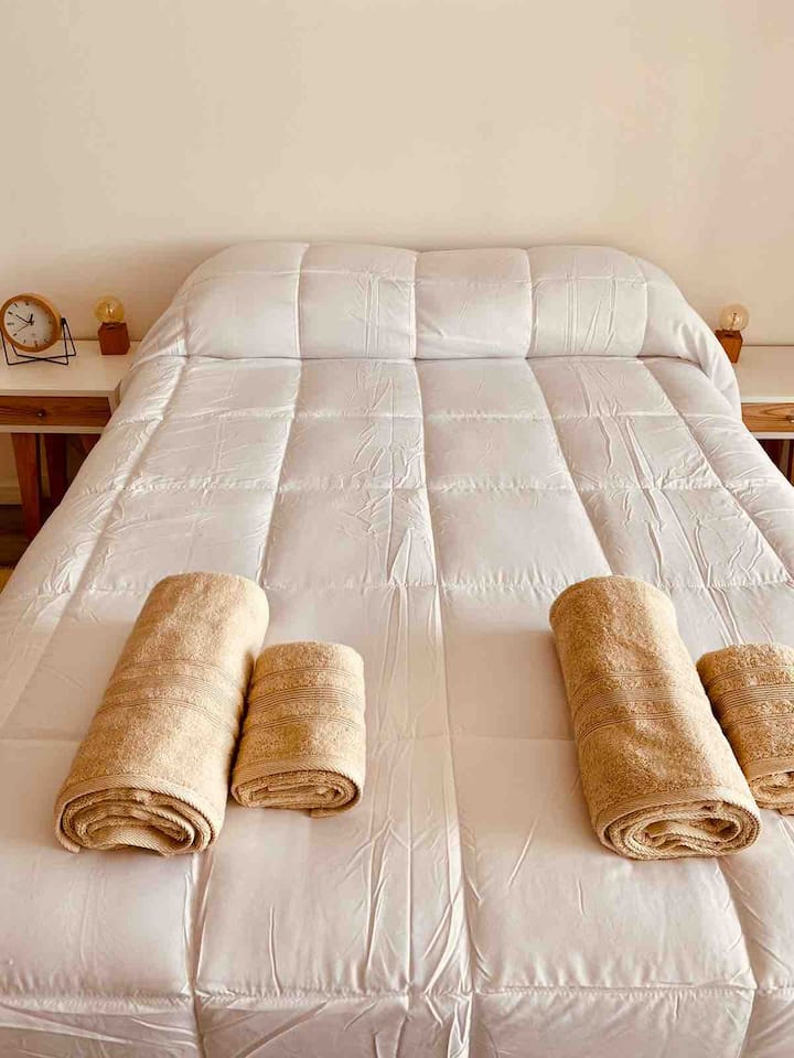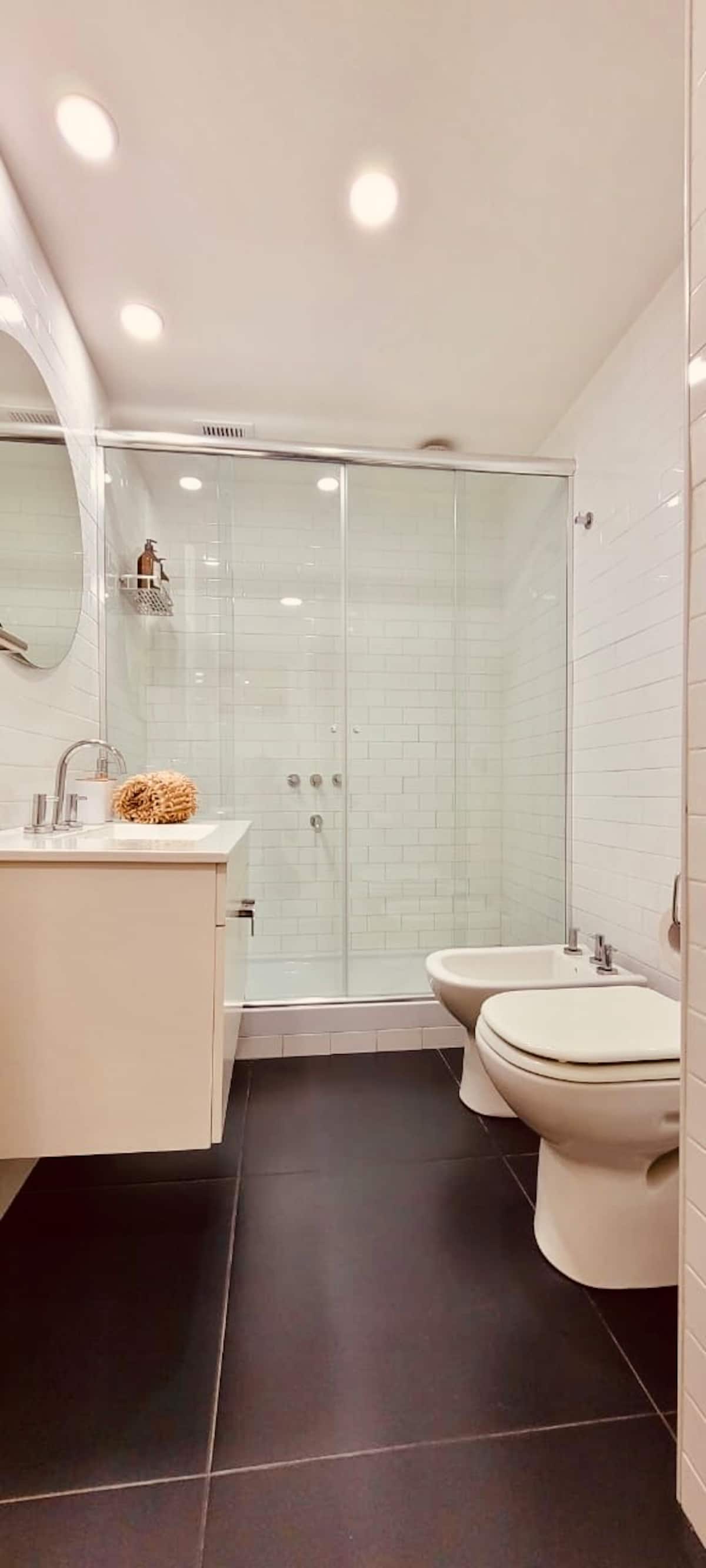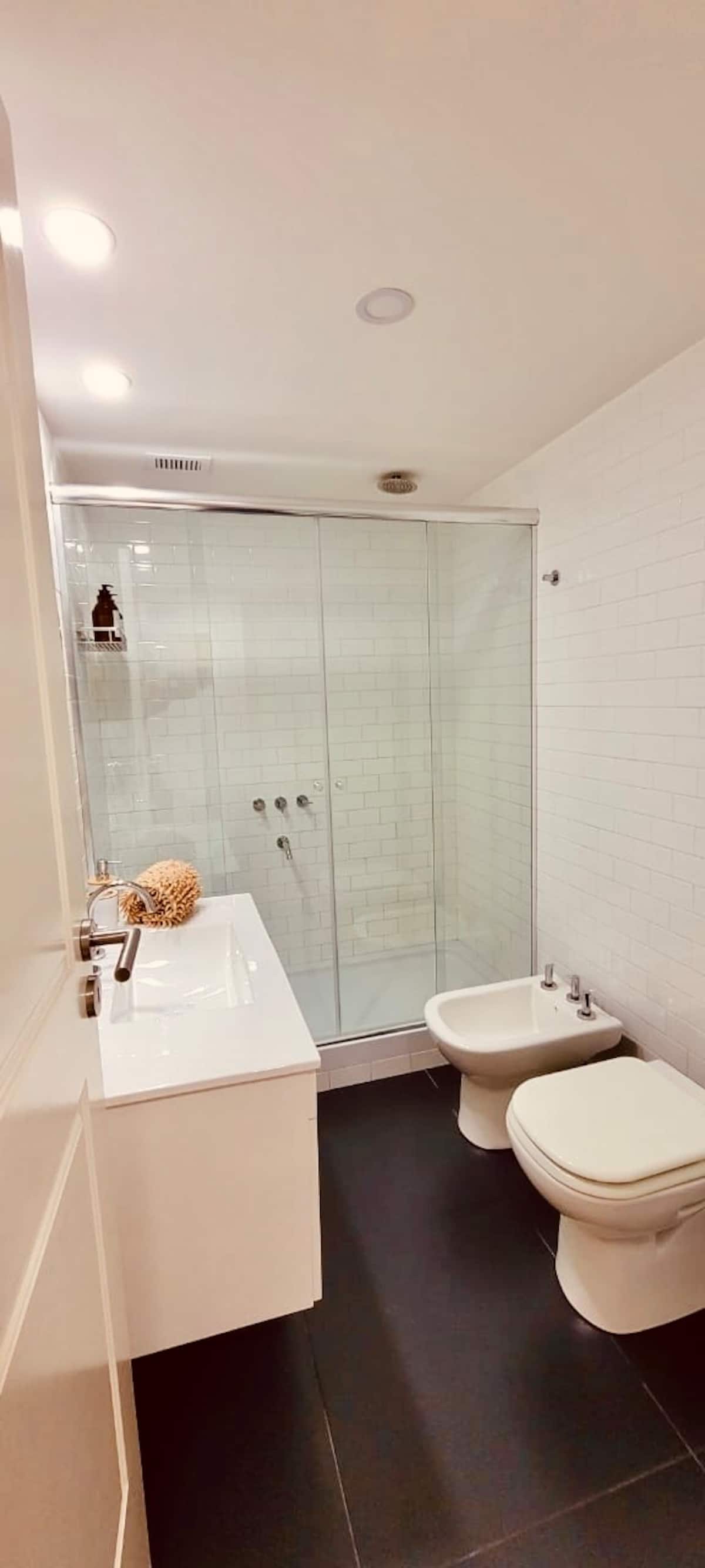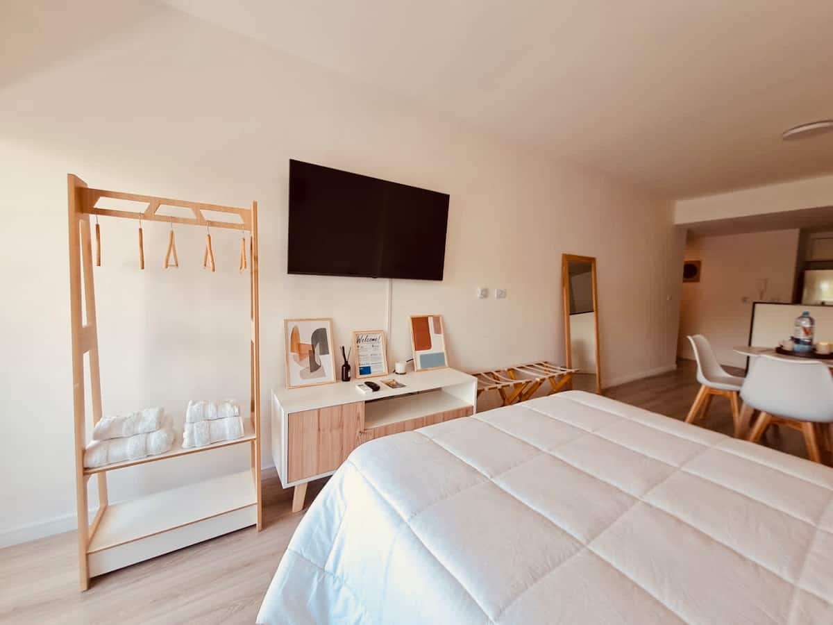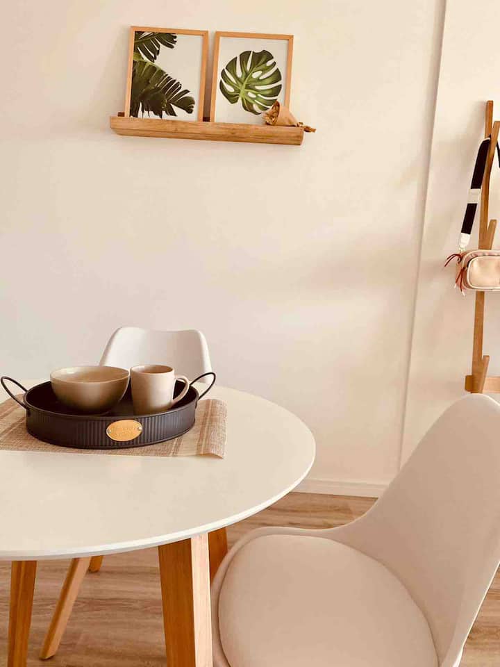 Apartamento mobiliado em Palermo Soho. Unidade de um ambiente com cama queen, roupas de cama e toalhas, utensílios de cozinha, itens de cortesia como café e chá, água quente, ar-condicionado e aquecimento. Inclui TV com streaming e aplicativos, internet Wi‑Fi de alta velocidade (300 MB), churrasqueira privativa na varanda e academia no próprio edifício. Acesso às áreas comuns e privativas do imóvel.