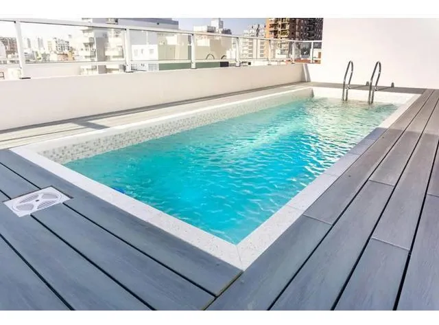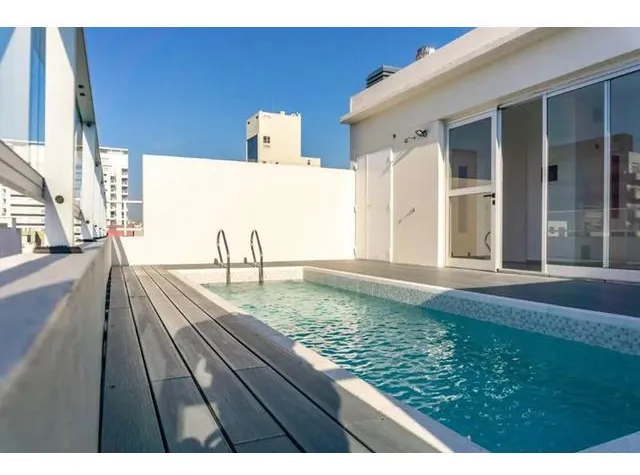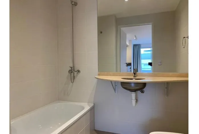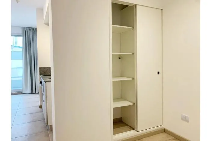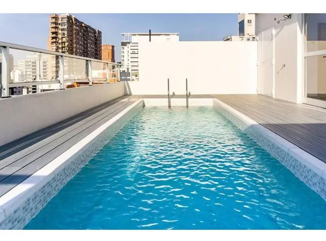 Kitnet de 38 m² totais, no 1º andar, de frente para a rua, com ampla varanda de 5 m² com deck de madeira. Banheiro completo e cozinha elétrica integrada com forno sob a bancada. Piso de cerâmica, ar-condicionado split frio/quente e aquecedor de água elétrico. Há área de closet. O prédio tem piscina, sauna e lavanderia. Não aceita animais.