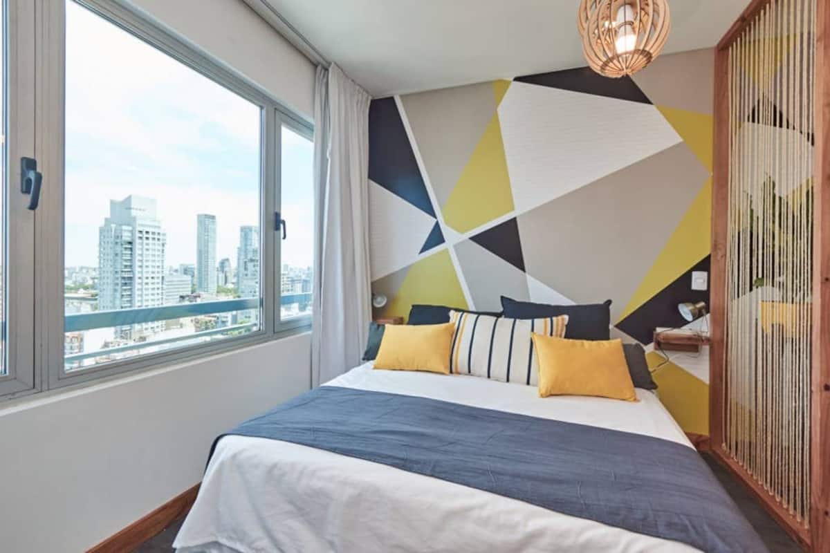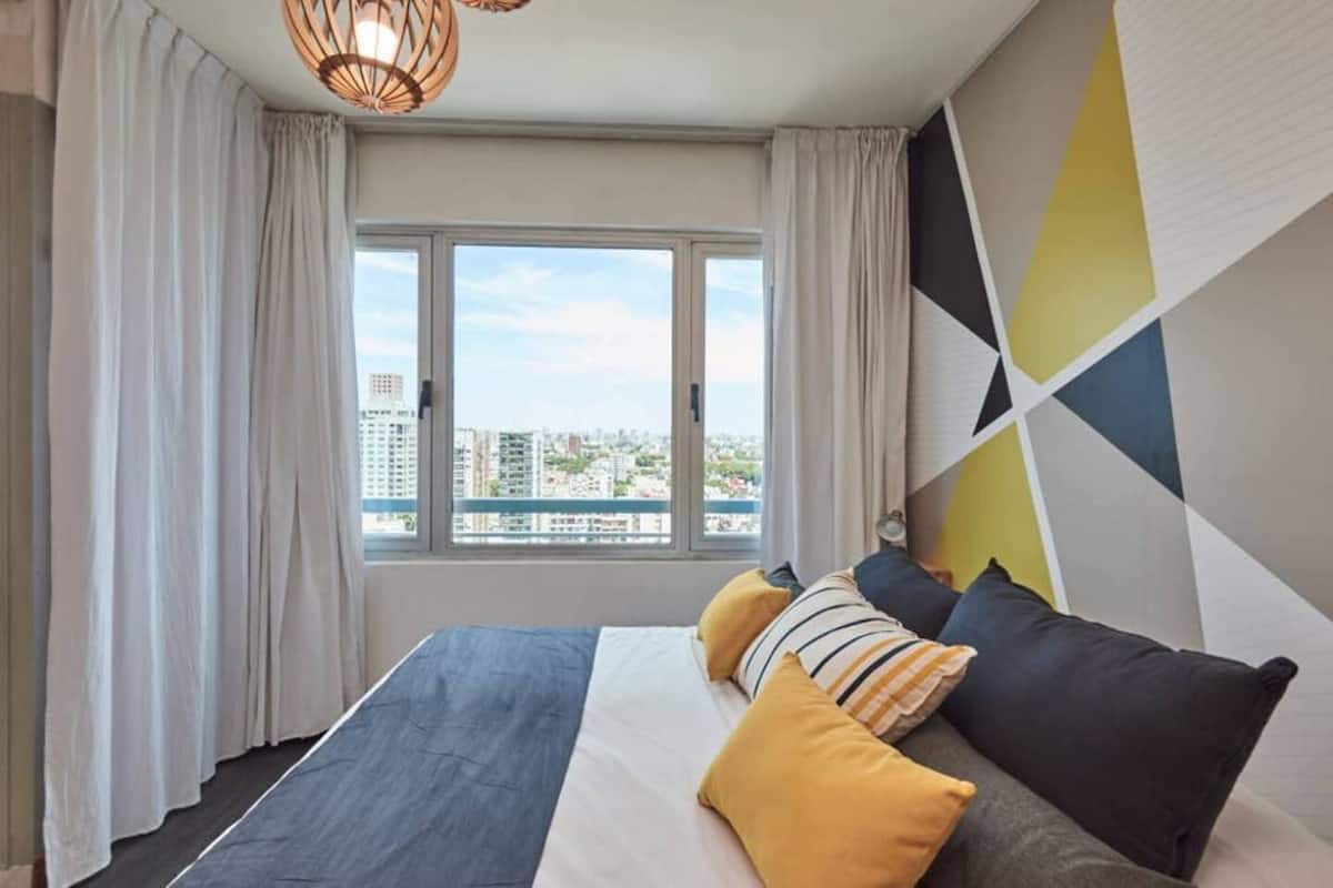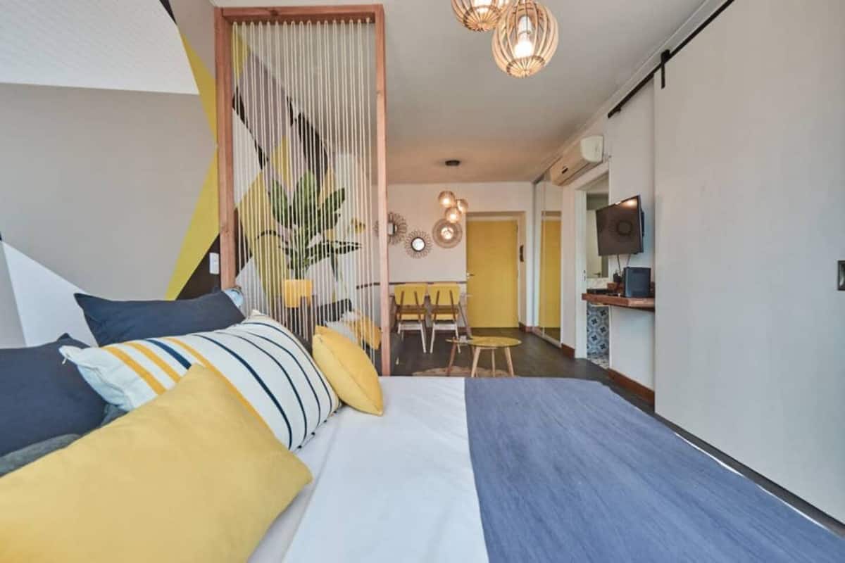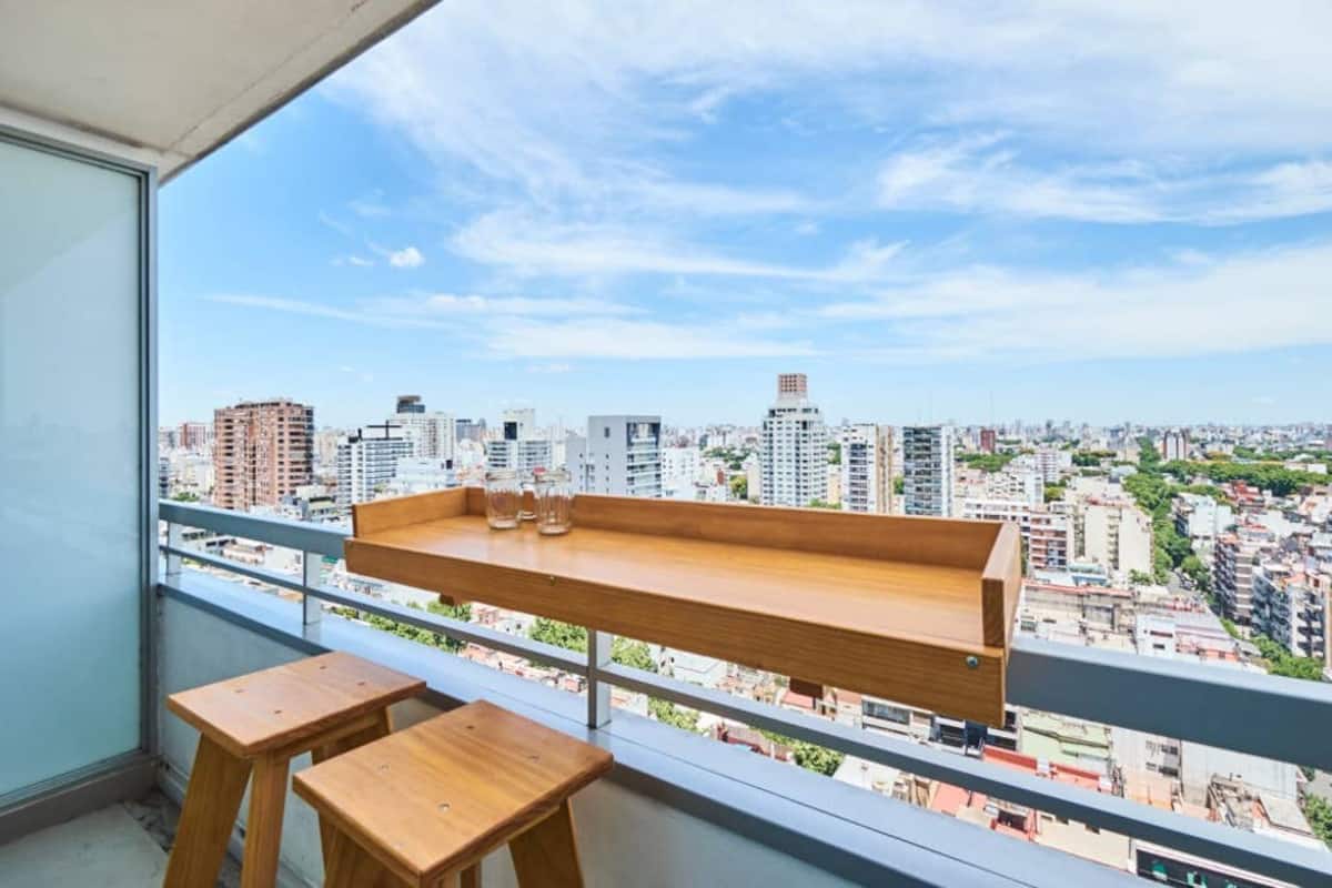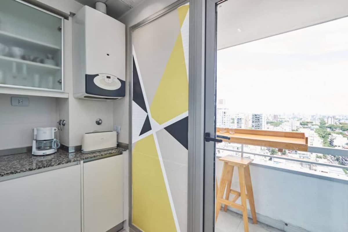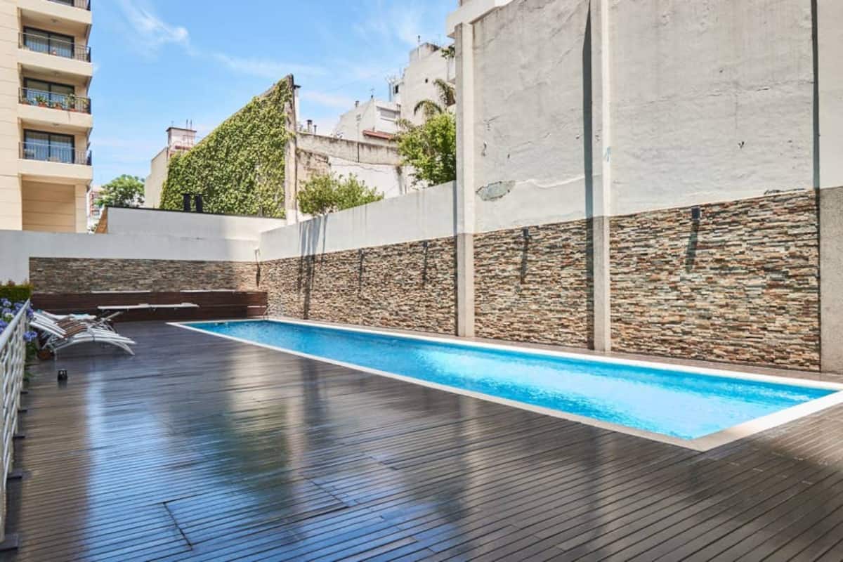 Apartamento muito iluminado em Palermo Soho, com capacidade para 3 pessoas. Com cama de casal e sofá-cama na área de estar. Inclui Wi-Fi e mesa grande na área de jantar integrada, além de varanda com vista. O prédio tem academia, lobby, piscina, solarium e salão de festas. A lista descreve acesso por retirada de chaves com equipe de limpeza ou serviço ao hóspede.
