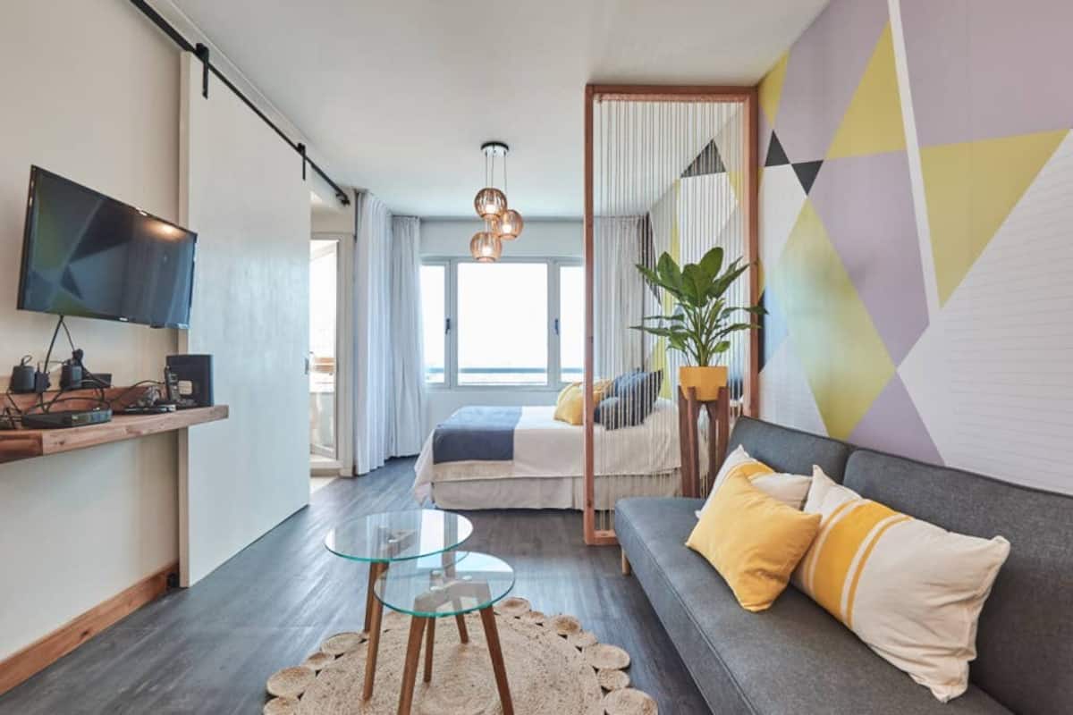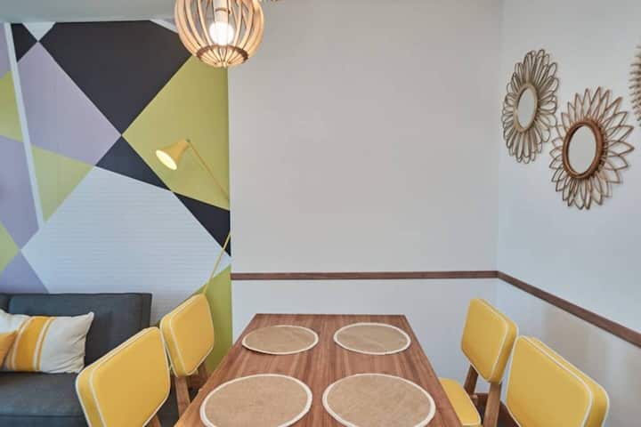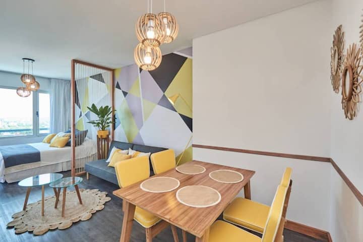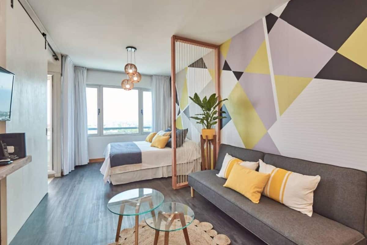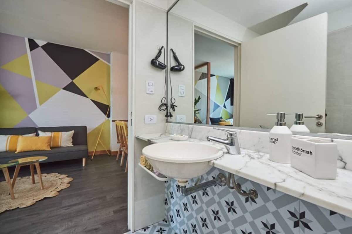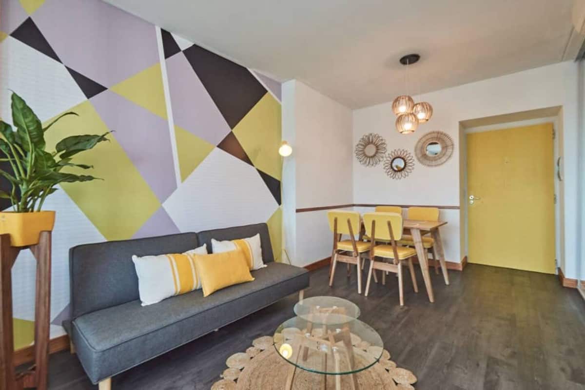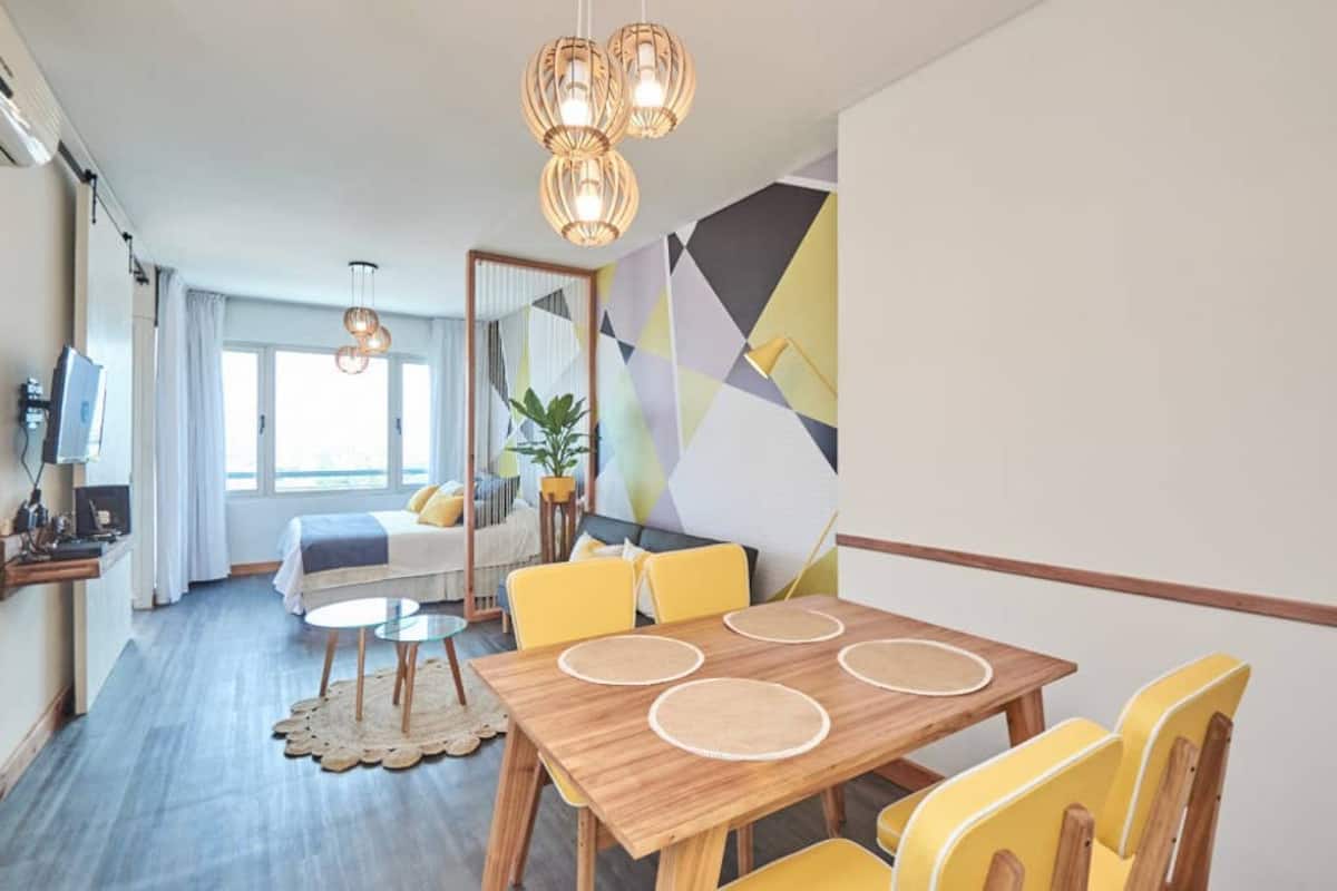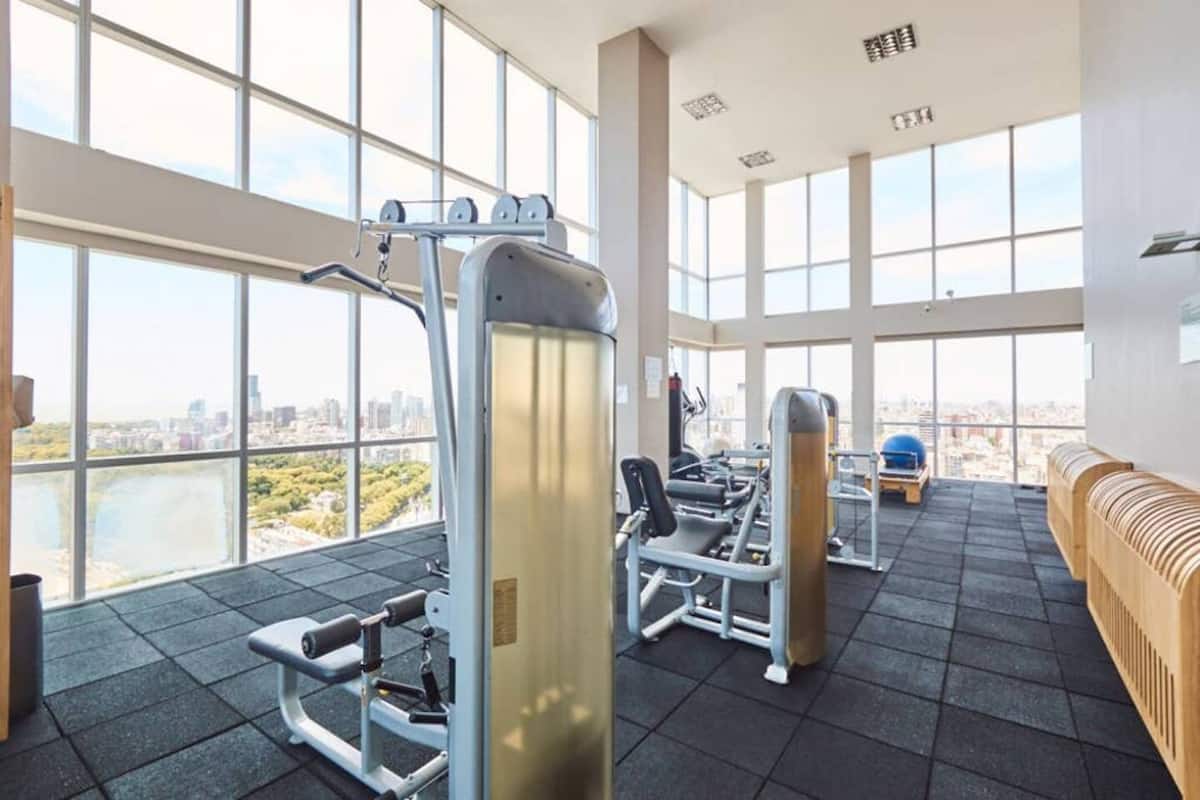Apartamento muito iluminado em Palermo Soho, com capacidade para 3 pessoas. Com cama de casal e sofá-cama na área de estar. Inclui Wi-Fi e mesa grande na área de jantar integrada, além de varanda com vista. O prédio tem academia, lobby, piscina, solarium e salão de festas. A lista descreve acesso por retirada de chaves com equipe de limpeza ou serviço ao hóspede.