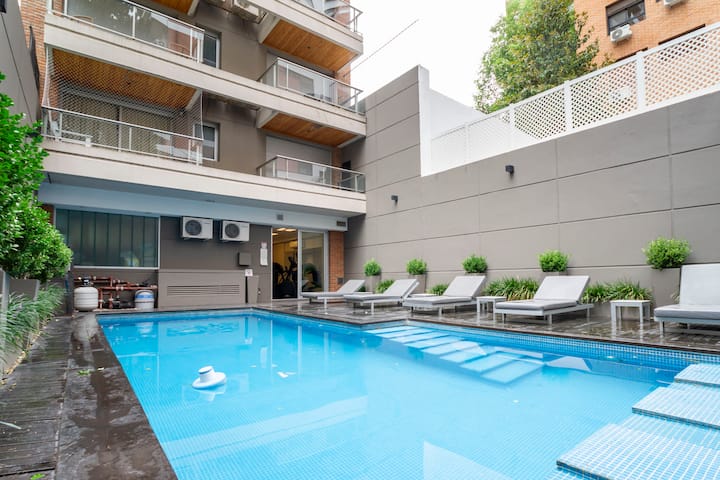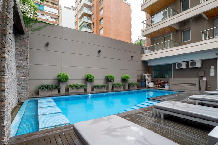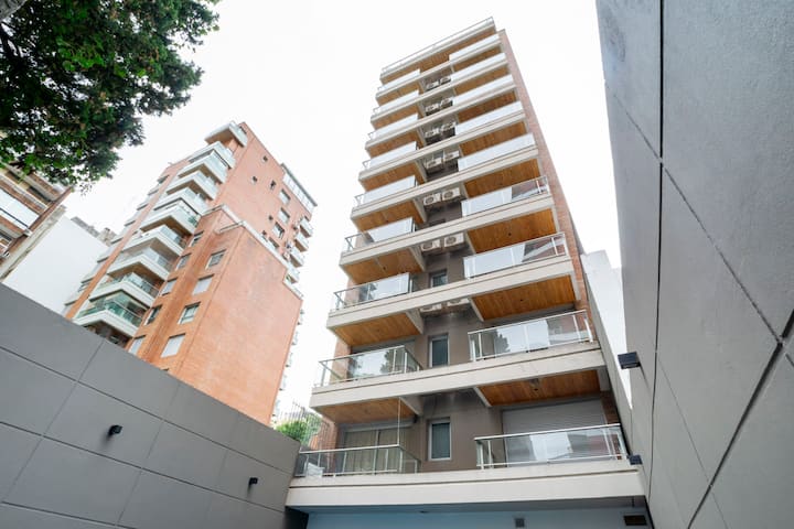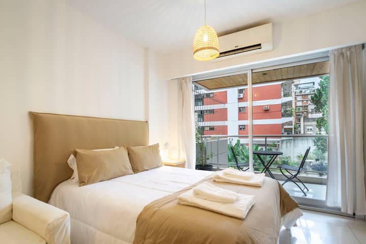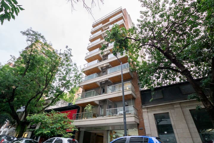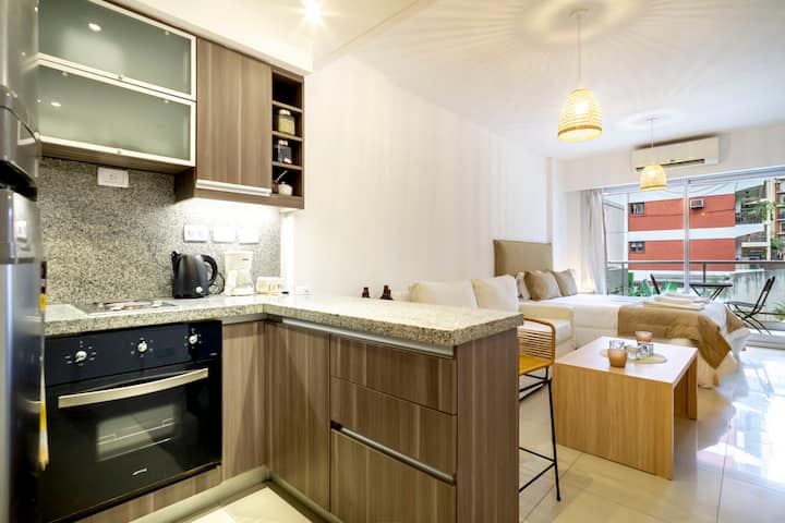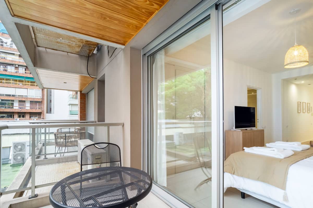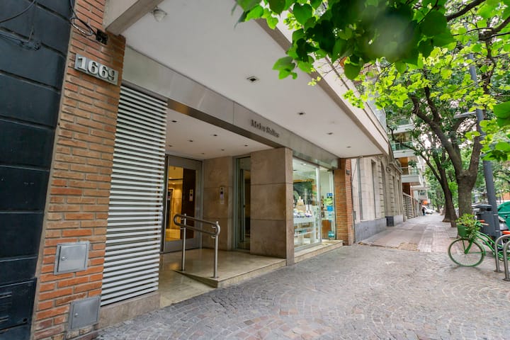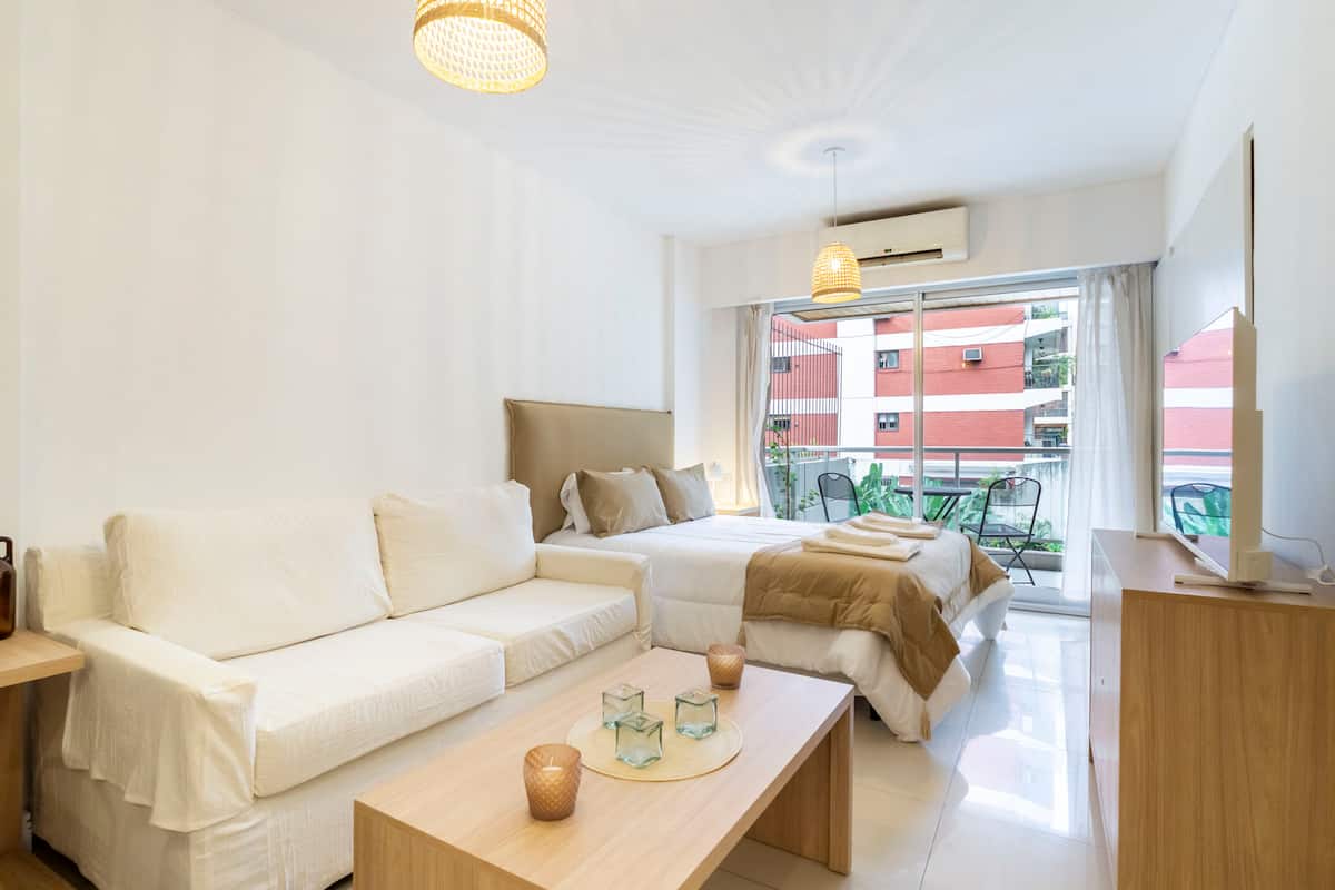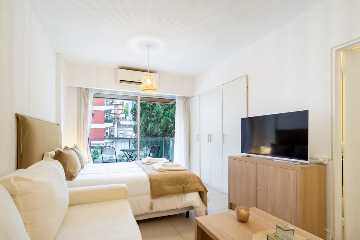 Kitnet em Las Cañitas, em esquina de Av. Jorge Newbery com Migueletes, com saída para varanda. Possui cozinha equipada, área de estar e jantar com sofá-cama, mesa, TV e ar-condicionado frio/quente, além de cama de casal e armário. O edifício conta com academia, lavanderia em áreas compartilhadas e piscina.