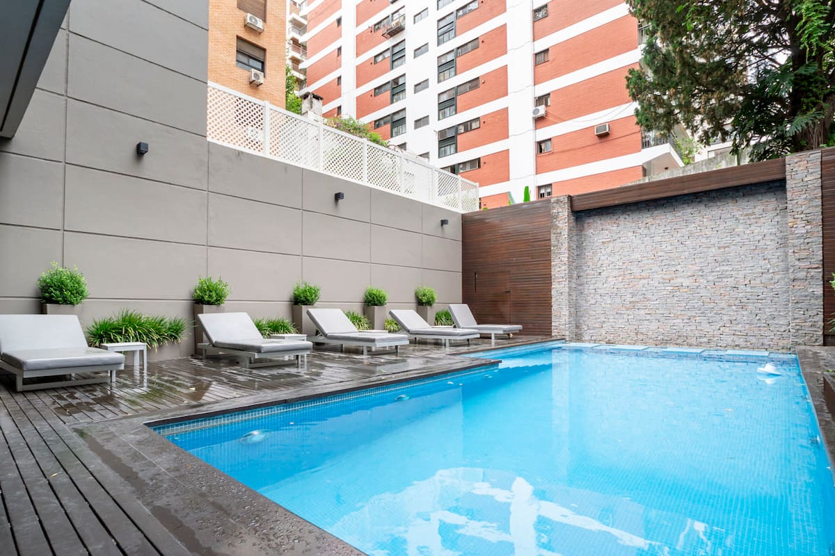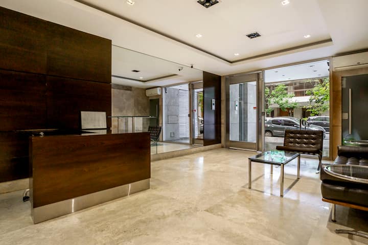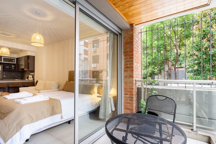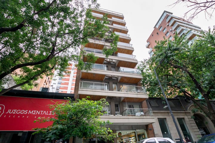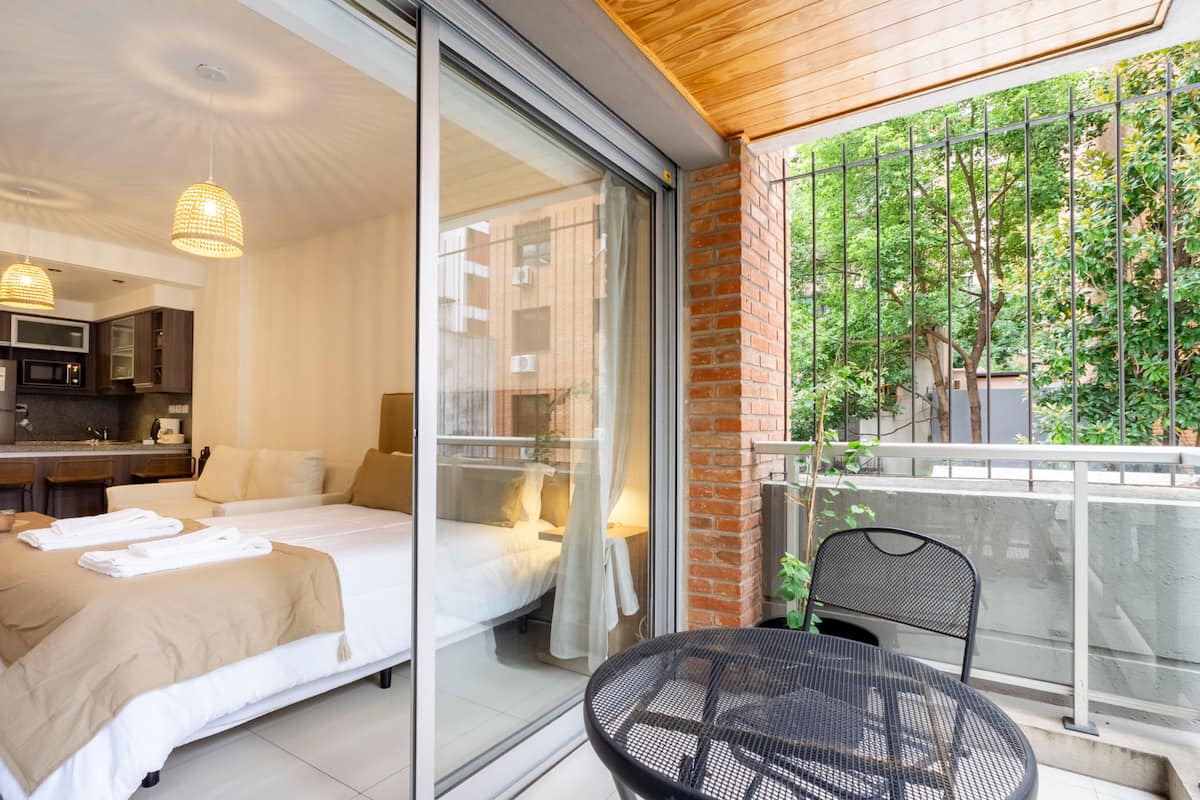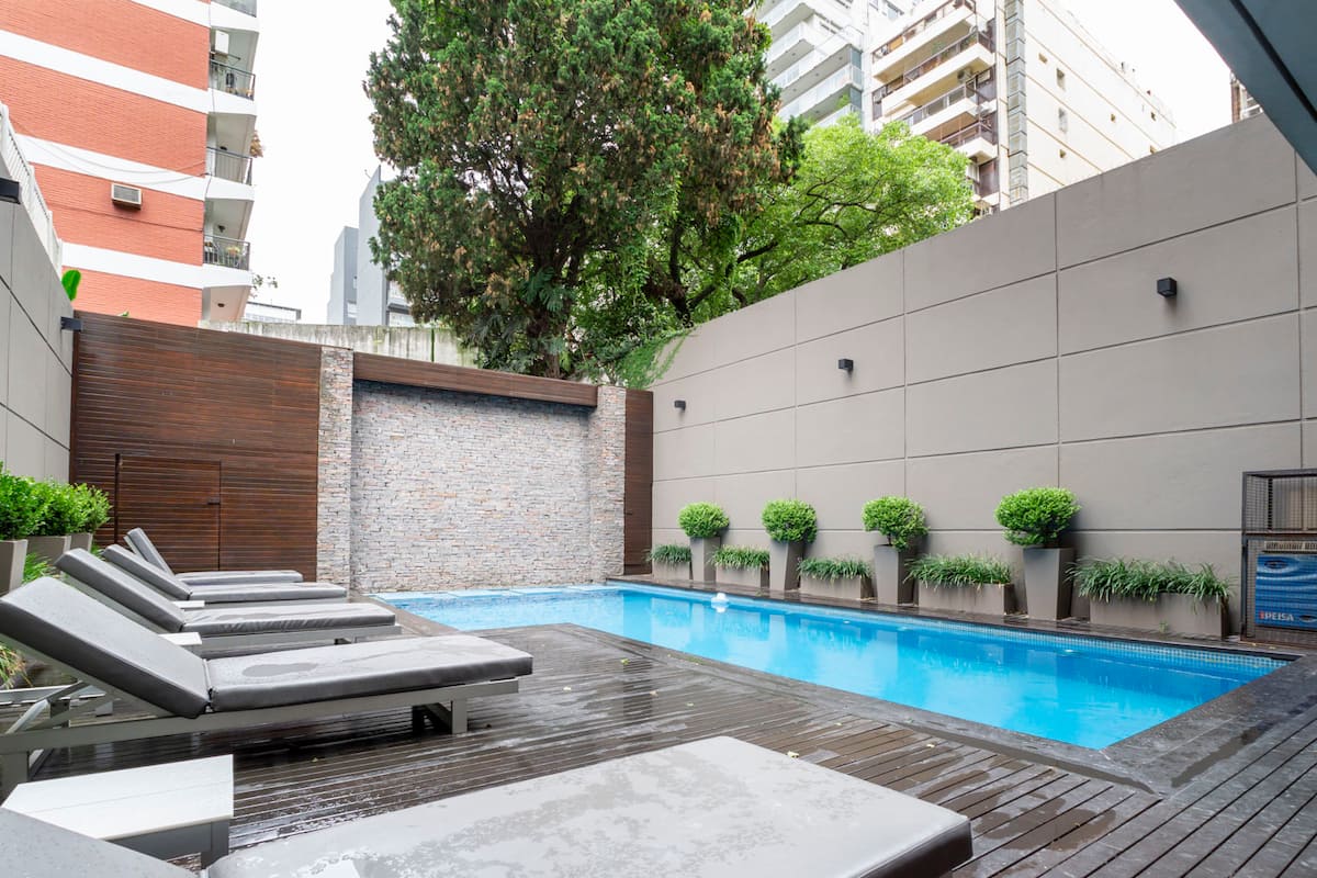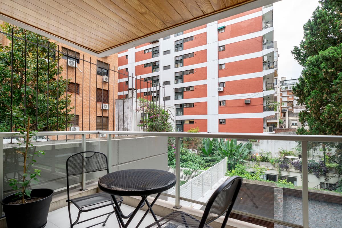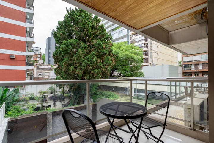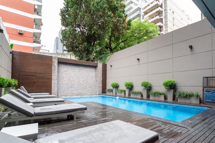 Kitnet em Las Cañitas, em esquina de Av. Jorge Newbery com Migueletes, com saída para varanda. Possui cozinha equipada, área de estar e jantar com sofá-cama, mesa, TV e ar-condicionado frio/quente, além de cama de casal e armário. O edifício conta com academia, lavanderia em áreas compartilhadas e piscina.