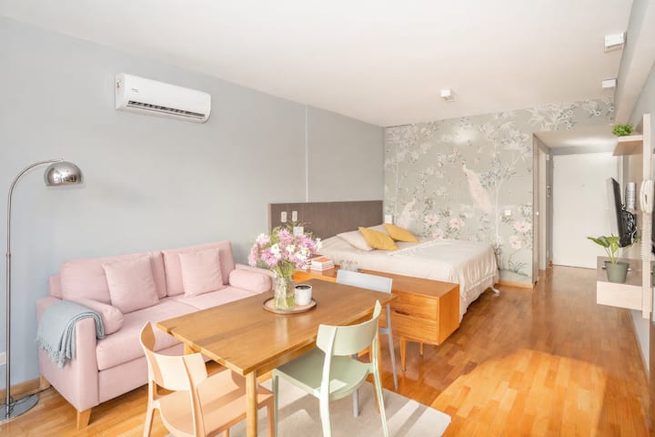 Studio mobiliado em Palermo com vaga fixa de king bed e varanda privativa