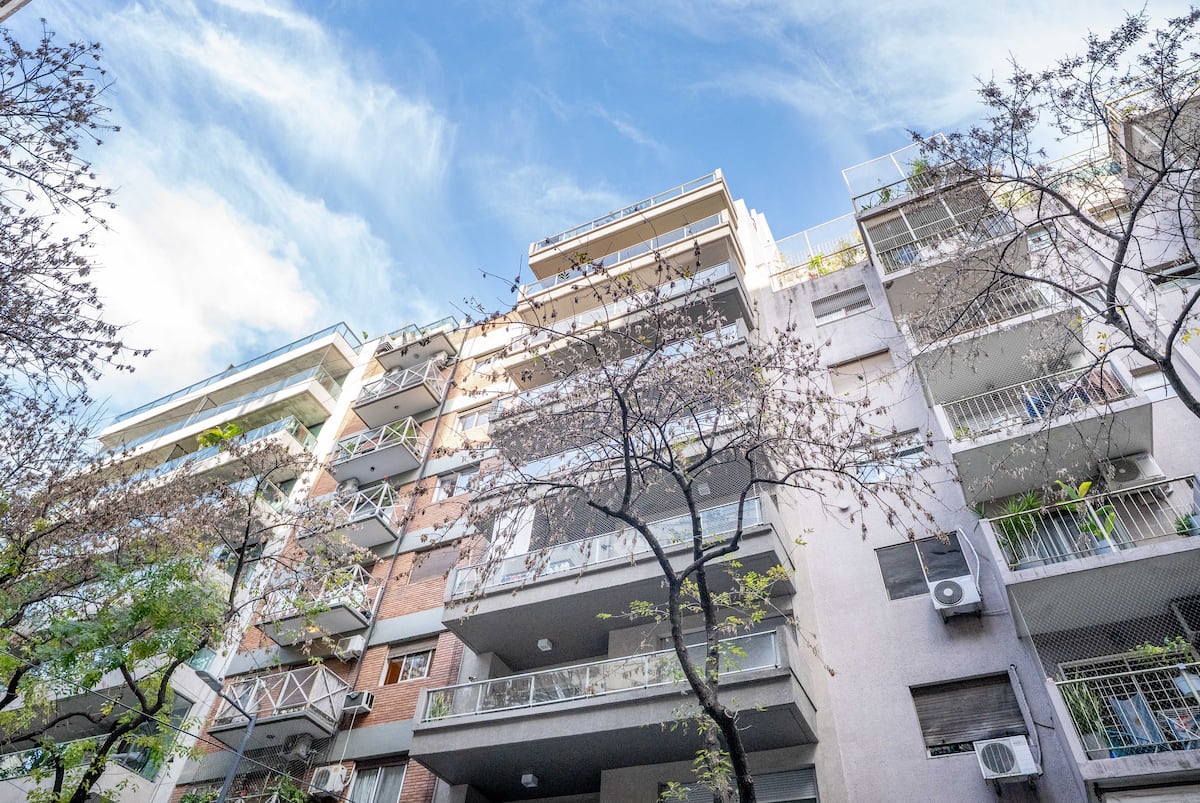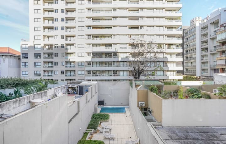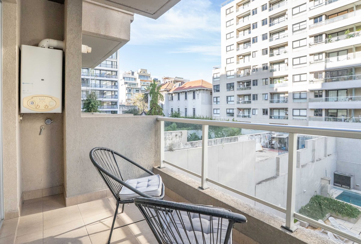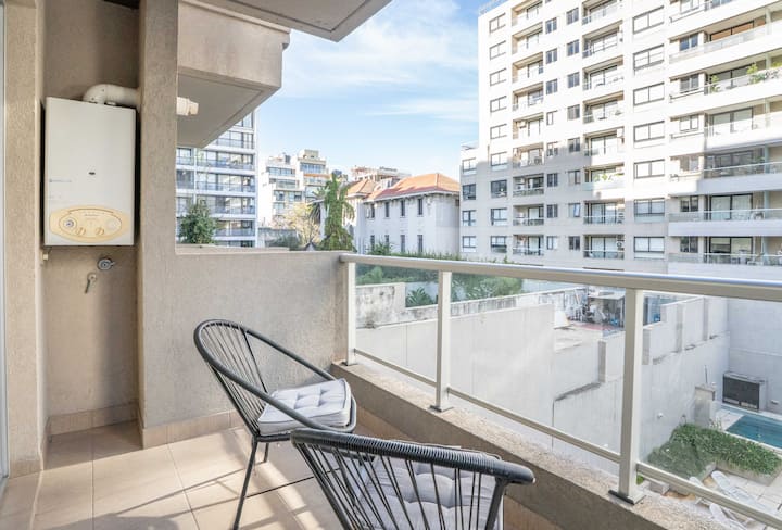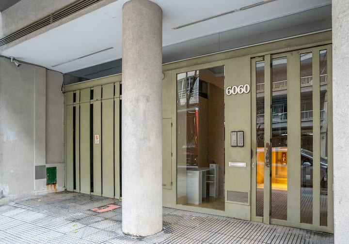 Studio em Palermo Hollywood, mobiliado, com varanda privativa voltada para o miolo de quadra. Inclui cama king, Wi-Fi de alta velocidade, TV inteligente, cozinha completa, área de refeições e banheiro moderno. O prédio tem piscina e área de lavanderia. A entrada é por auto check-in.