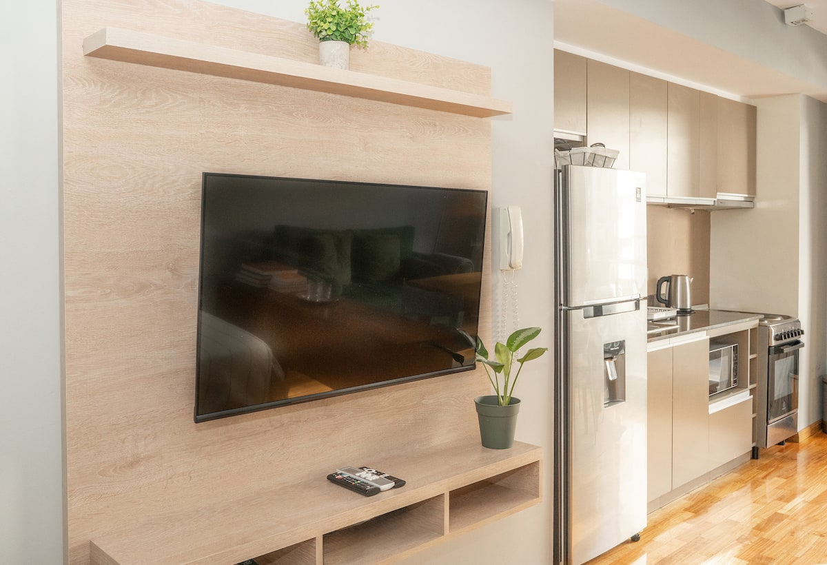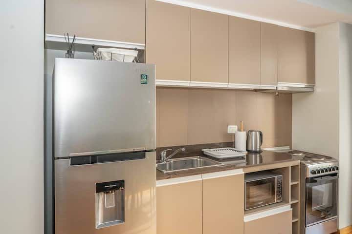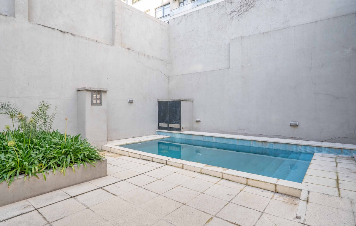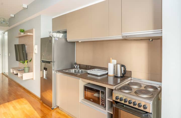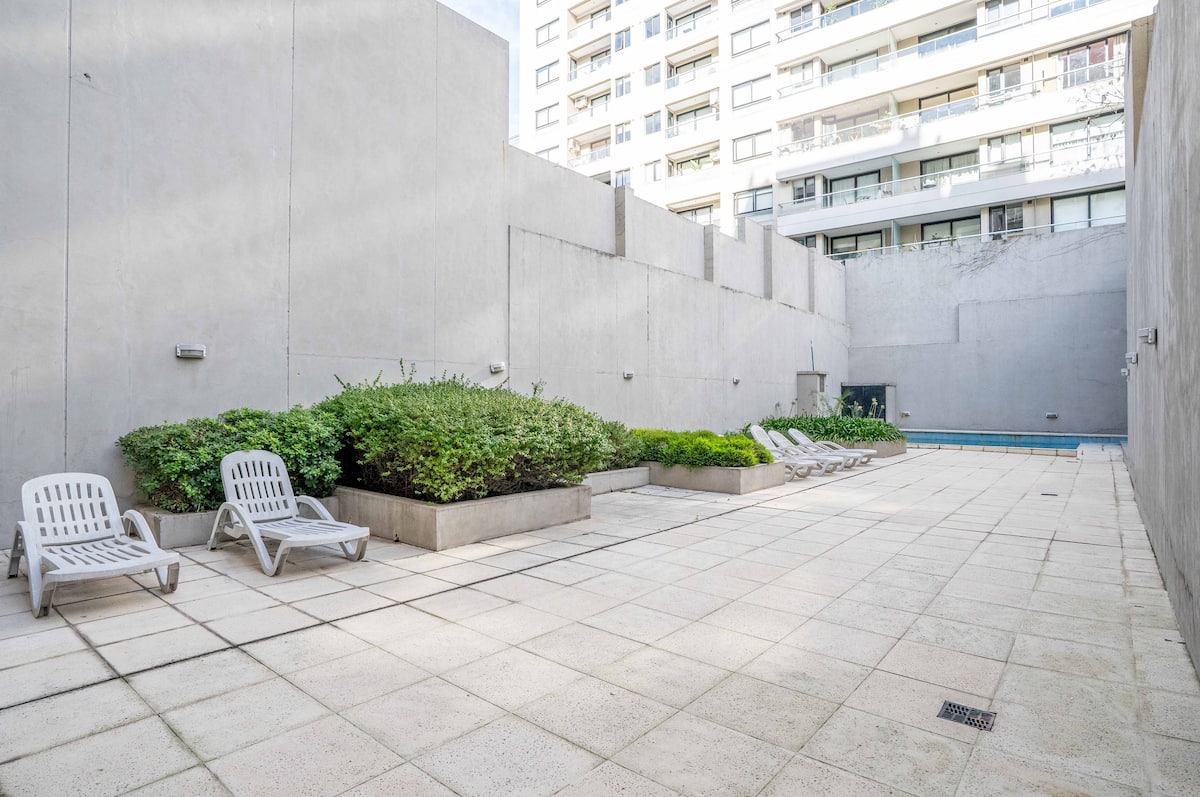Studio em Palermo Hollywood, mobiliado, com varanda privativa voltada para o miolo de quadra. Inclui cama king, Wi-Fi de alta velocidade, TV inteligente, cozinha completa, área de refeições e banheiro moderno. O prédio tem piscina e área de lavanderia. A entrada é por auto check-in.