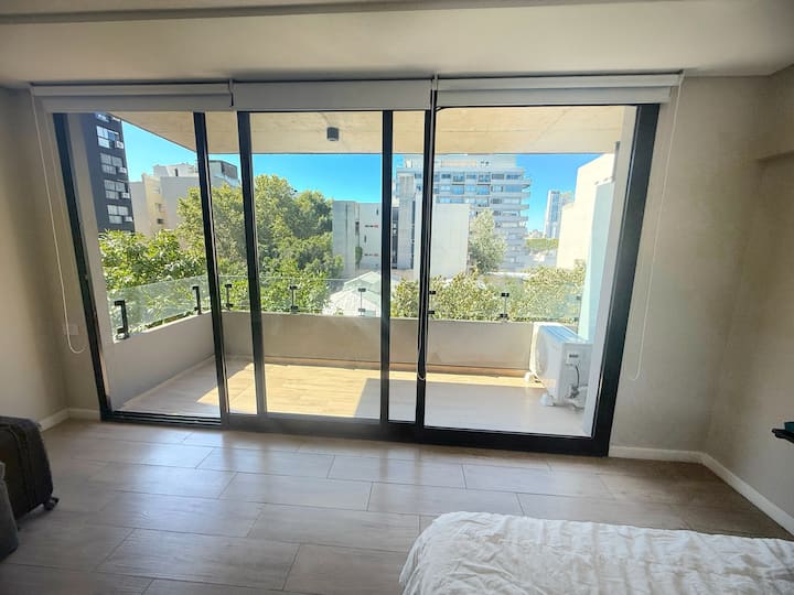 Kitnet em Palermo Hollywood, em prédio novo, mobiliada e preparada para até 4 pessoas. Inclui varanda ampla, cama de casal (1,60 x 2 m) e sofá-cama que vira duas camas individuais, além de TV Smart de 43” e internet Wi‑Fi. Cozinha com fogão cerâmico de 4 bocas, forno elétrico, micro-ondas digital, geladeira com freezer, torradeira, chaleira elétrica, cafeteira e utensílios. O edifício tem piscina na cobertura, SUM com área de churrasco e lavanderia; acesso com portaria/controle com chave digital