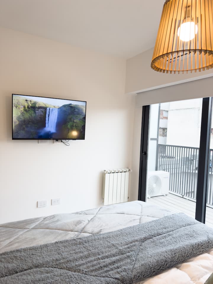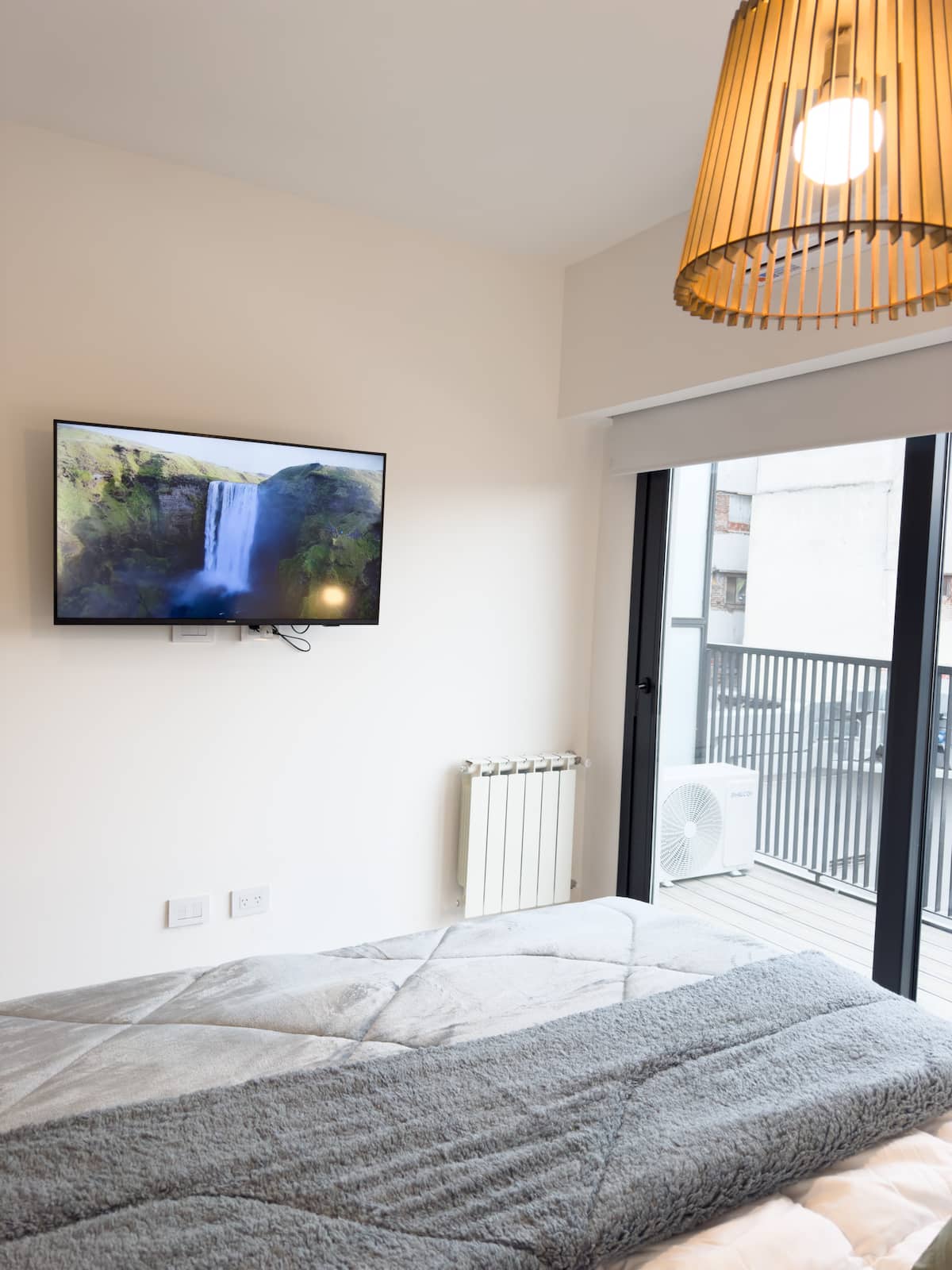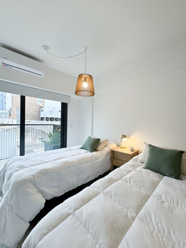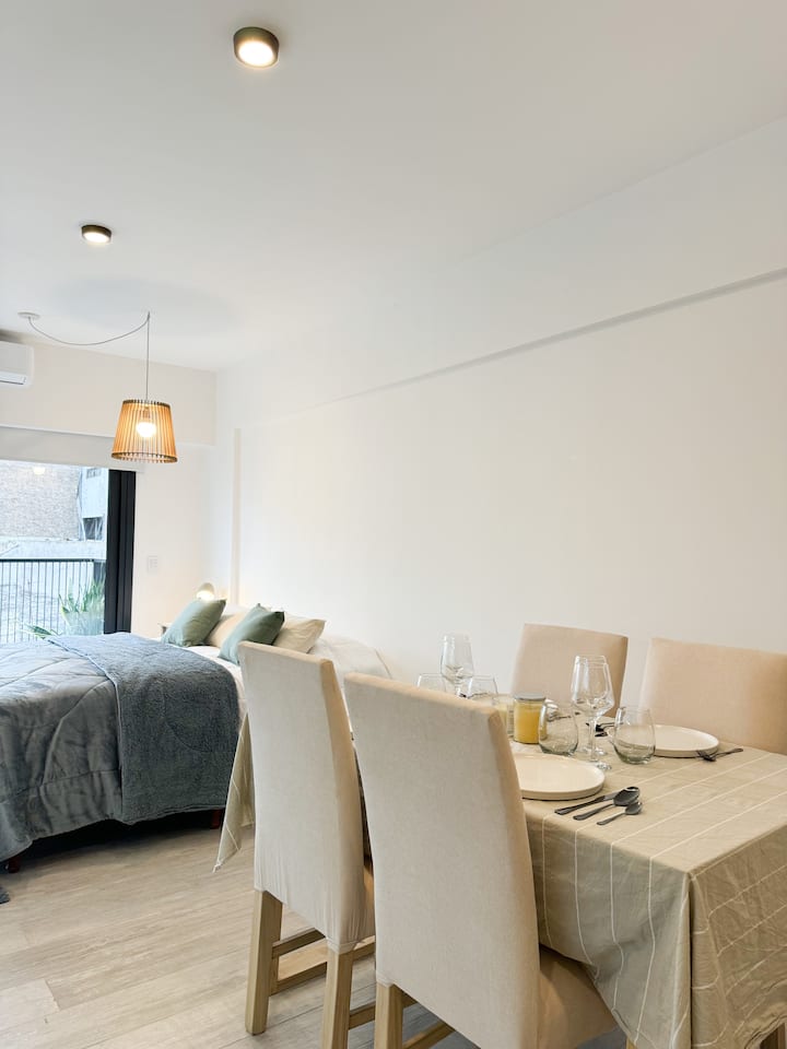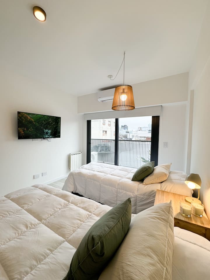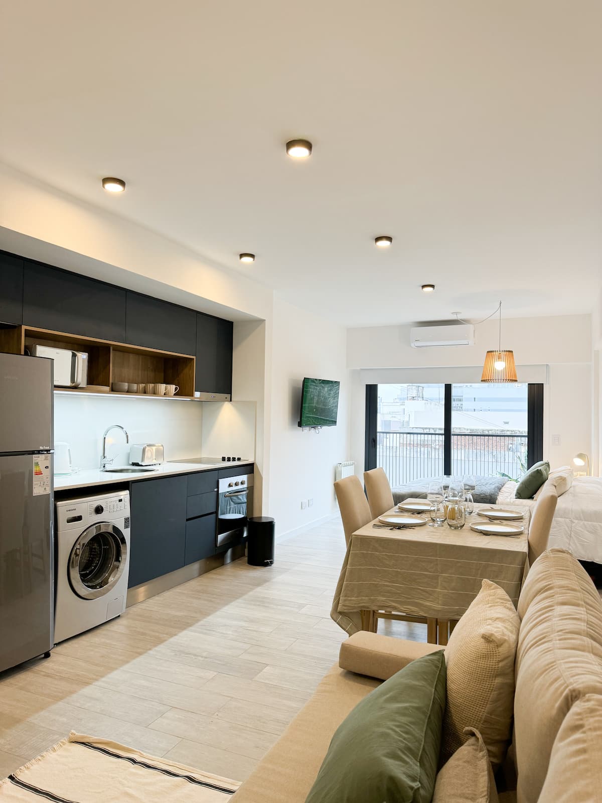Kitnet em Palermo Hollywood, preparada para estadias de 1 a 4 pessoas. A unidade tem cama de casal que pode ser dividida em 2 camas de solteiro e sofá-cama para mais 2 pessoas, totalizando 4 lugares. O prédio conta com fechaduras digitais, espaço de coworking com internet, garagem comercial em 3 subandares, restaurante no térreo e terraço comum com piscina, solário e área de churrasco.