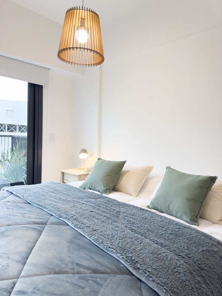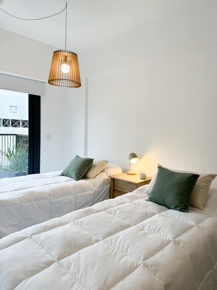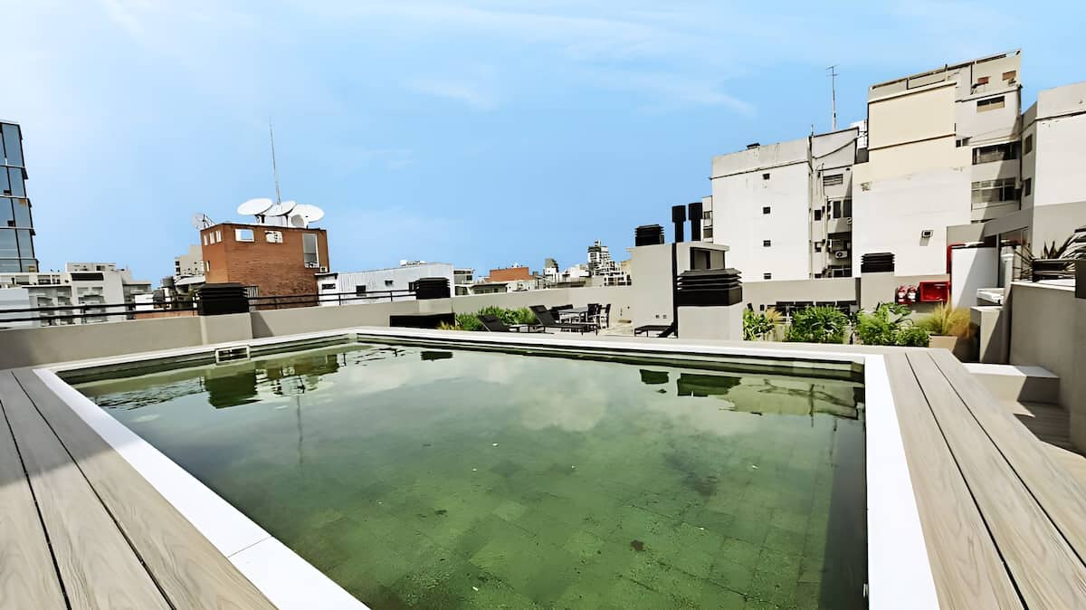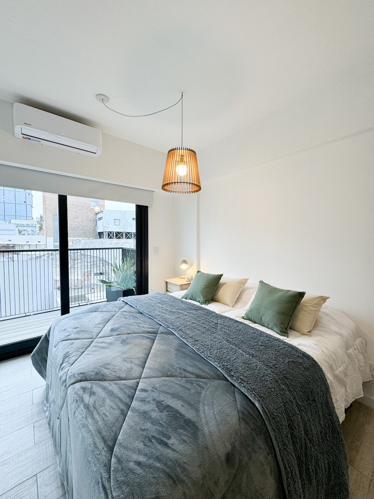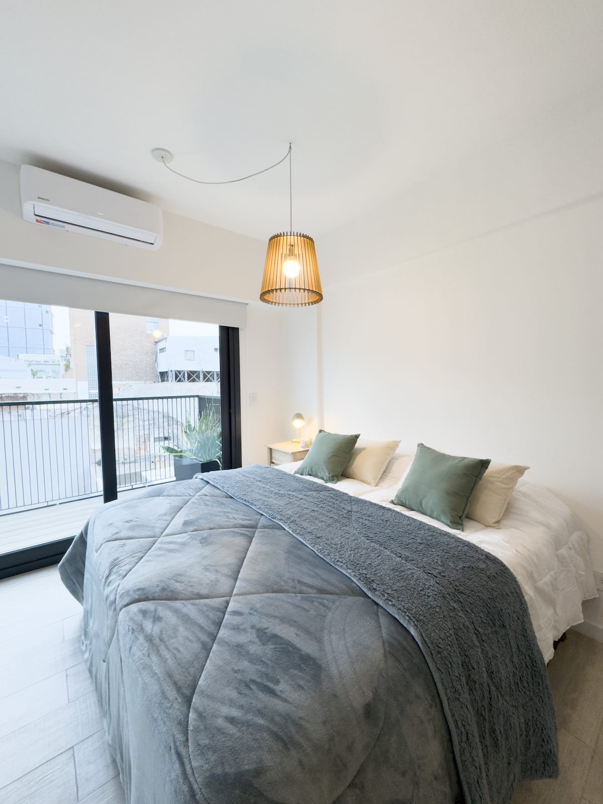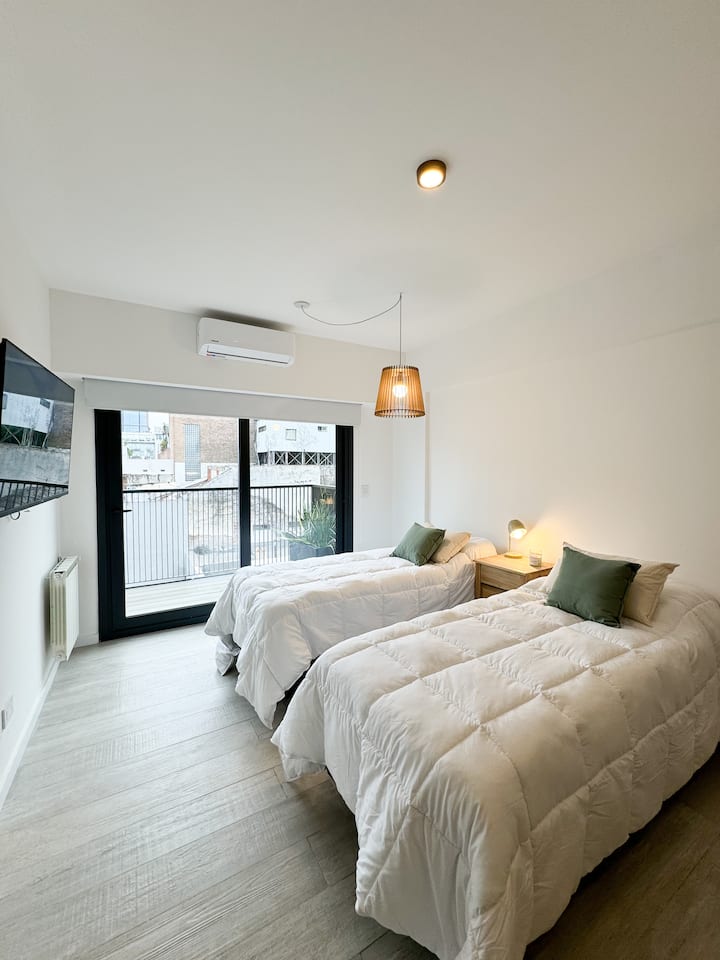 Kitnet em Palermo Hollywood, preparada para estadias de 1 a 4 pessoas. A unidade tem cama de casal que pode ser dividida em 2 camas de solteiro e sofá-cama para mais 2 pessoas, totalizando 4 lugares. O prédio conta com fechaduras digitais, espaço de coworking com internet, garagem comercial em 3 subandares, restaurante no térreo e terraço comum com piscina, solário e área de churrasco.