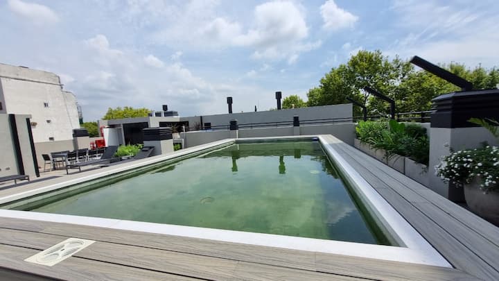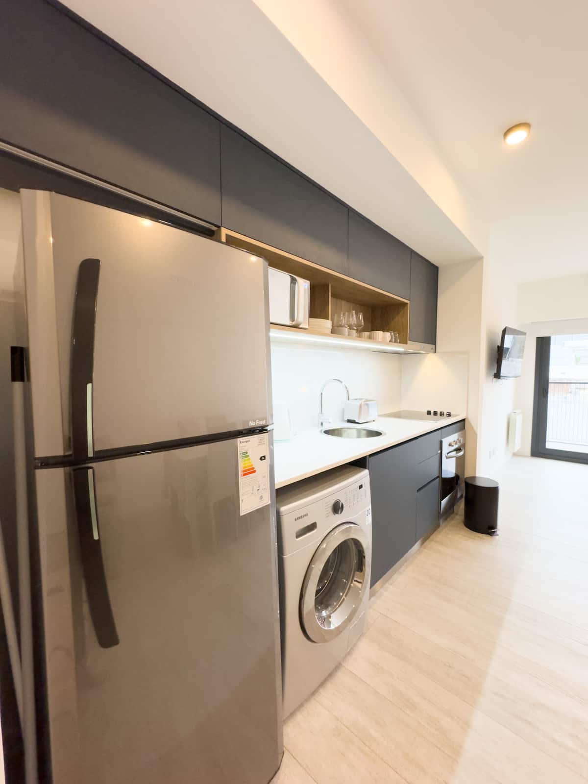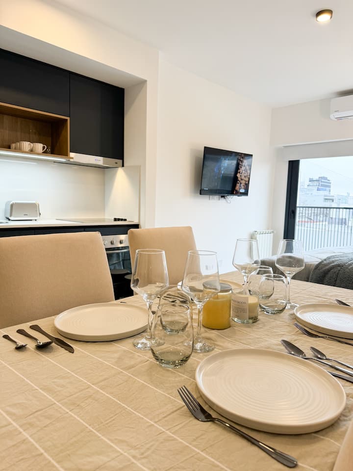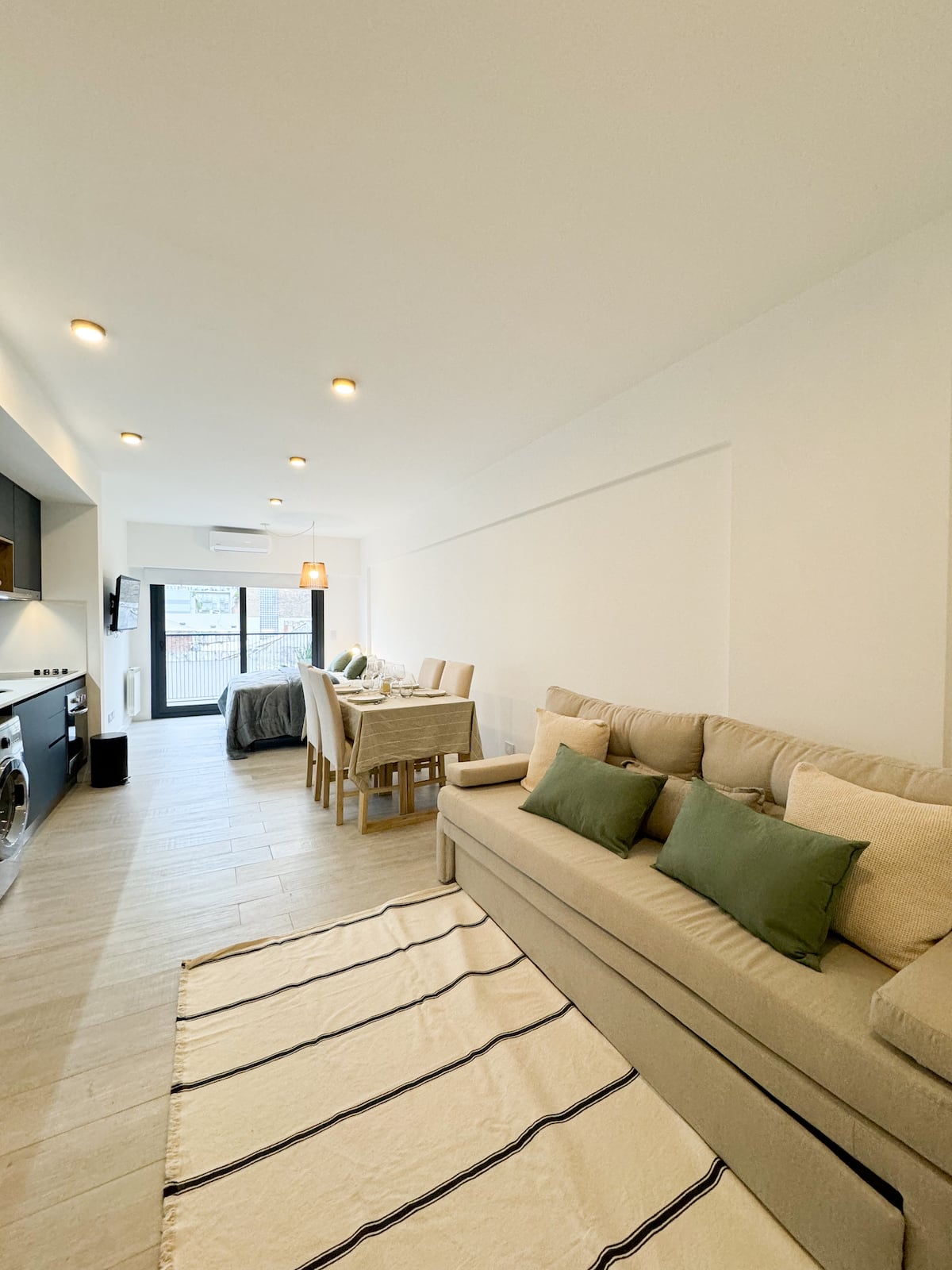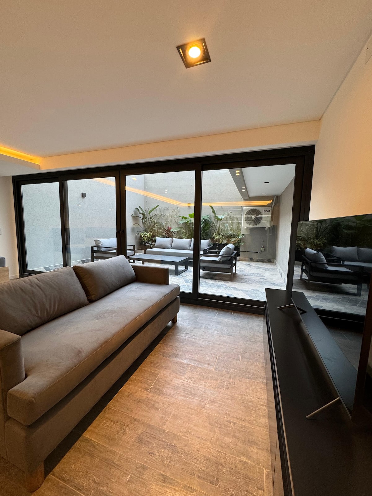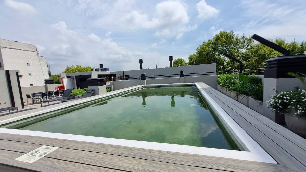 Kitnet em Palermo Hollywood, preparada para estadias de 1 a 4 pessoas. A unidade tem cama de casal que pode ser dividida em 2 camas de solteiro e sofá-cama para mais 2 pessoas, totalizando 4 lugares. O prédio conta com fechaduras digitais, espaço de coworking com internet, garagem comercial em 3 subandares, restaurante no térreo e terraço comum com piscina, solário e área de churrasco.