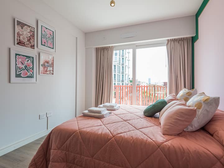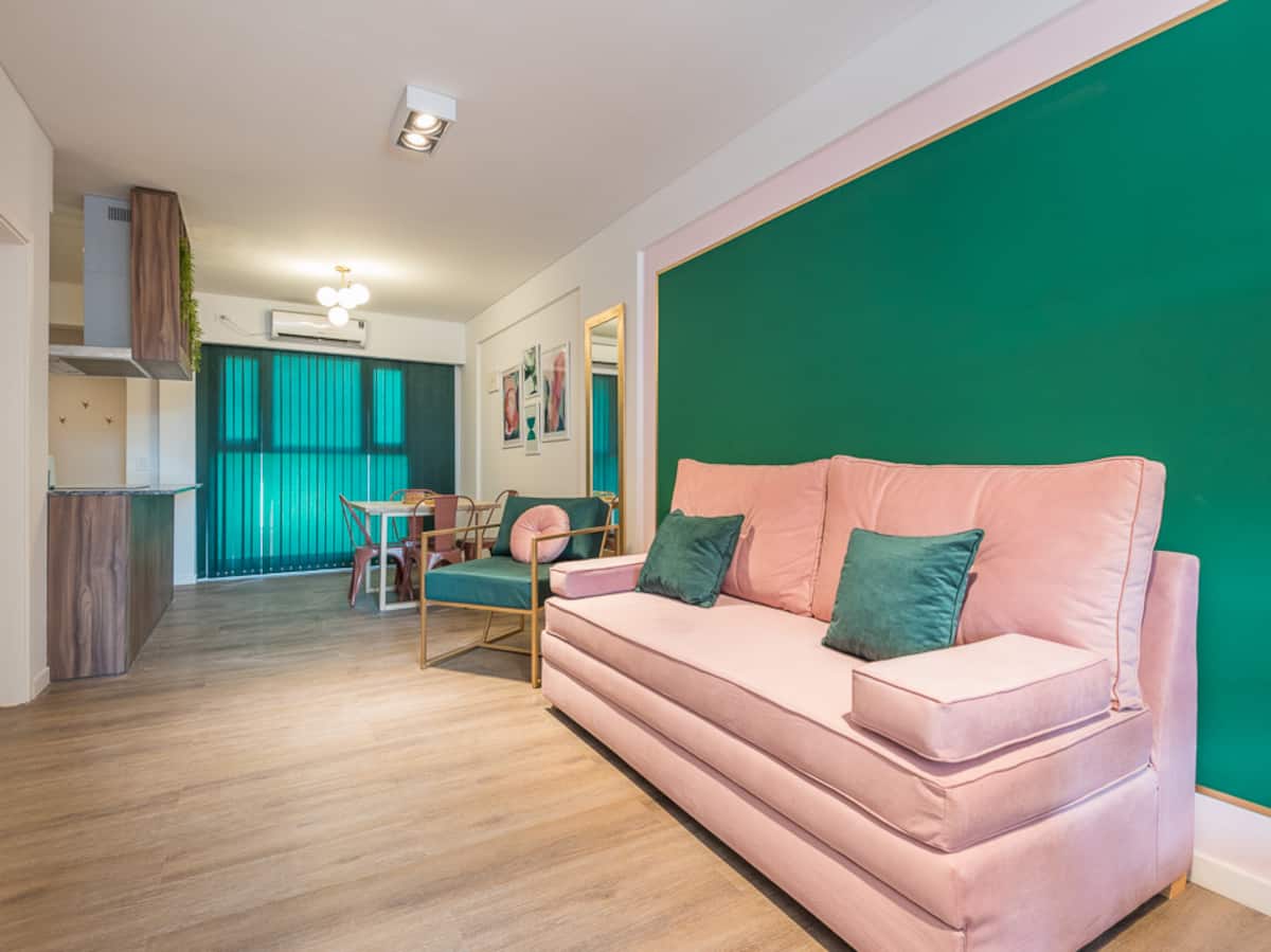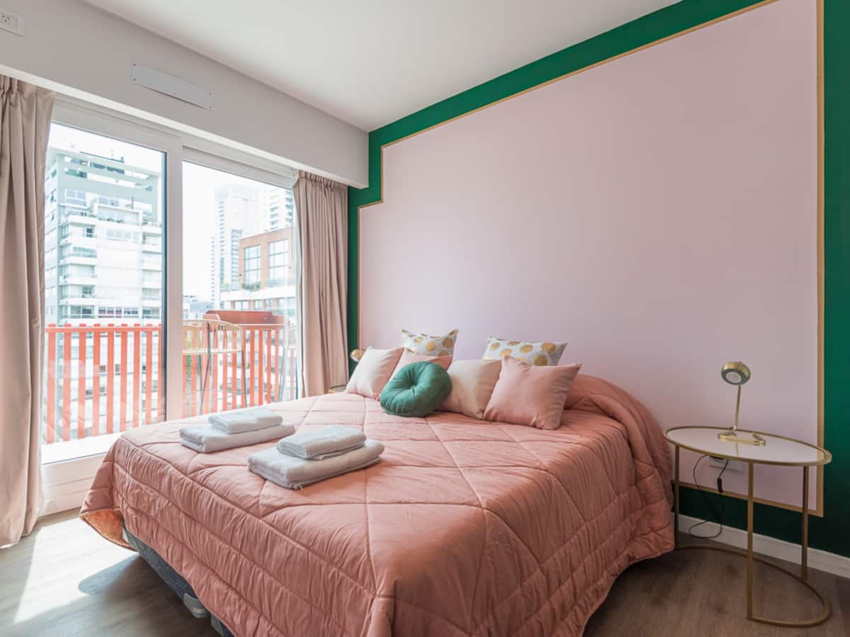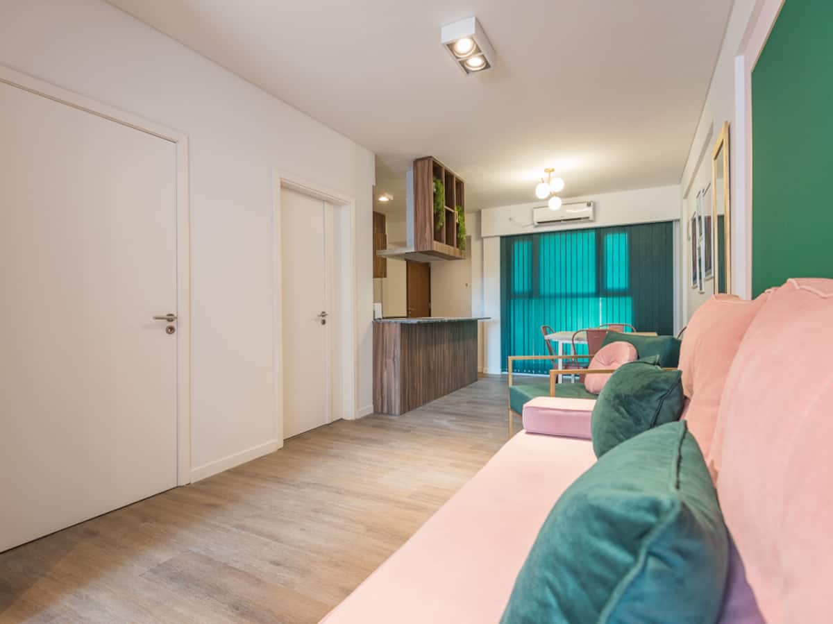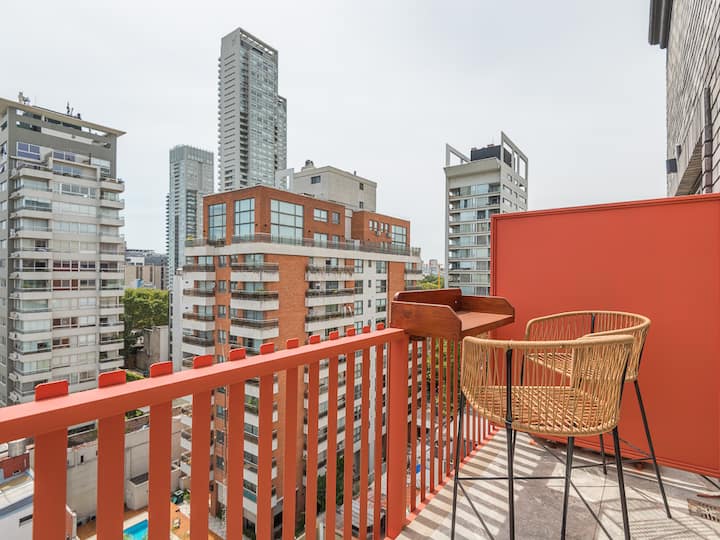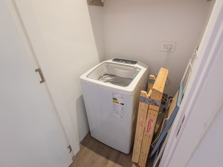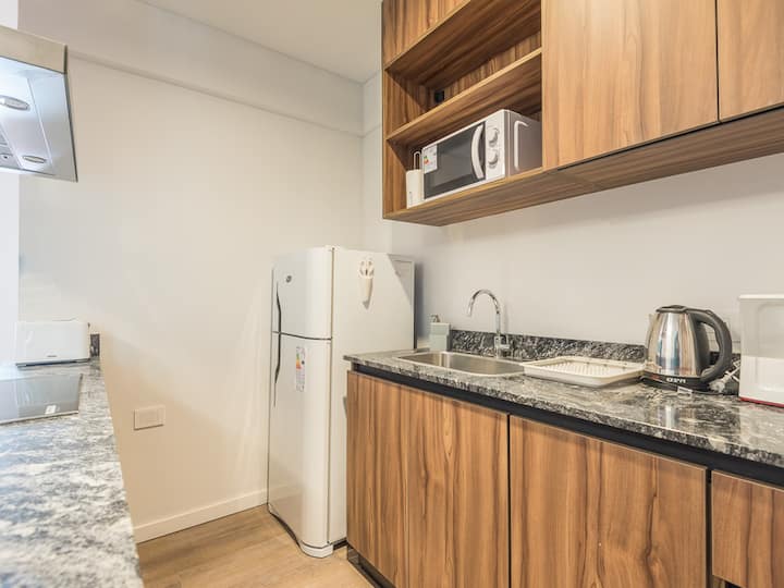 Kitnet para aluguel em Palermo, com 1 ambiente, cozinha equipada, banheiro com box e varanda. A unidade tem cama de casal, sofá-cama com carrinho e máquina de lavar. O prédio oferece academia e sauna; o acesso é feito por QR code e não há chave.
