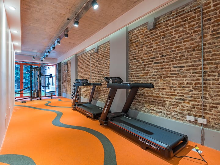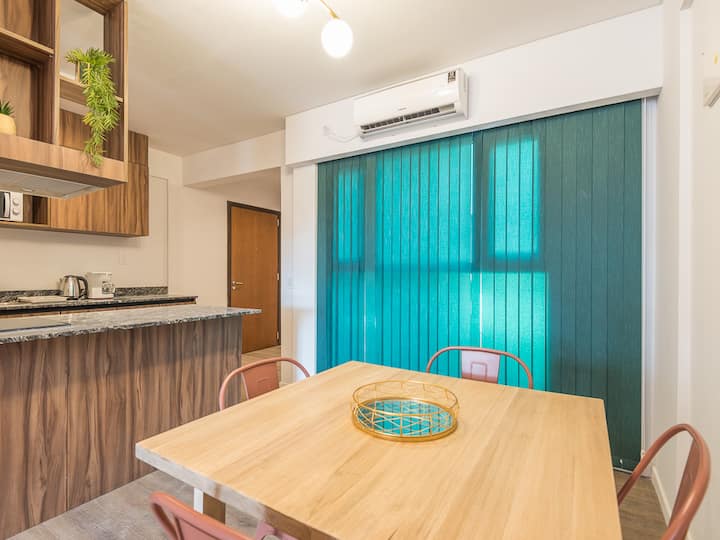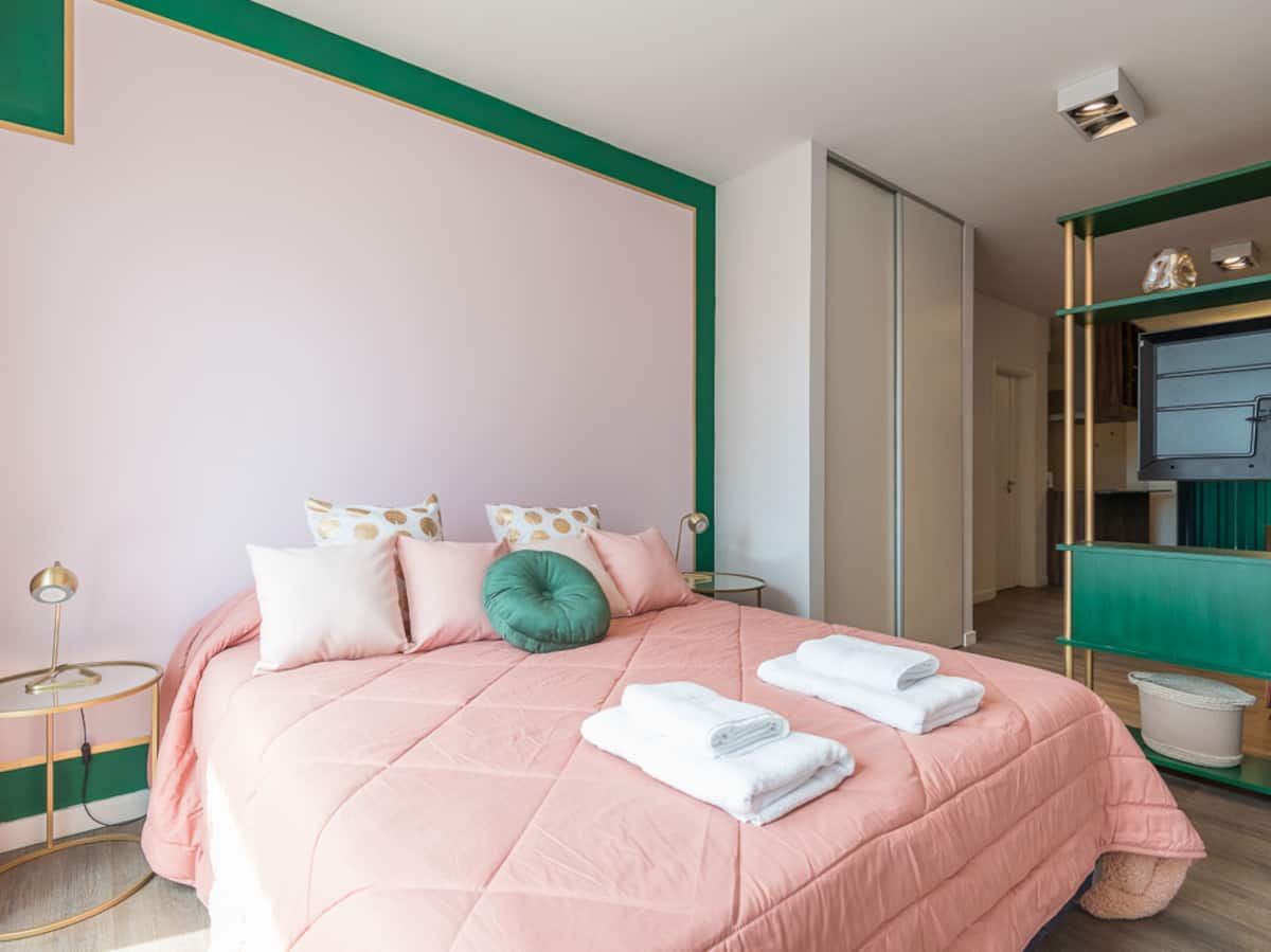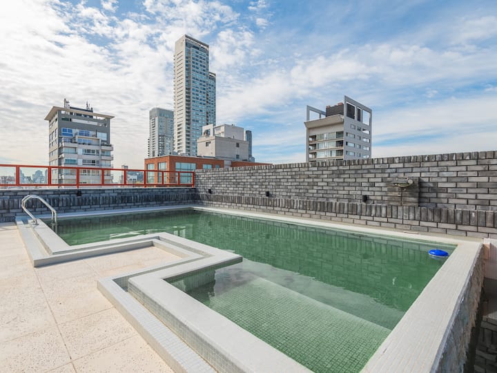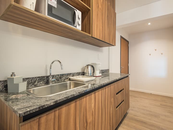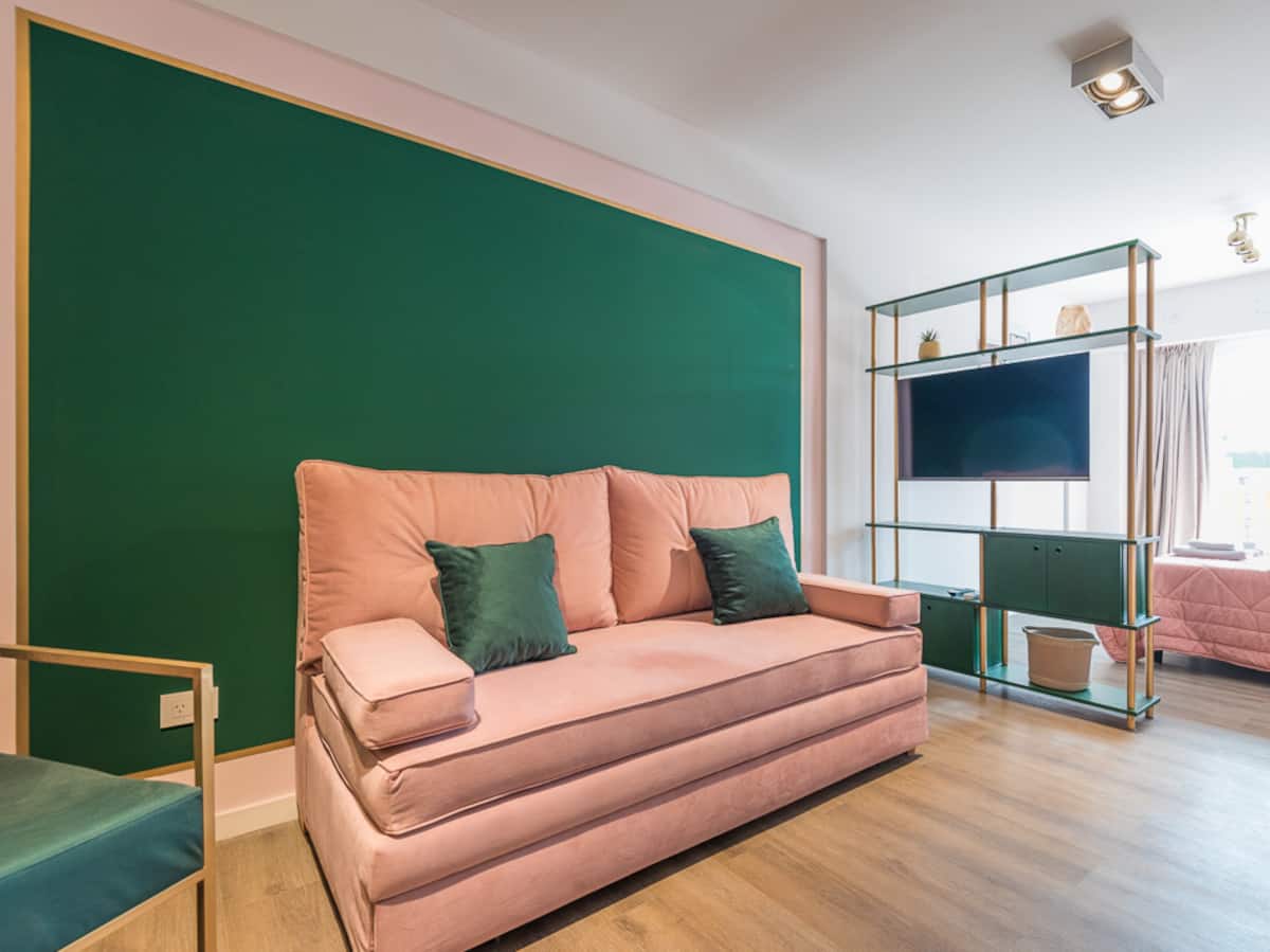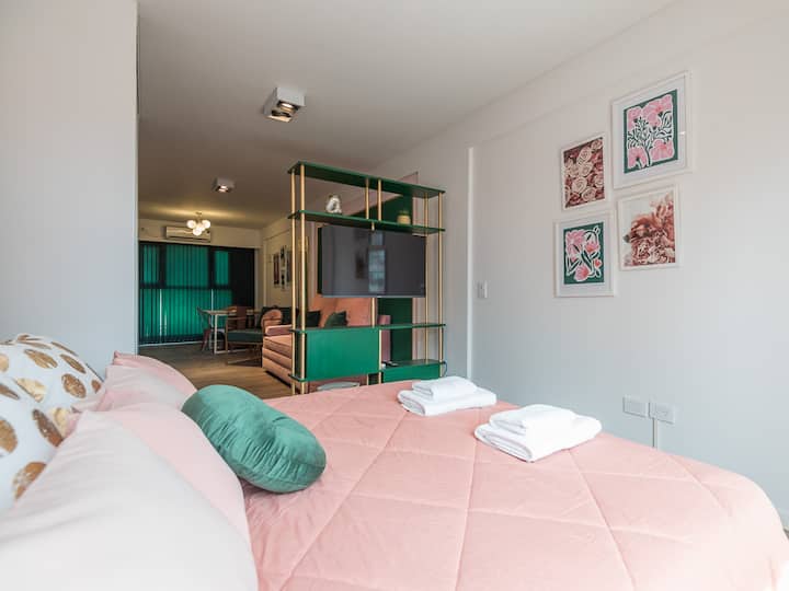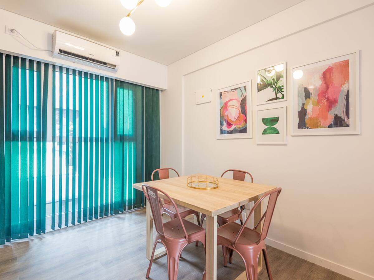 Kitnet para aluguel em Palermo, com 1 ambiente, cozinha equipada, banheiro com box e varanda. A unidade tem cama de casal, sofá-cama com carrinho e máquina de lavar. O prédio oferece academia e sauna; o acesso é feito por QR code e não há chave.