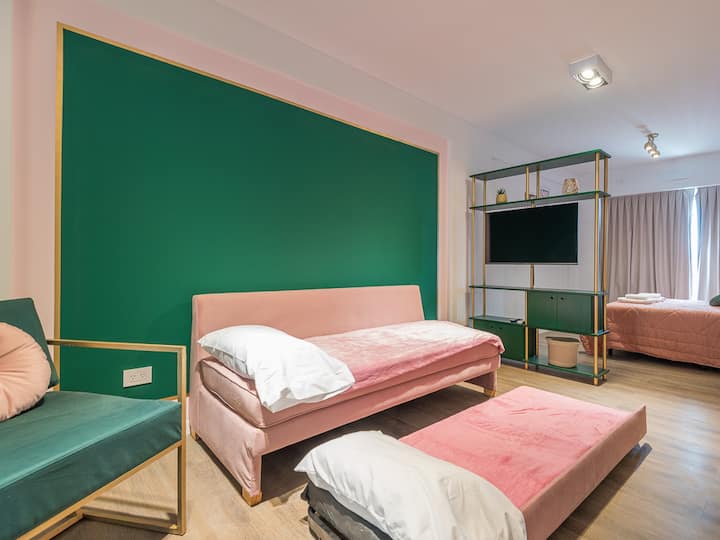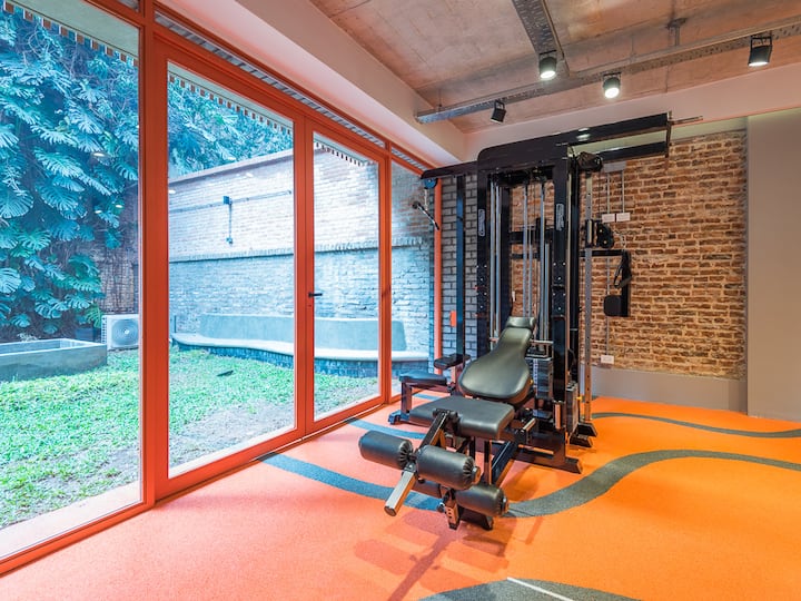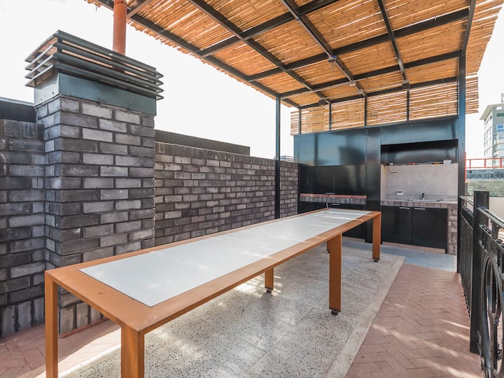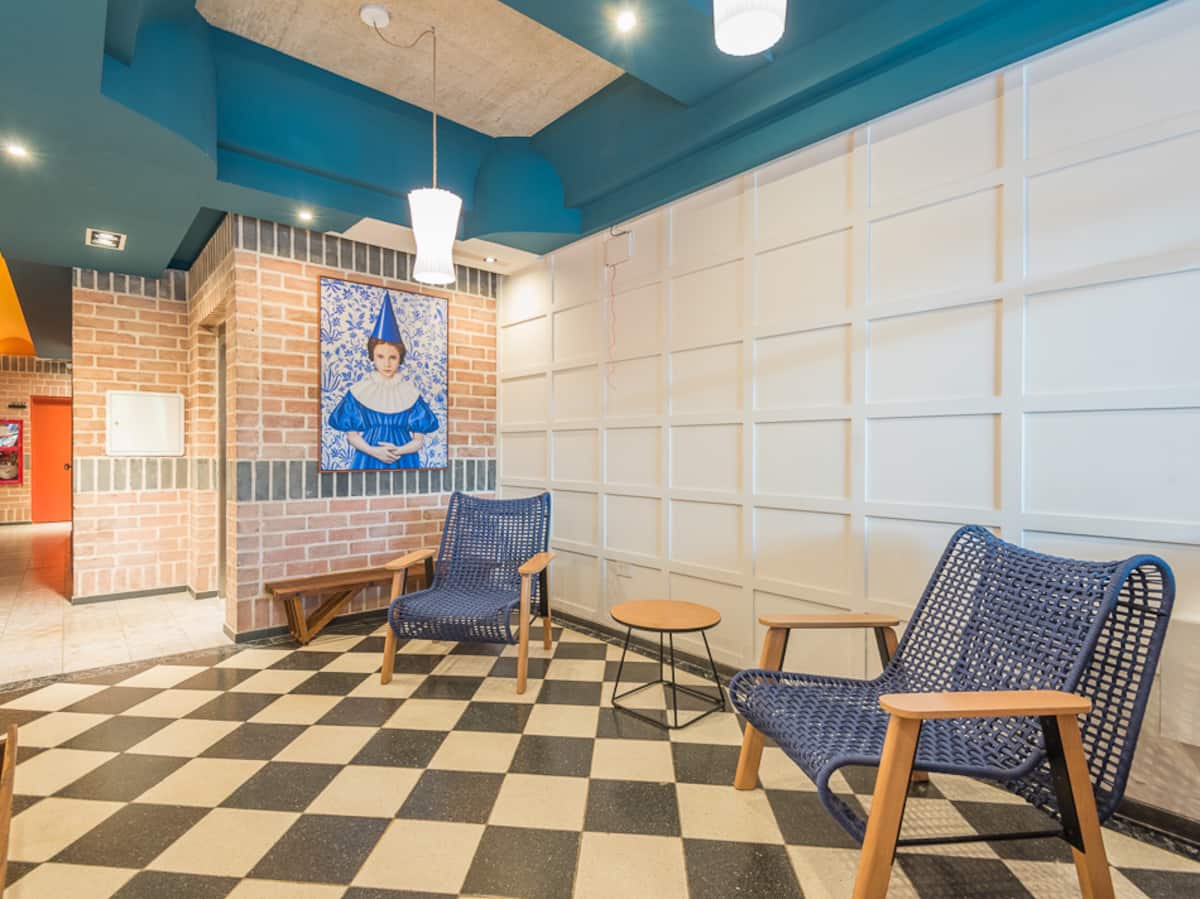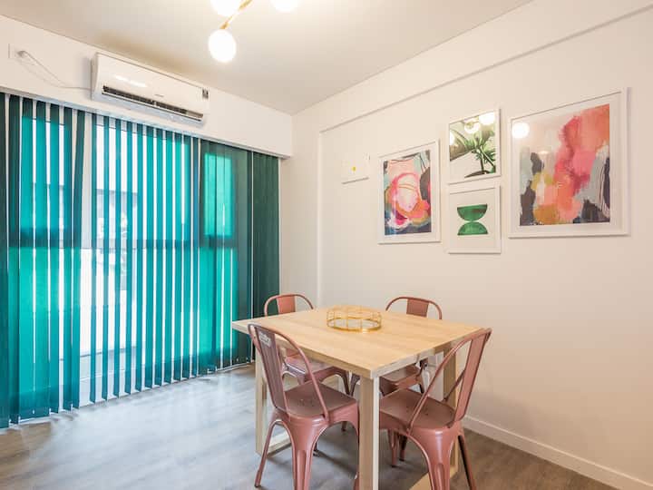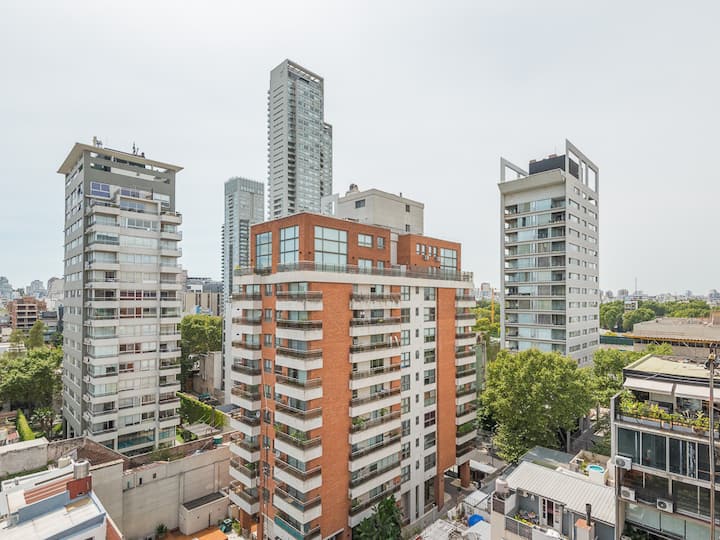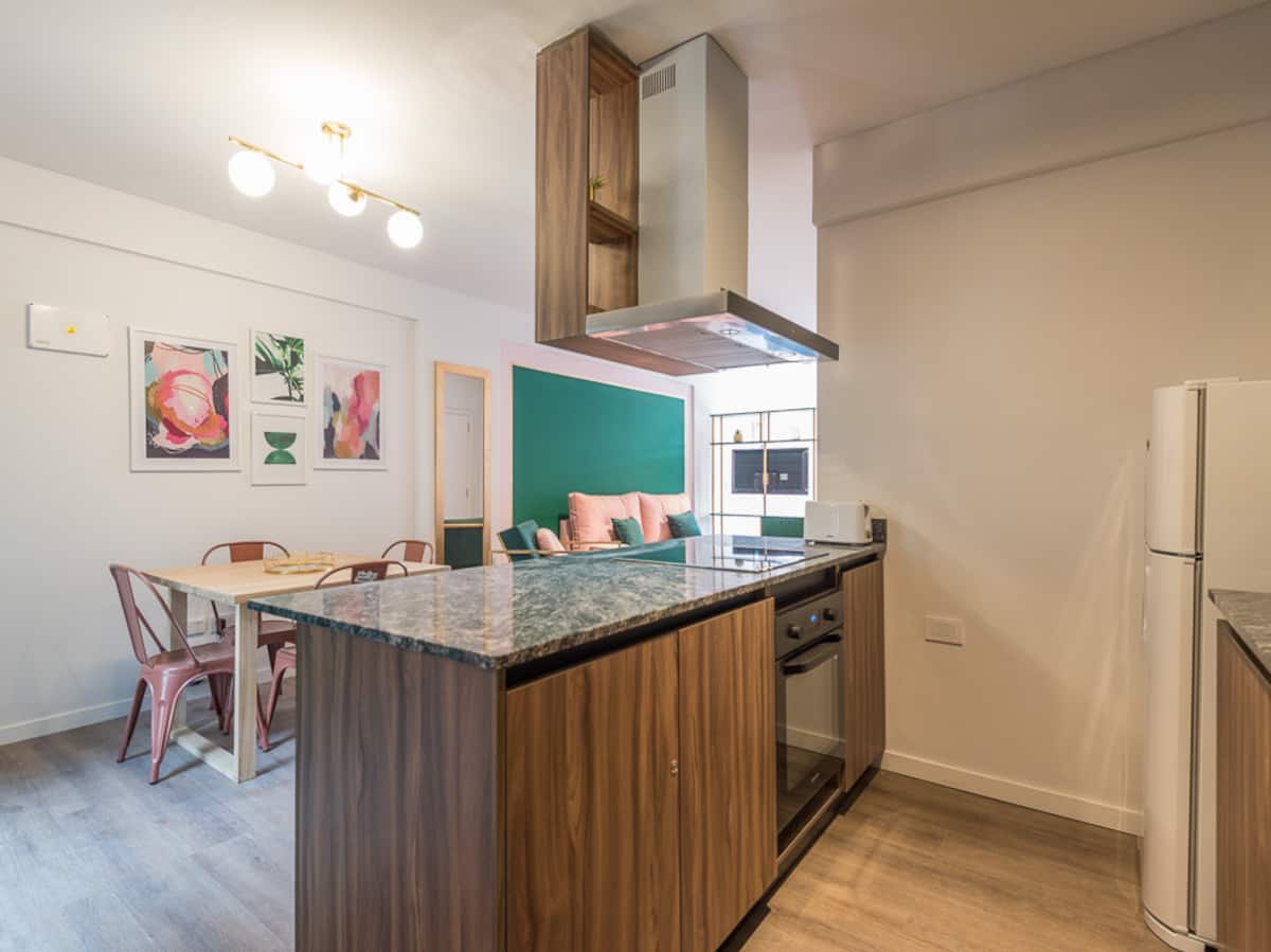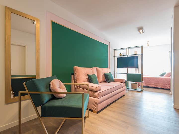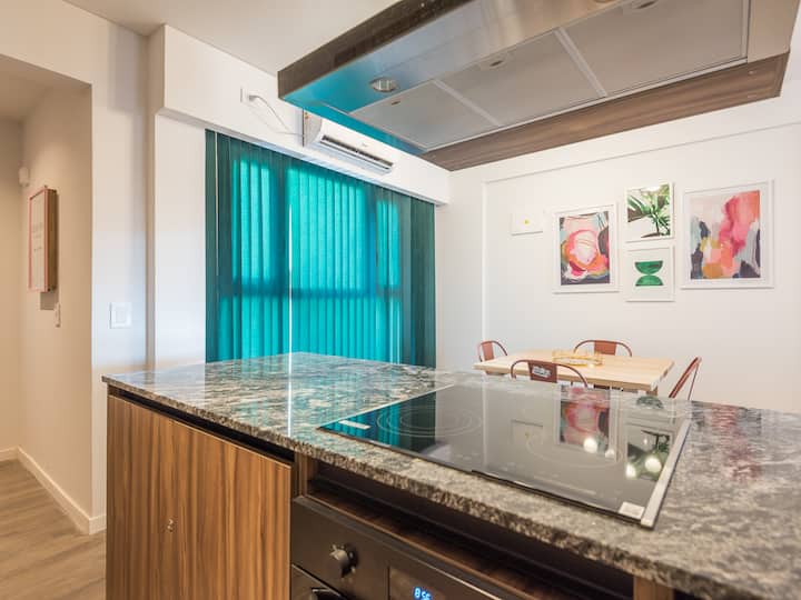 Kitnet para aluguel em Palermo, com 1 ambiente, cozinha equipada, banheiro com box e varanda. A unidade tem cama de casal, sofá-cama com carrinho e máquina de lavar. O prédio oferece academia e sauna; o acesso é feito por QR code e não há chave.