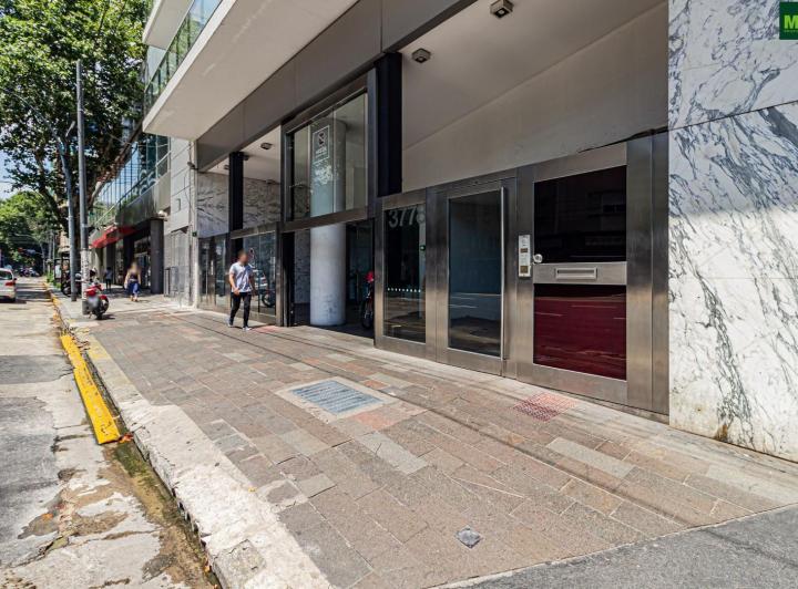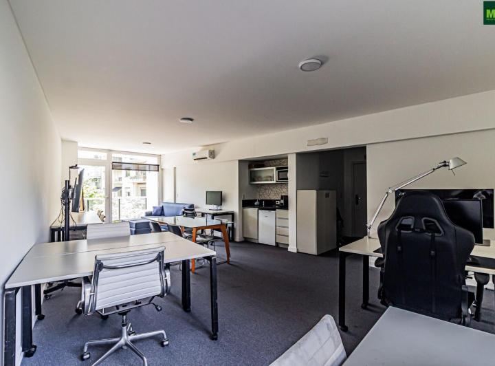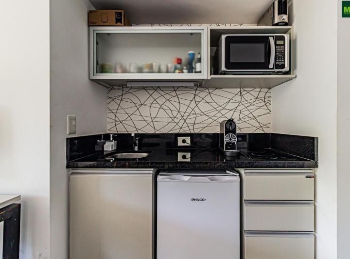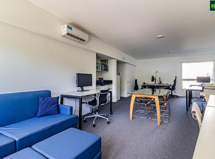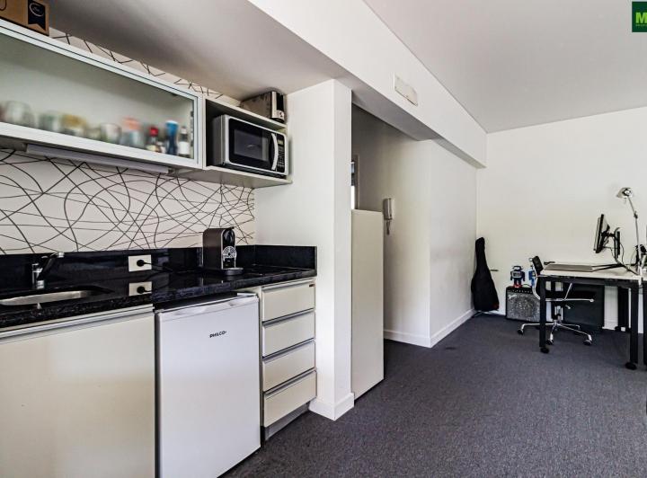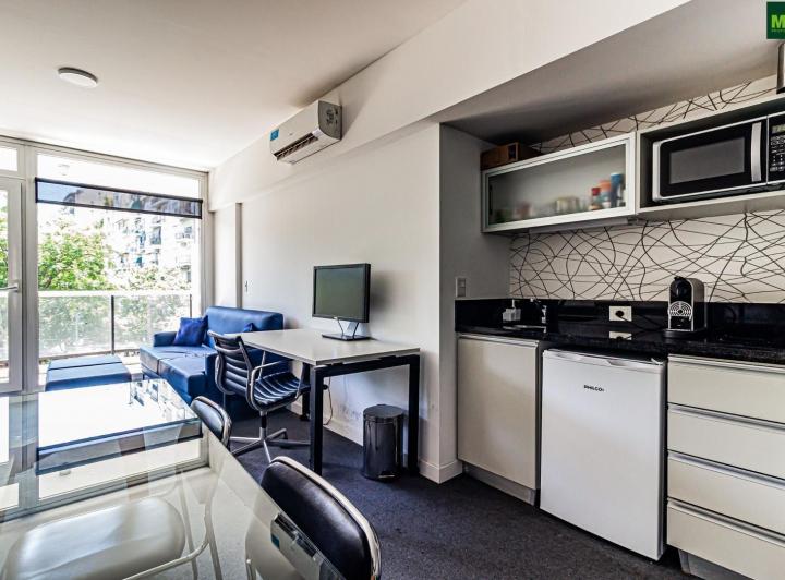 Kitnet (studio) em Palermo, com varanda de frente e vista aberta para o Jardim Botânico. A unidade fica em um edifício com 35 andares e dispõe de fogão elétrico (aneafe elétrico) e aquecimento por ar-condicionado. O prédio oferece segurança 24 horas e amenities como piscina com solário, academia, sala de pilates, spa e sauna, microcine, salão de usos múltiplos (SUM), áreas para trabalho remoto e rooftop.