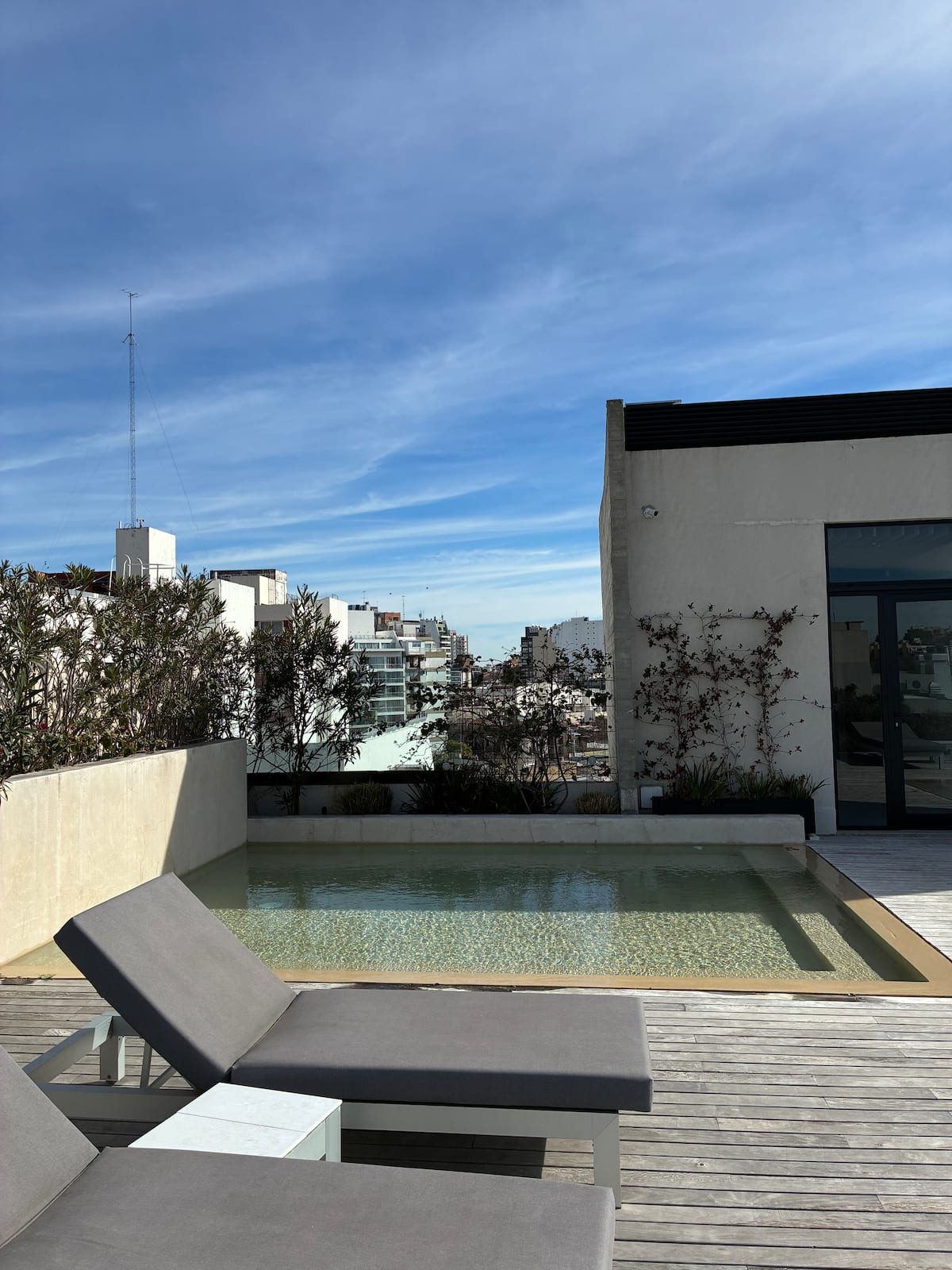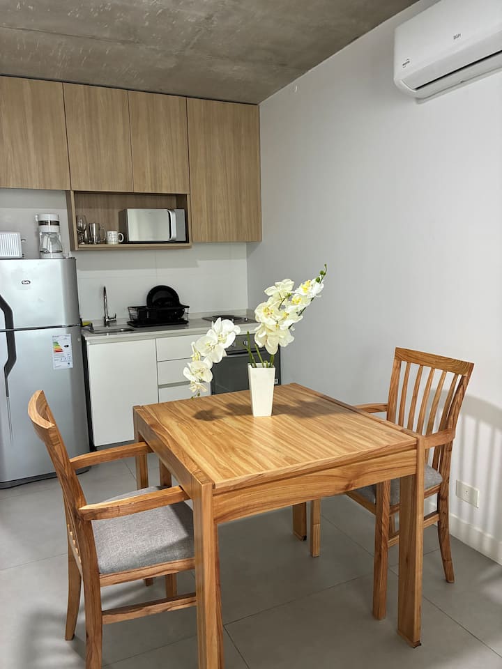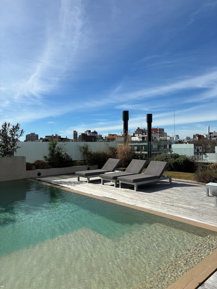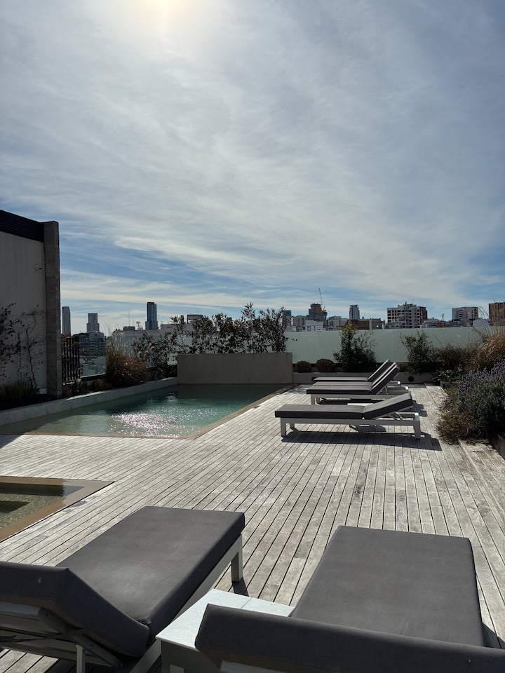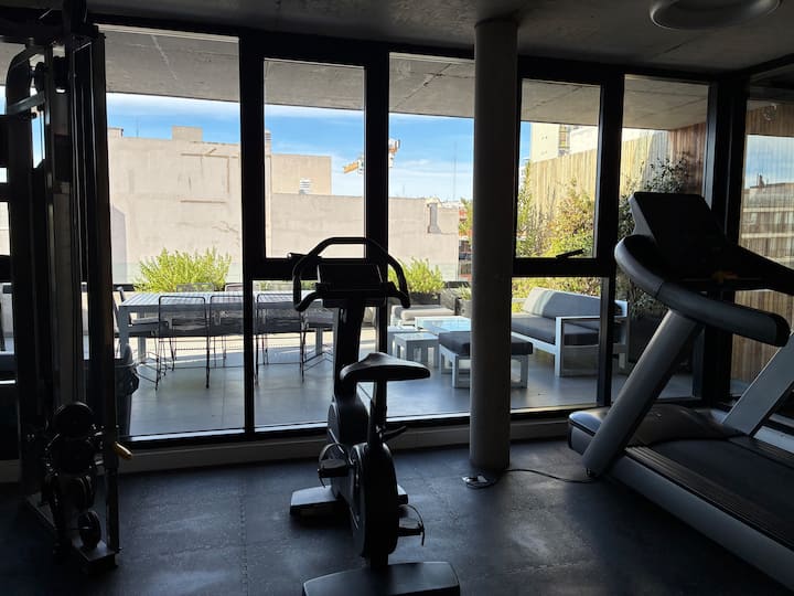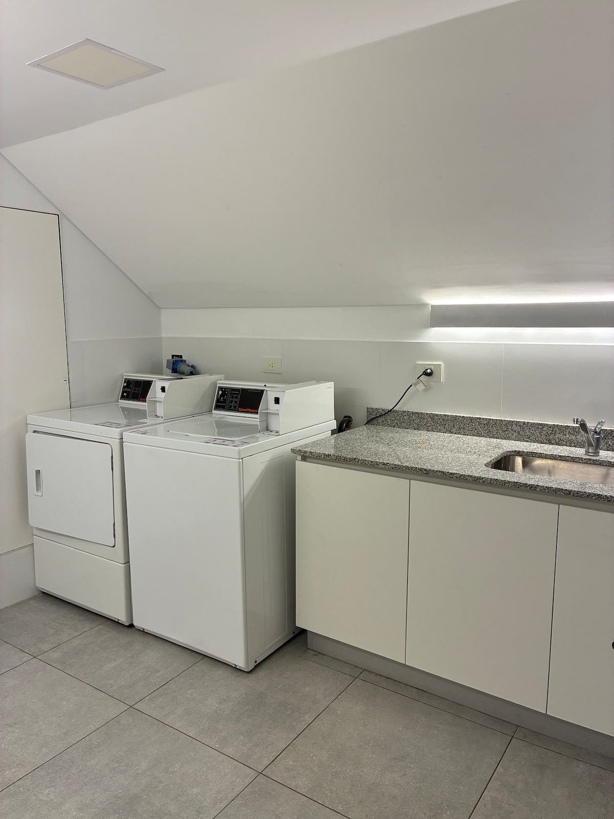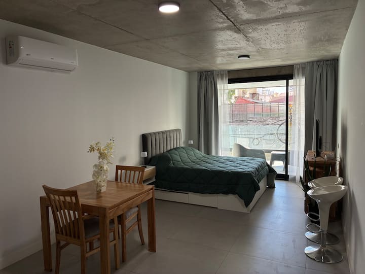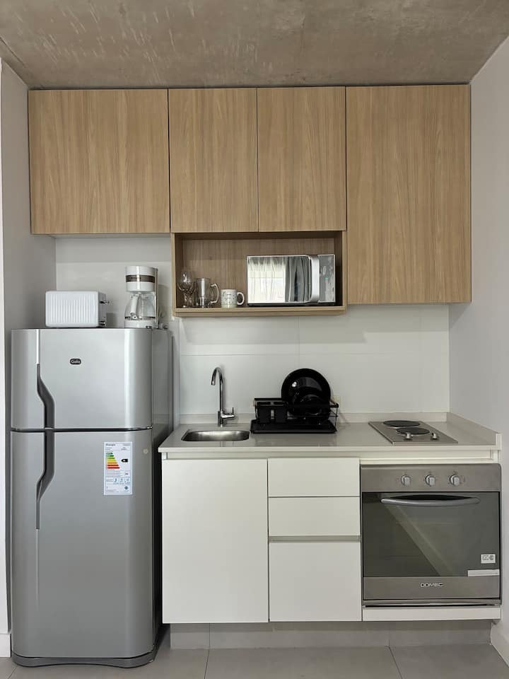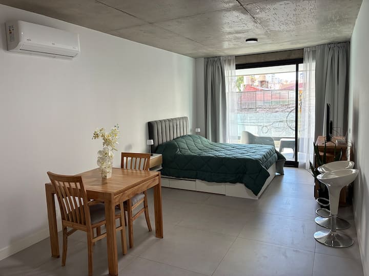 Kitnet mobiliada em Palermo, com cozinha completa, cama queen, banheiro com banheira e ar-condicionado. O imóvel conta com Wi-Fi e espaço de armazenamento. O prédio tem piscina, academia, SUM, área de churrasco, lavanderia com máquina de lavar e secar, e área externa para refeições.
