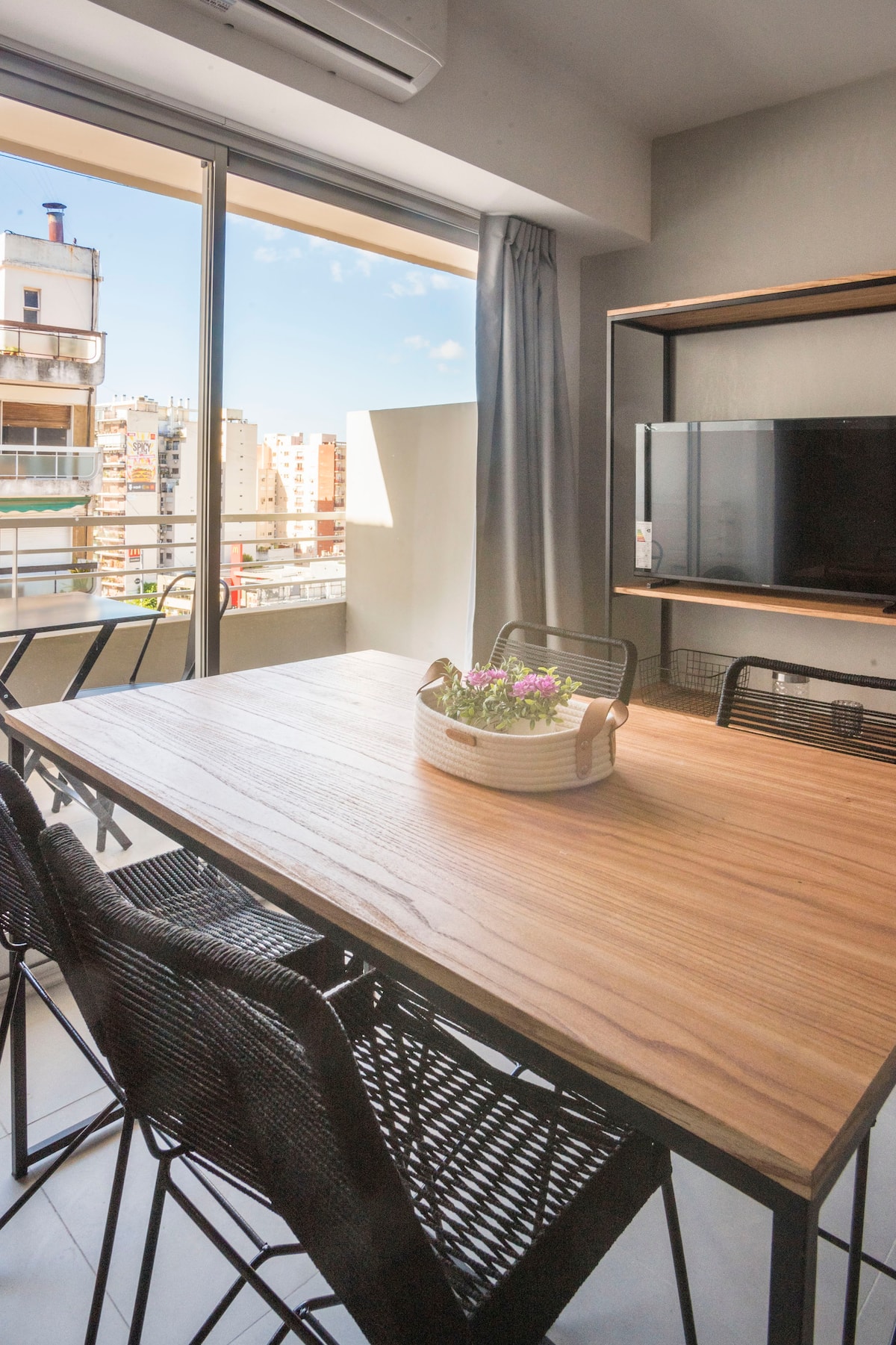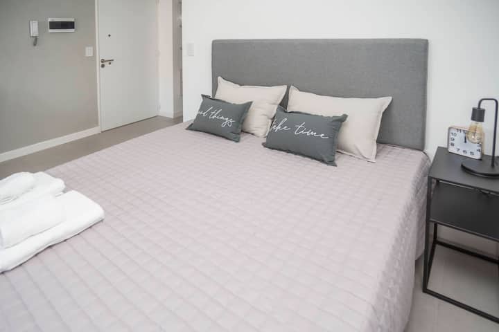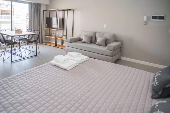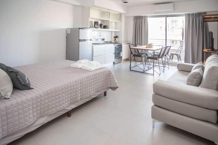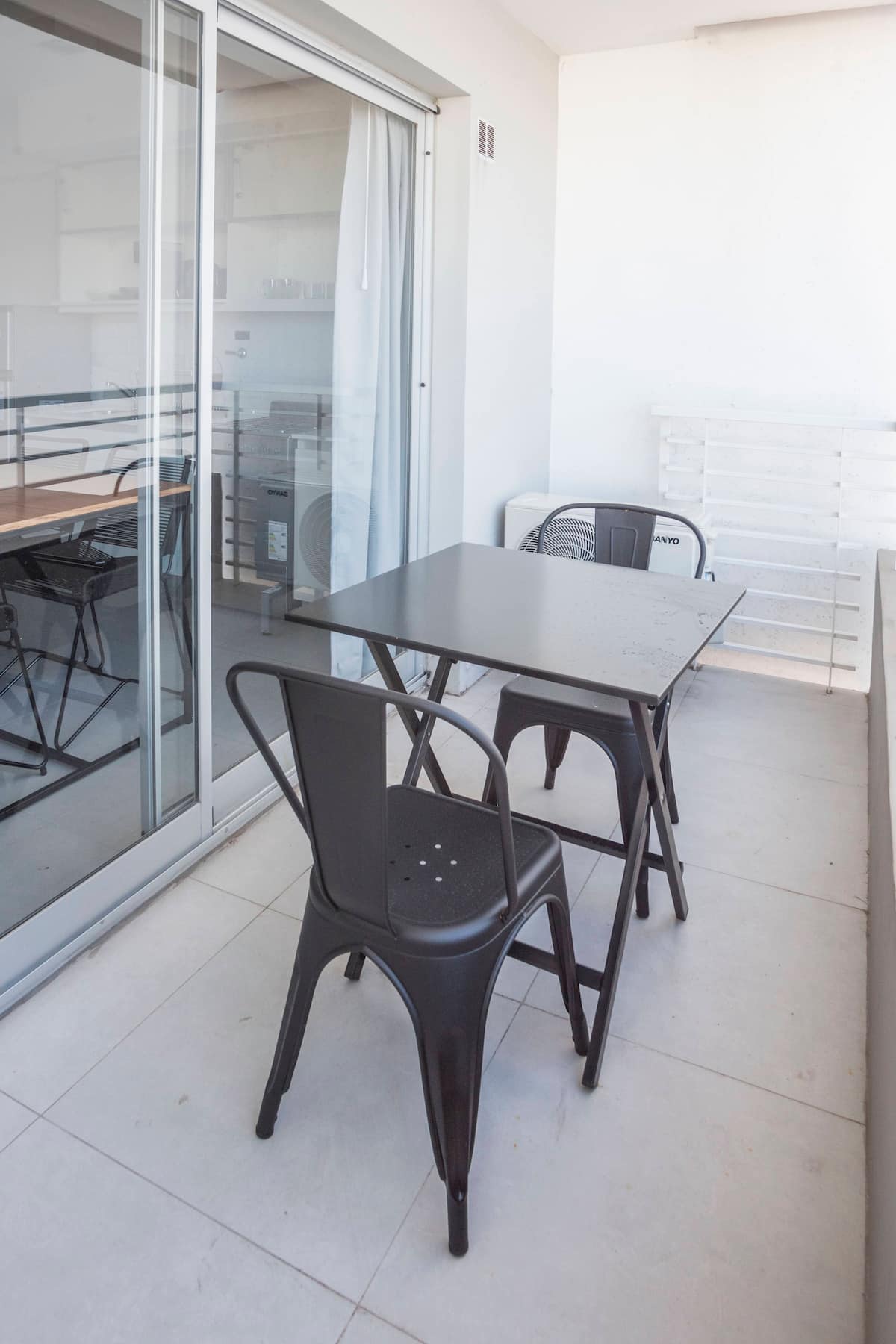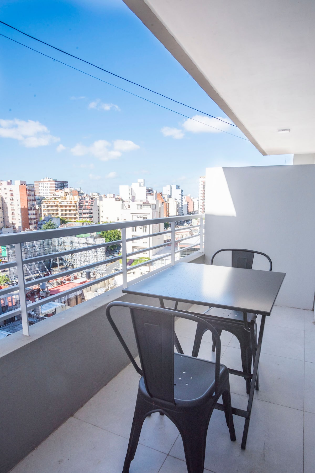 Studio de 1 ambiente com 9º andar, mobiliado e equipado para 3 hóspedes. Cama de casal de 140 cm e sofá-cama para a terceira pessoa. Água quente central com ar-condicionado quente/frio e varanda. Acesso à piscina e ao solarium no 13º andar, lavanderia no subsolo e área de ginástica.