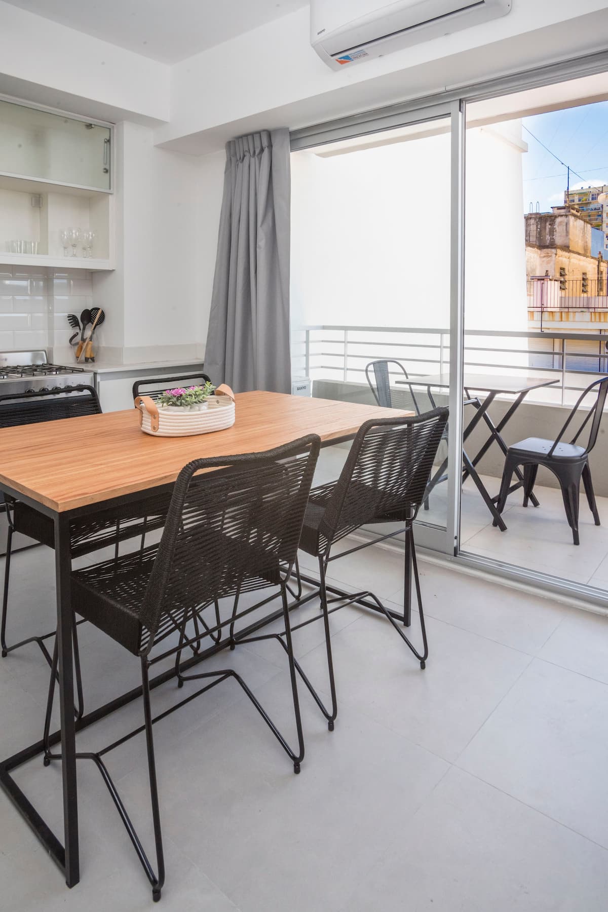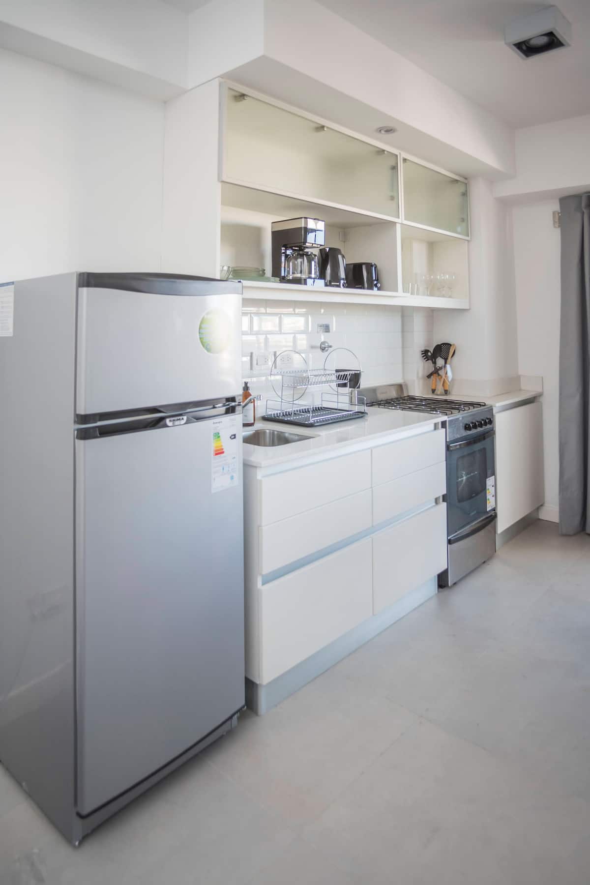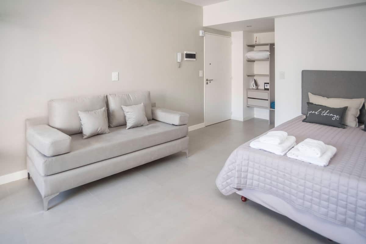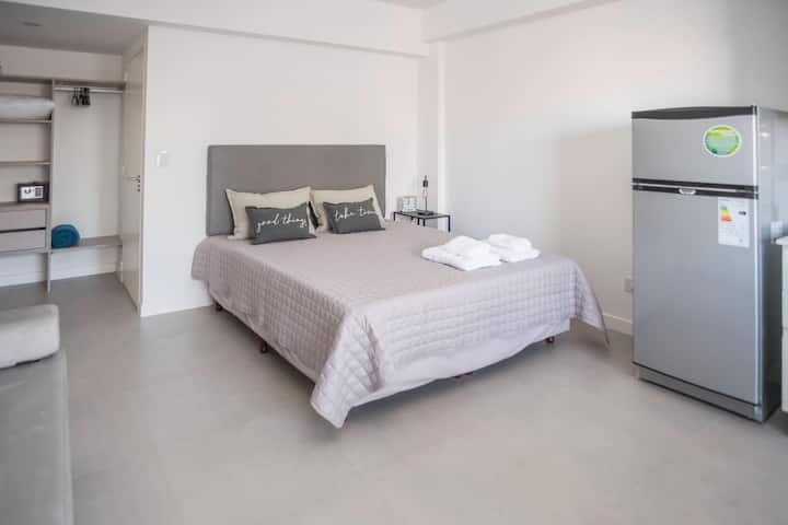 Studio de 1 ambiente com 9º andar, mobiliado e equipado para 3 hóspedes. Cama de casal de 140 cm e sofá-cama para a terceira pessoa. Água quente central com ar-condicionado quente/frio e varanda. Acesso à piscina e ao solarium no 13º andar, lavanderia no subsolo e área de ginástica.