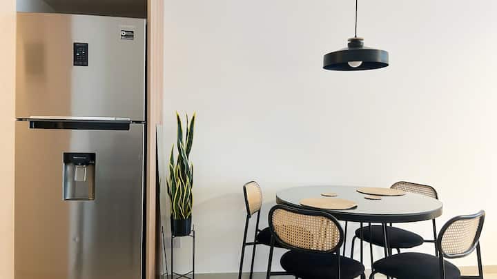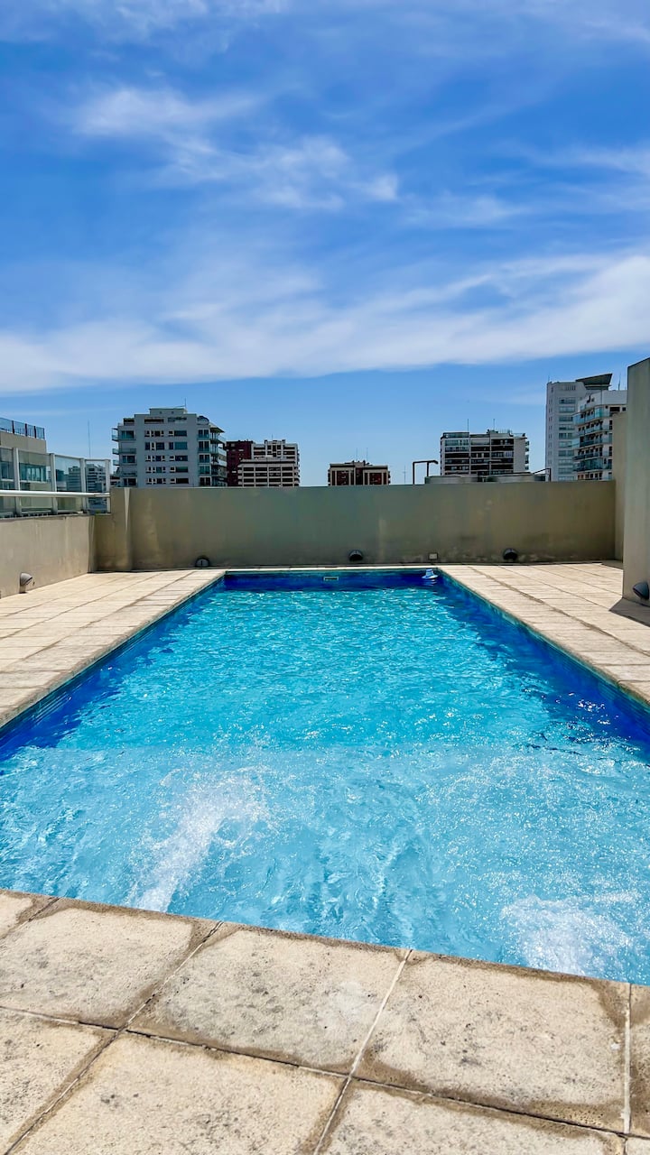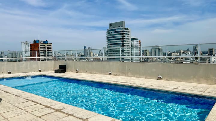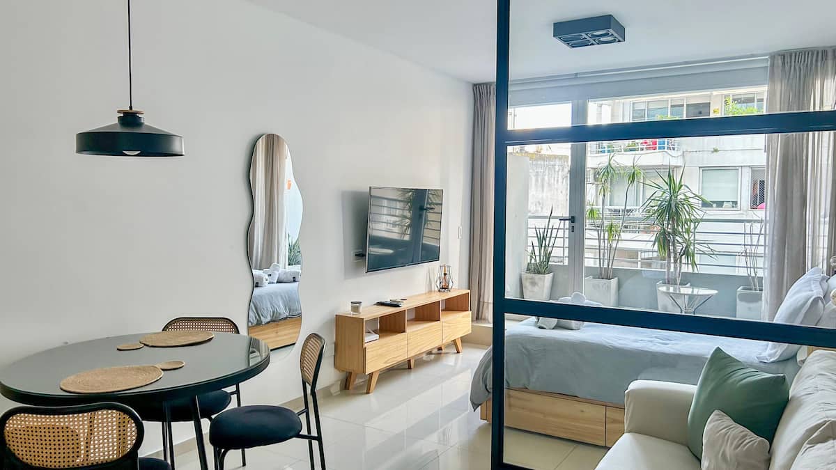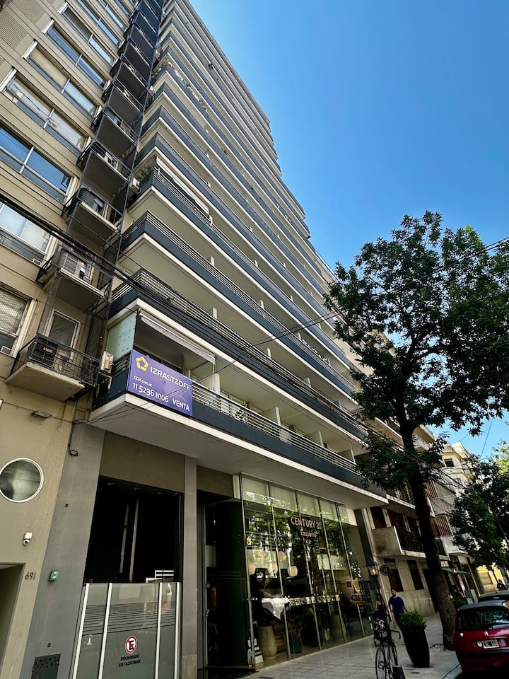 Apartamento tipo kitnet em Palermo, com acesso por elevador. O imóvel tem cozinha com cooktop cerâmico, micro-ondas, forno elétrico, geladeira, cafeteira Nespresso e torradeira. Inclui sala com sofá, TV smart de 50 polegadas e Wi-Fi. Conta com banheiro com toalhas, shampoo, sabonete e secador de cabelo, além de mesa para 4 pessoas e varanda.