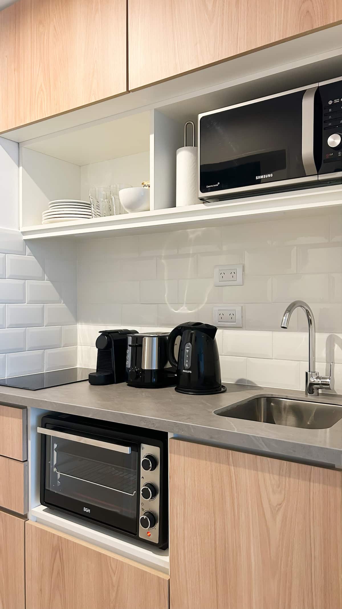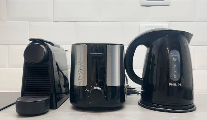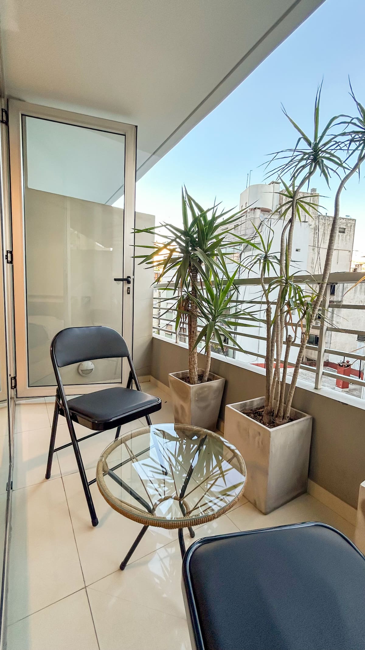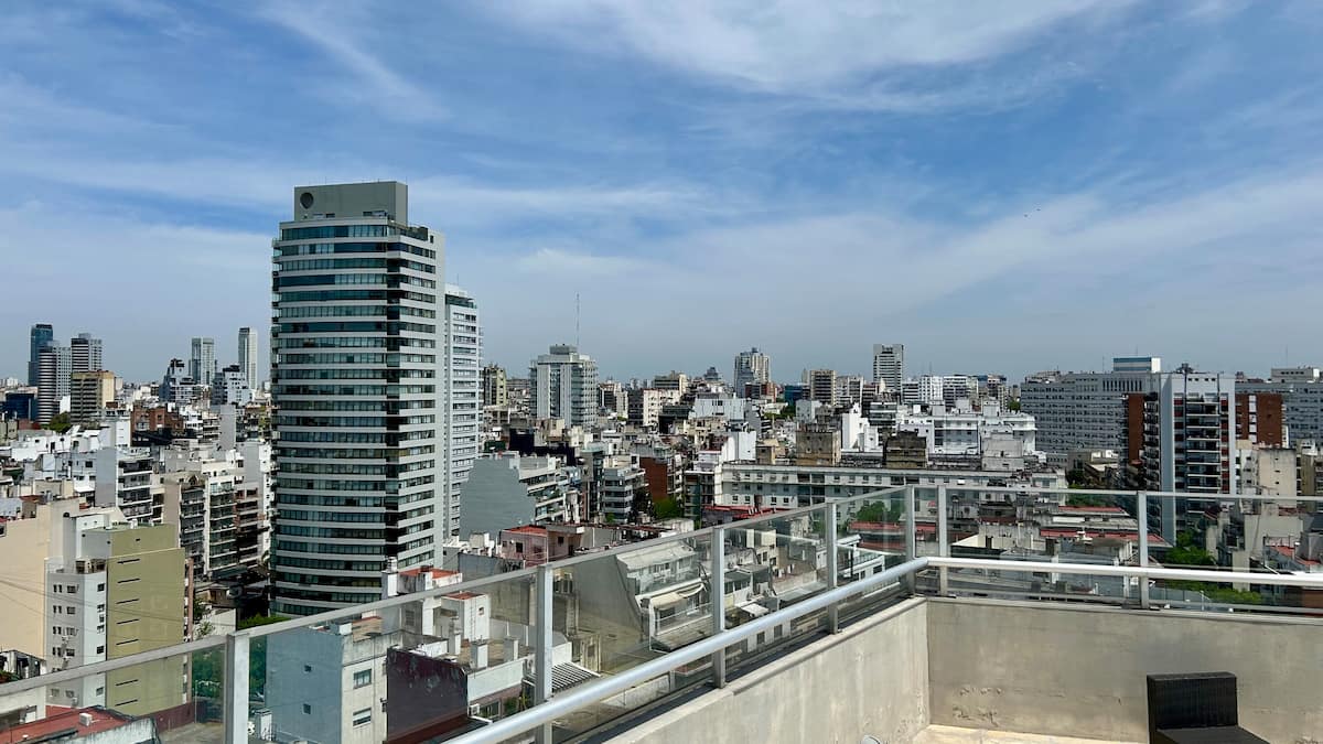 Apartamento tipo kitnet em Palermo, com acesso por elevador. O imóvel tem cozinha com cooktop cerâmico, micro-ondas, forno elétrico, geladeira, cafeteira Nespresso e torradeira. Inclui sala com sofá, TV smart de 50 polegadas e Wi-Fi. Conta com banheiro com toalhas, shampoo, sabonete e secador de cabelo, além de mesa para 4 pessoas e varanda.