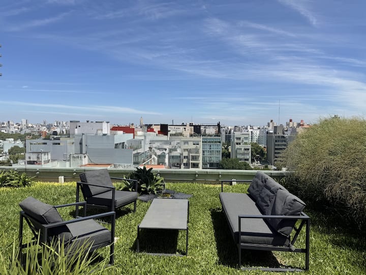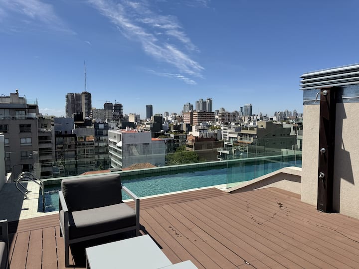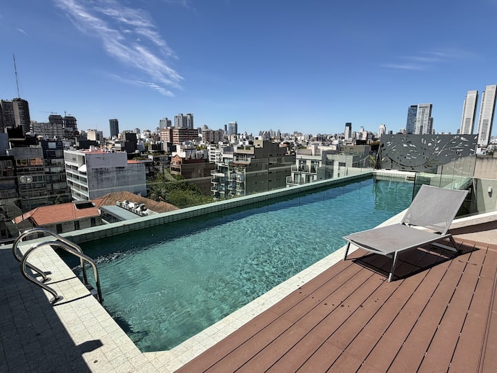 Kitnet em Palermo Hollywood, com varanda privativa e vista aberta. Cozinha equipada, banheiro moderno e ar-condicionado quente/frio. O prédio tem jardim e piscina externa na cobertura, além de segurança 24/7 na recepção.